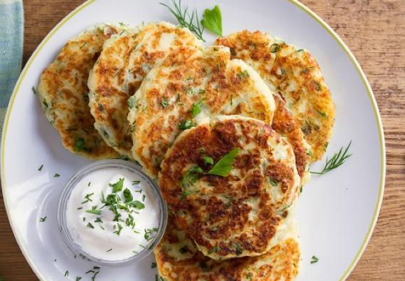 Mezclar el queso con la harina y huevos. Formar los latkes y freir en suficiente aceite.