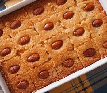 Cortar la Basbousa en cuadrados para presentar en platos individuales y regar con el jarabe recién preparado.