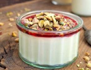 Se pone todo a hervir en el fuego y moviendo todo el tiempo hasta que este espeso. Se saca del fuego y se pone en un molde o en vasos individuales. Se deja enfriar y se cubre con un papel transparente como una lamina para que no forme costra. A las tres o cuatro horas se saca de la heladera y se quita el papel y se espolvorea con pistachos molidos y coco molido y se pone granadina encima. Se corta en cuadrados y se sirve