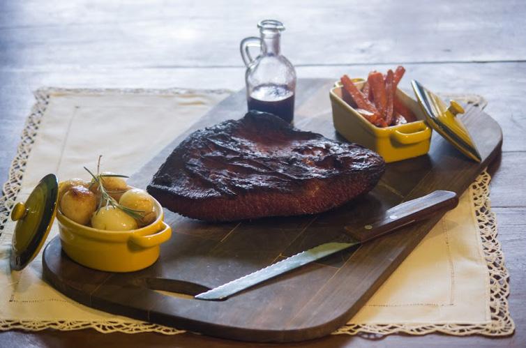Ingredientes para la cocción: 1 cda. de ají molido, 6 cdas. de pimentón dulce, 3 dientes de ajo aplastados, 2 ramitas de romero, 1 litro de vino tinto, 1 vaso de gaseosa cola.