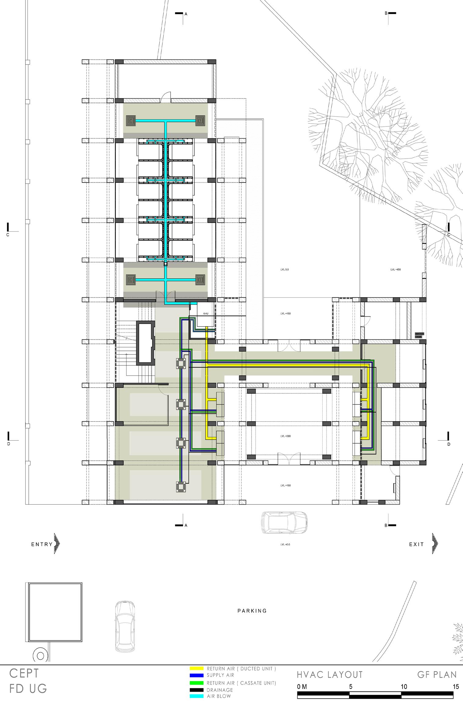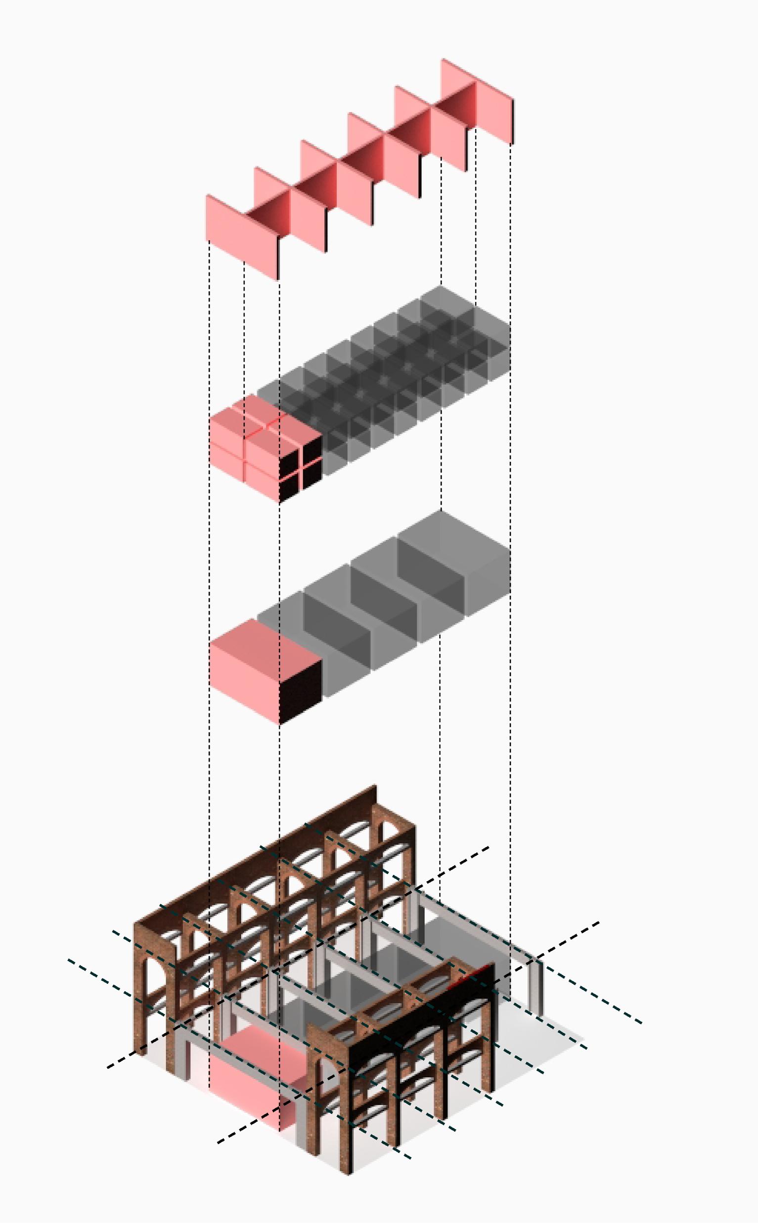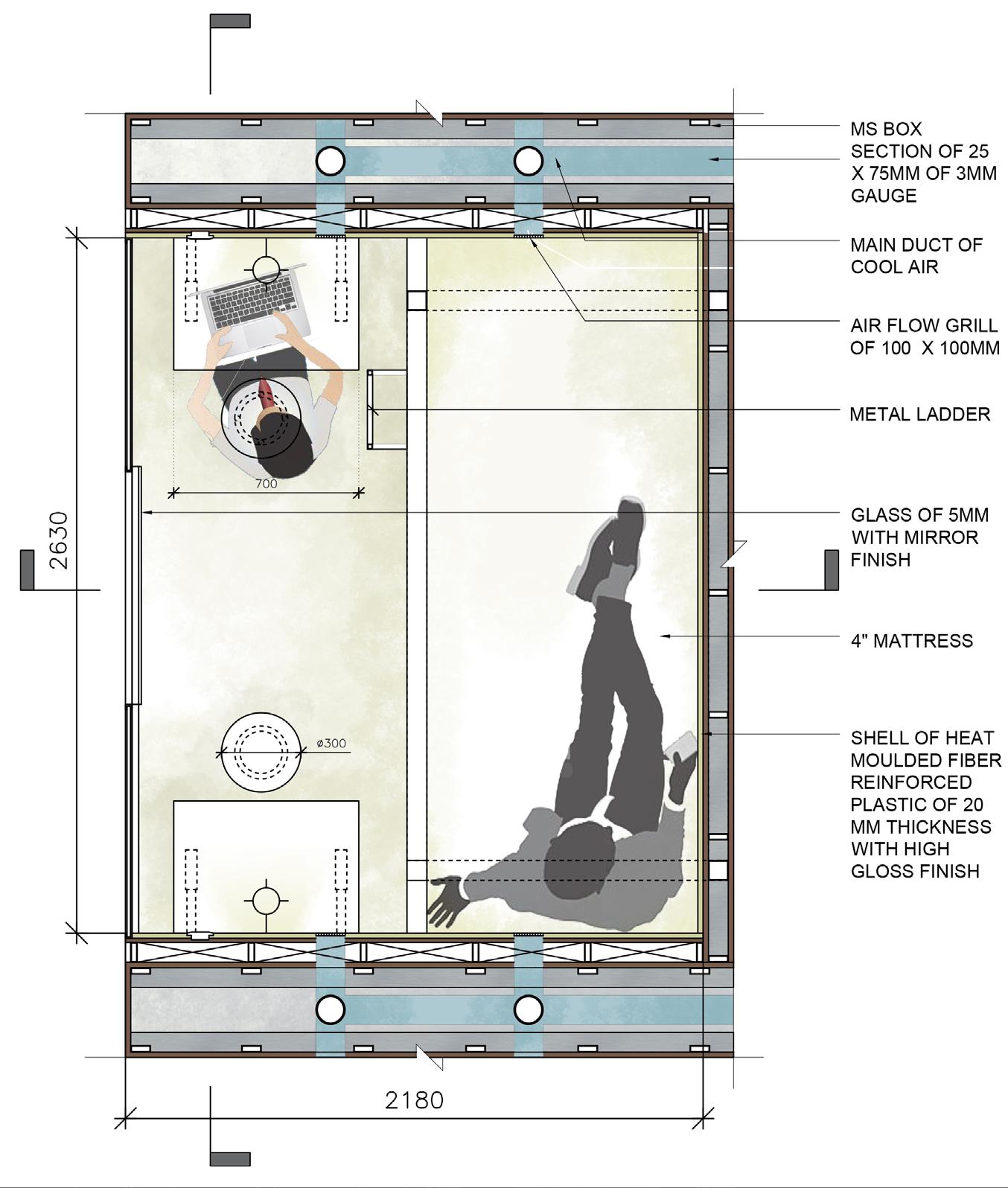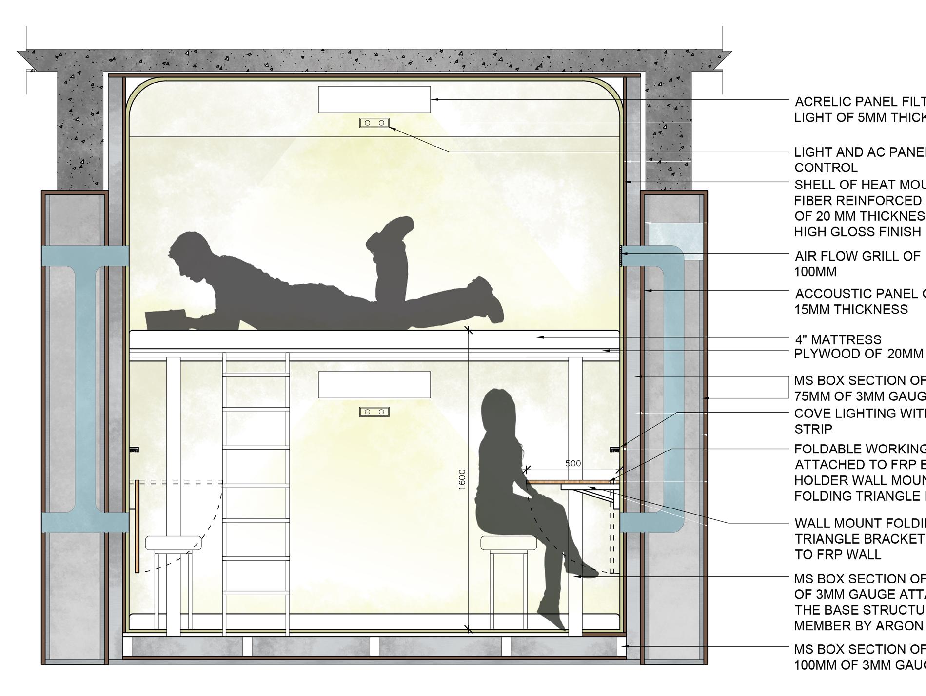 The site has a very strong structural grid which creates cubical modules. The generic concept of pod hotel also resonates with the modular designs. Hence, the form, dimensions, and organization of the Pod module are derived from the existing structural grid, keeping the integrity of the existing structure and materiality intact.