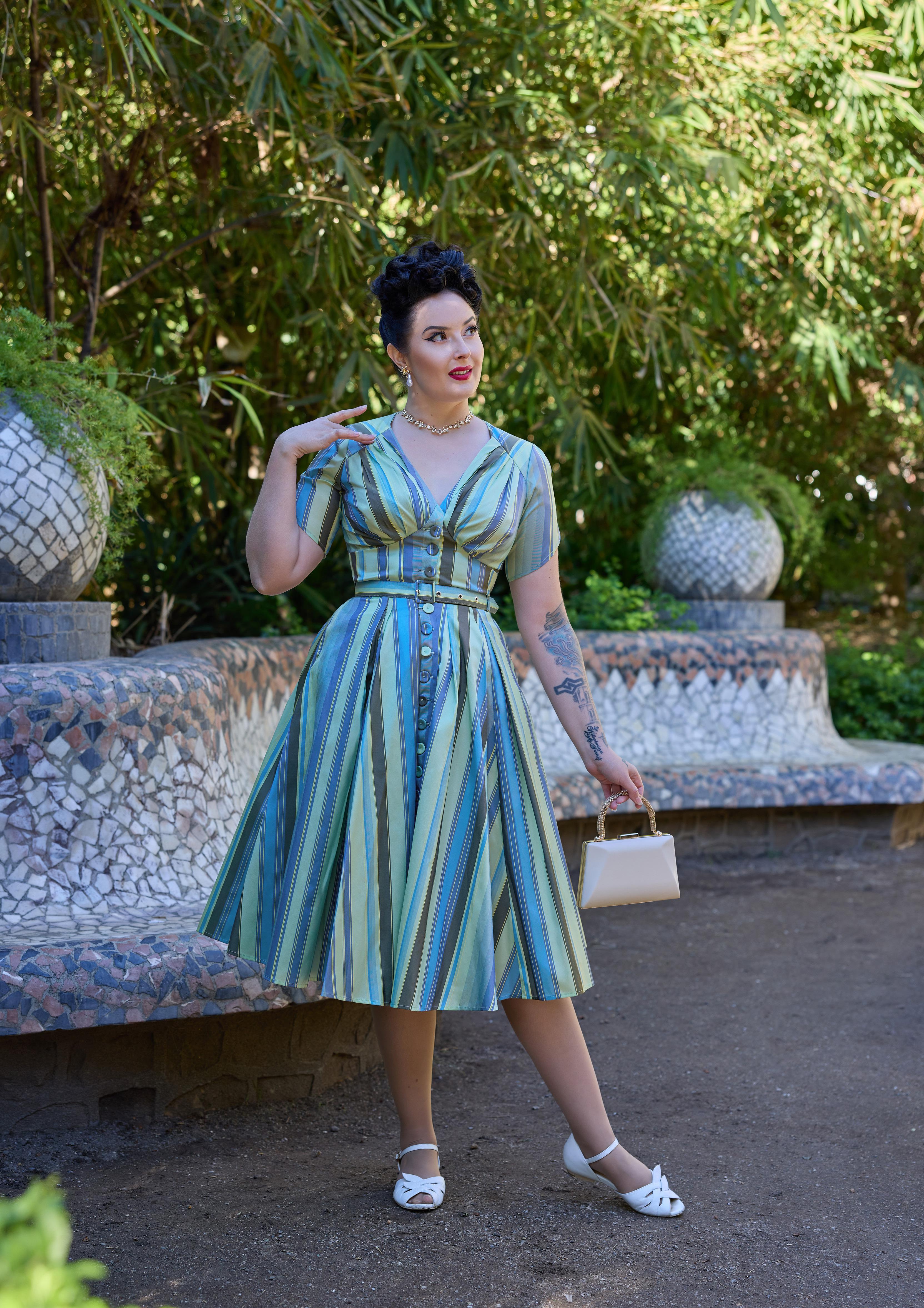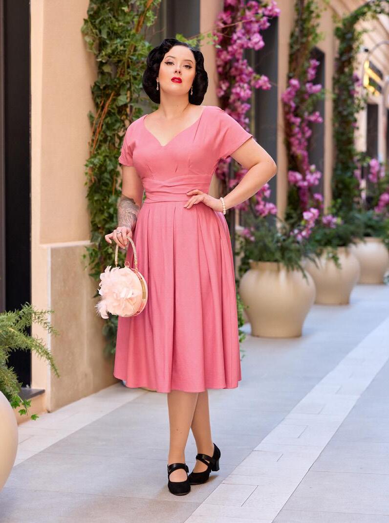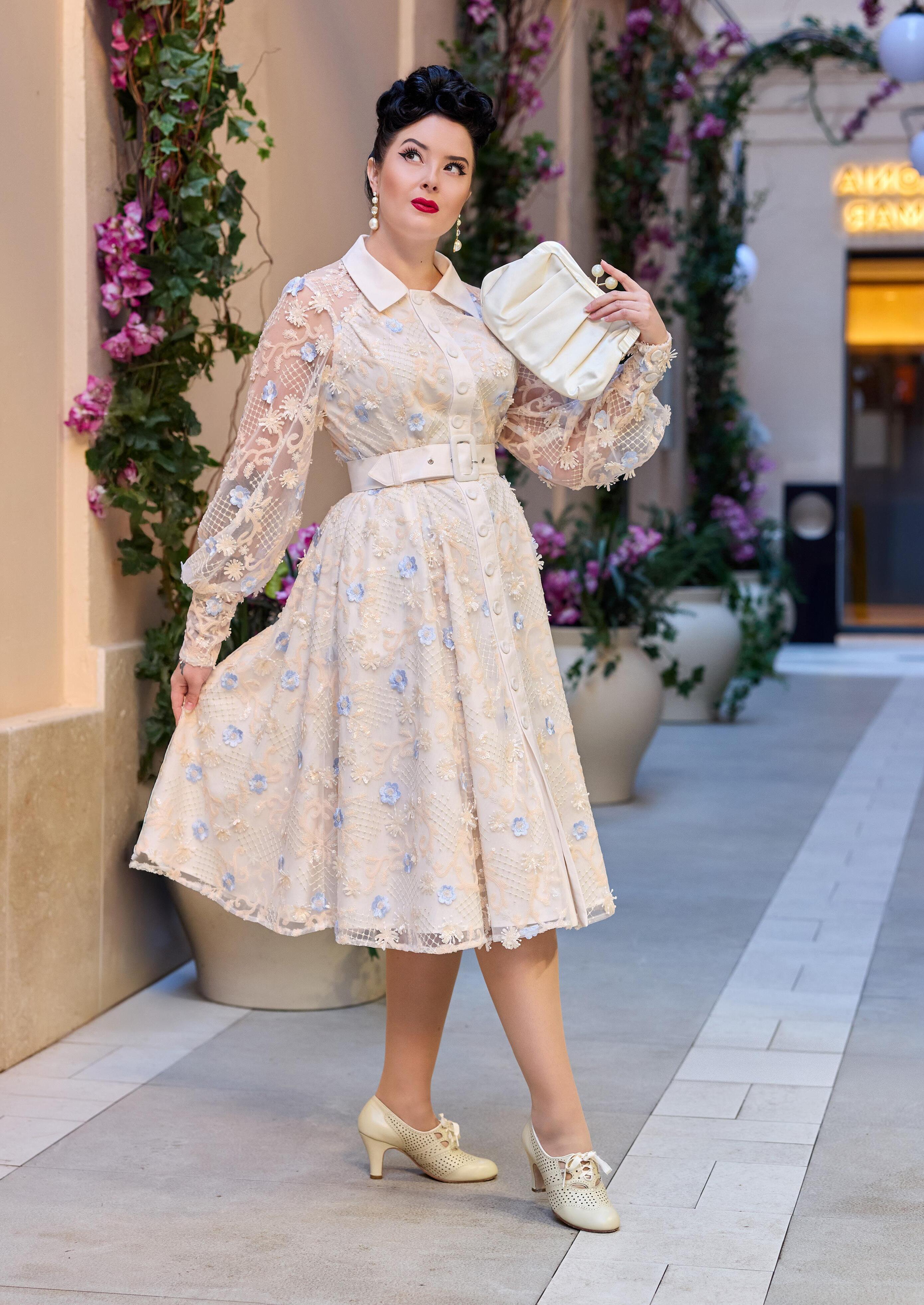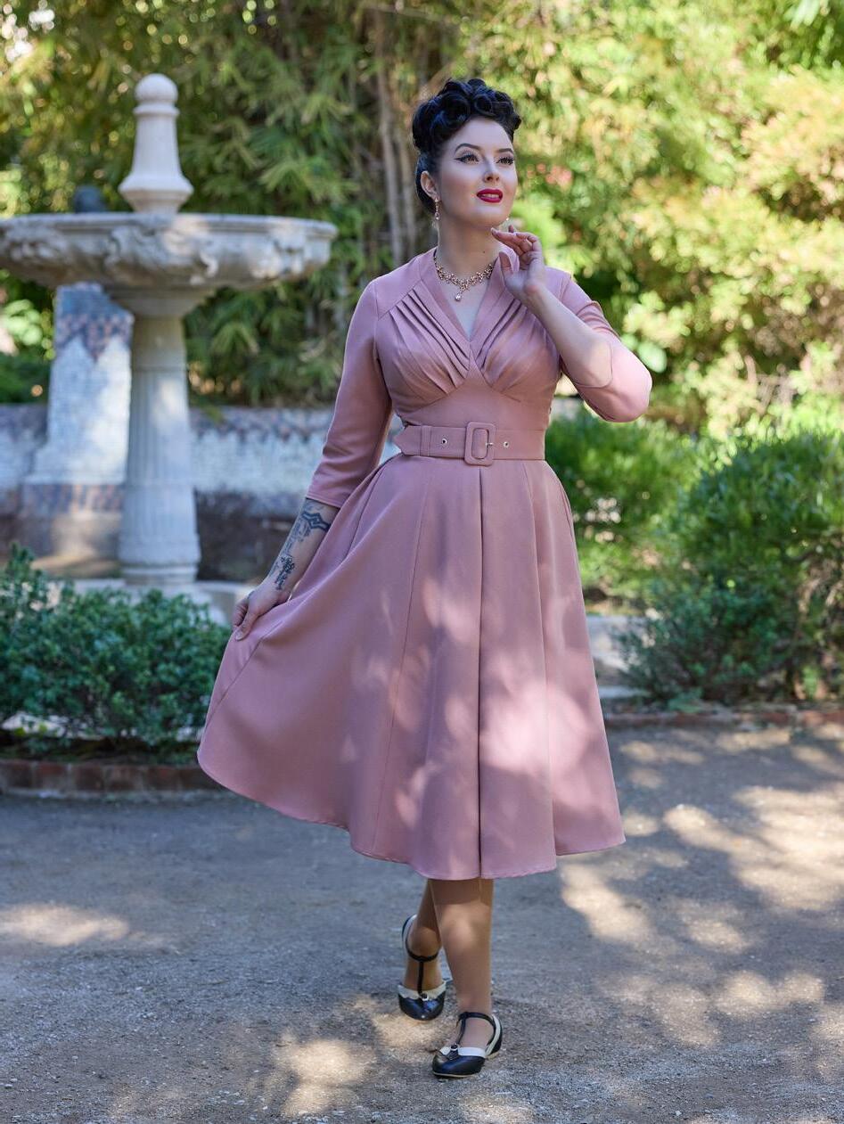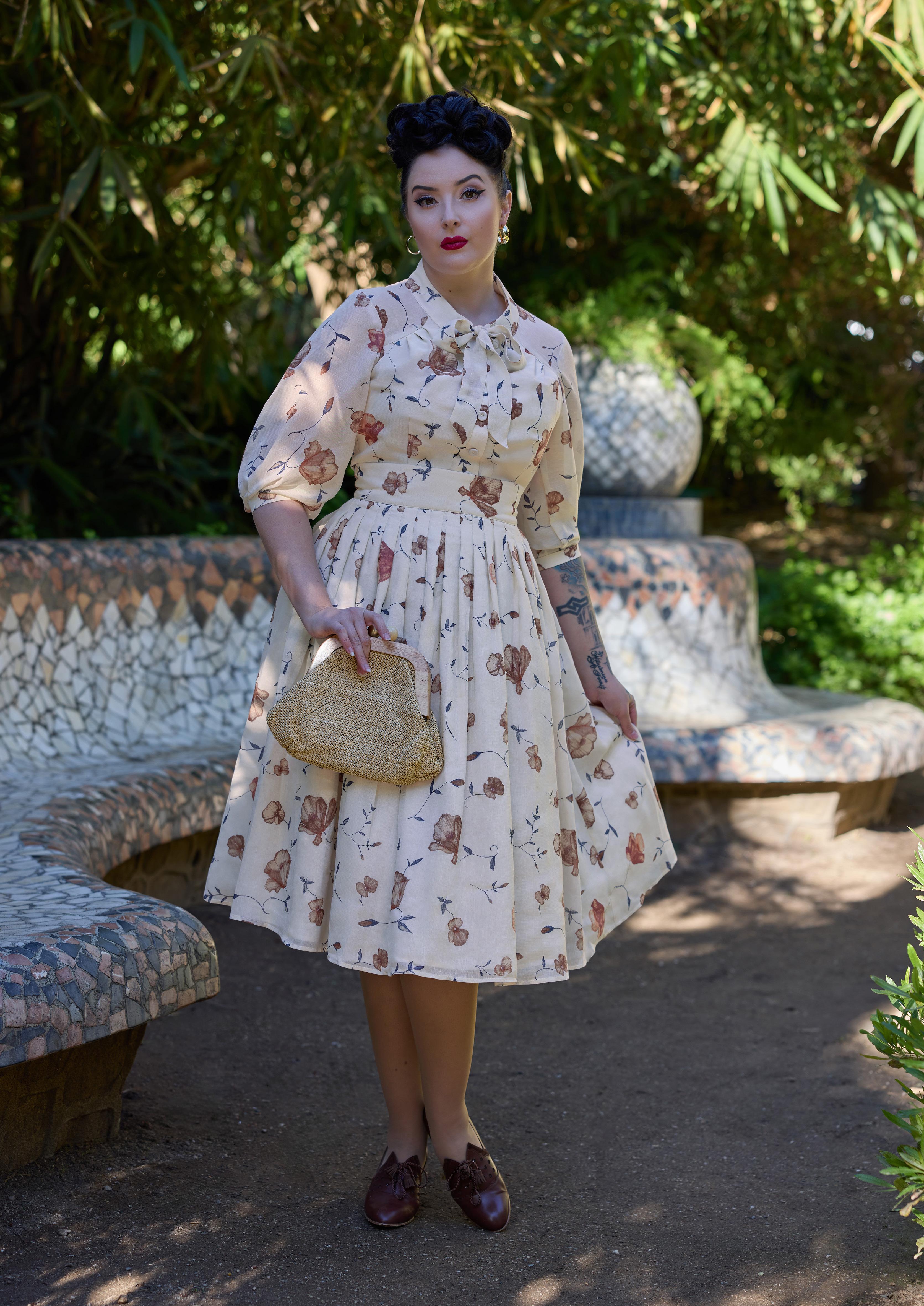 A nostalgic tea dress with a 1940s-inspired pleated bust, capturing vintage charm and the timeless femininity of Miss Candyfloss.