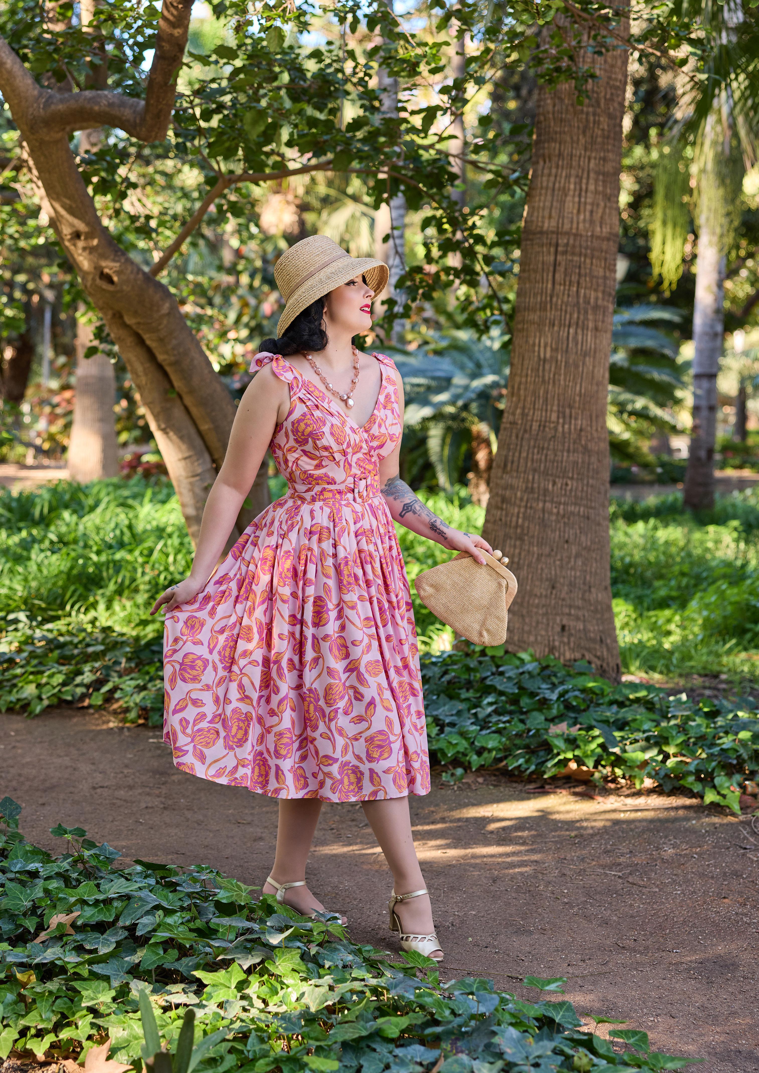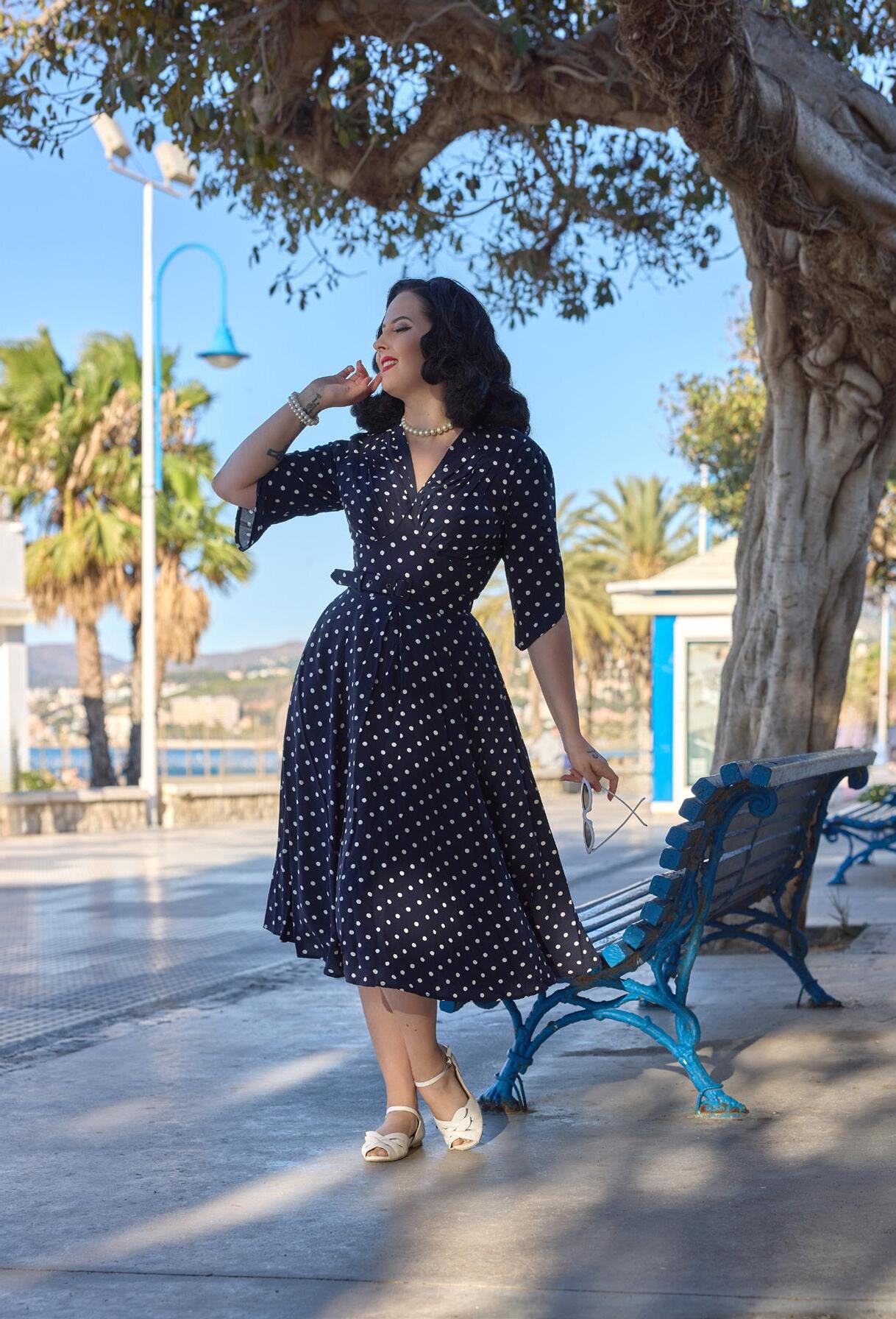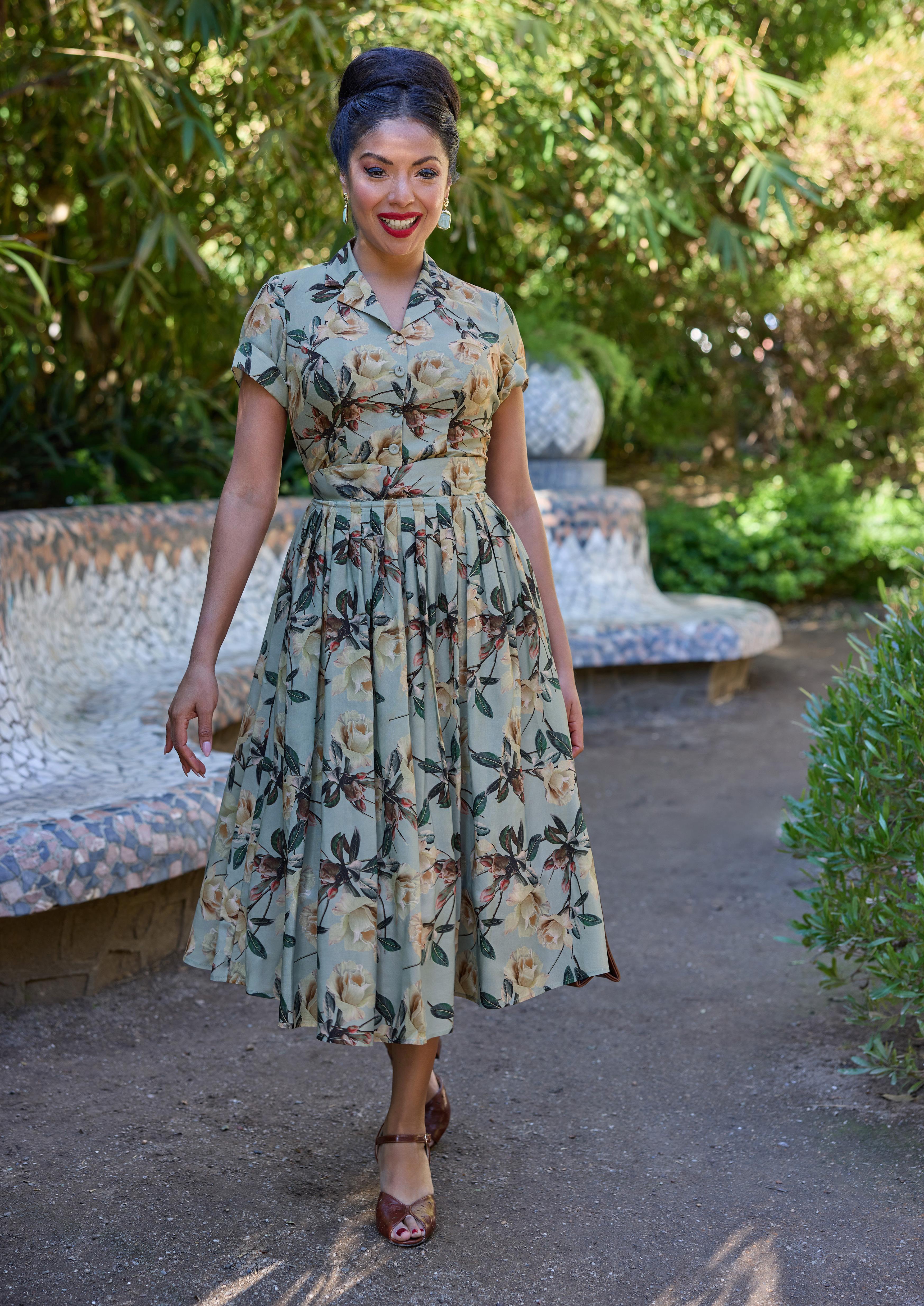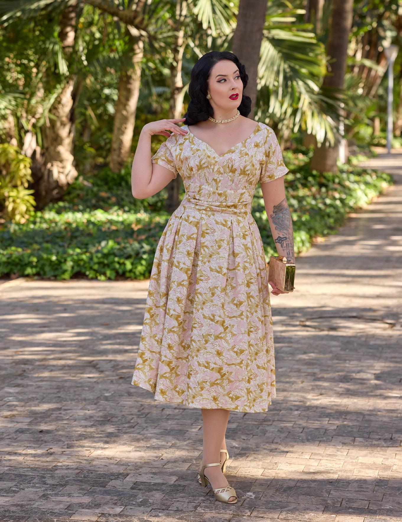 A nostalgic tea dress with a 1940s-inspired pleated bust, capturing vintage charm and the timeless femininity of Miss Candyfloss.
