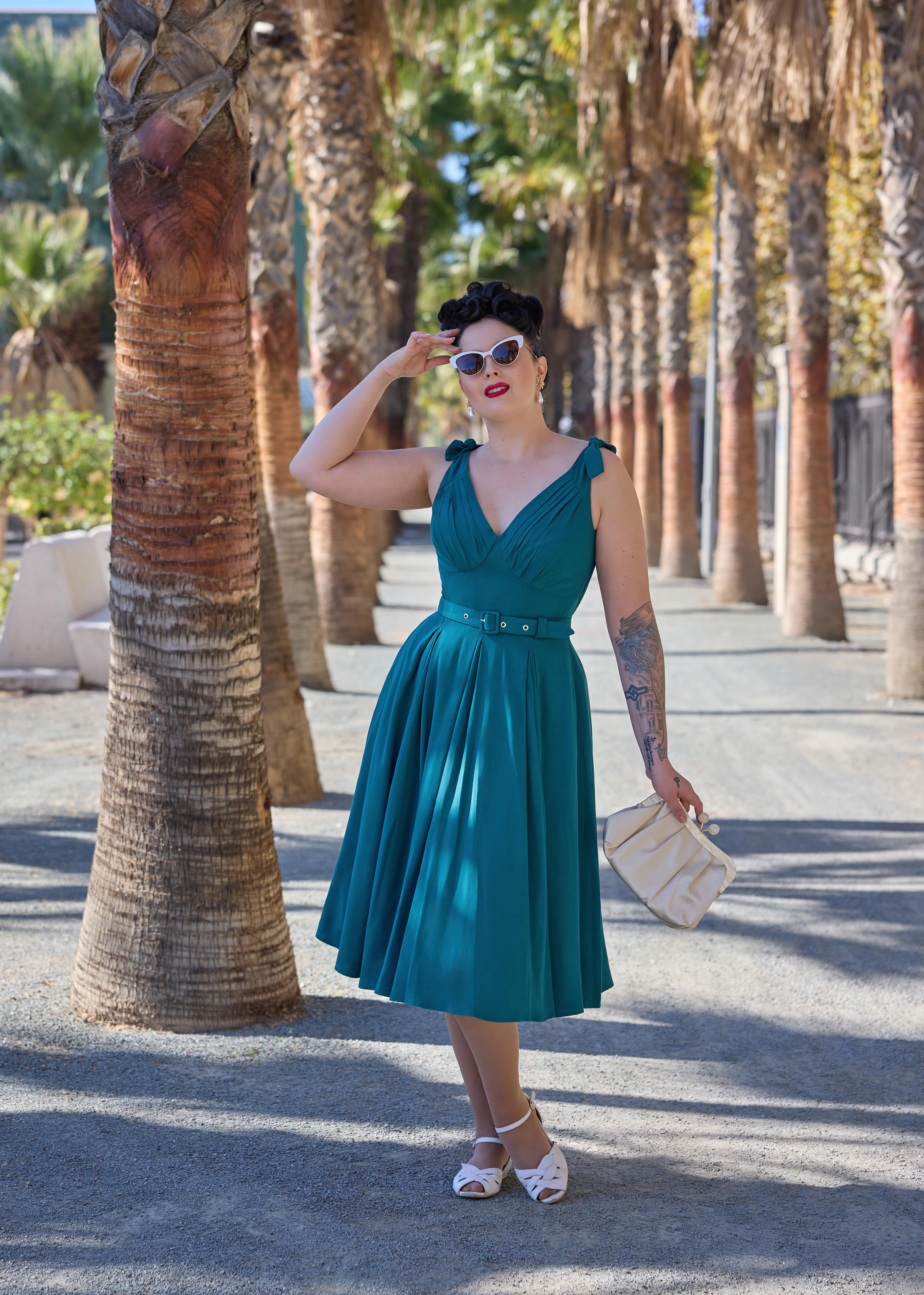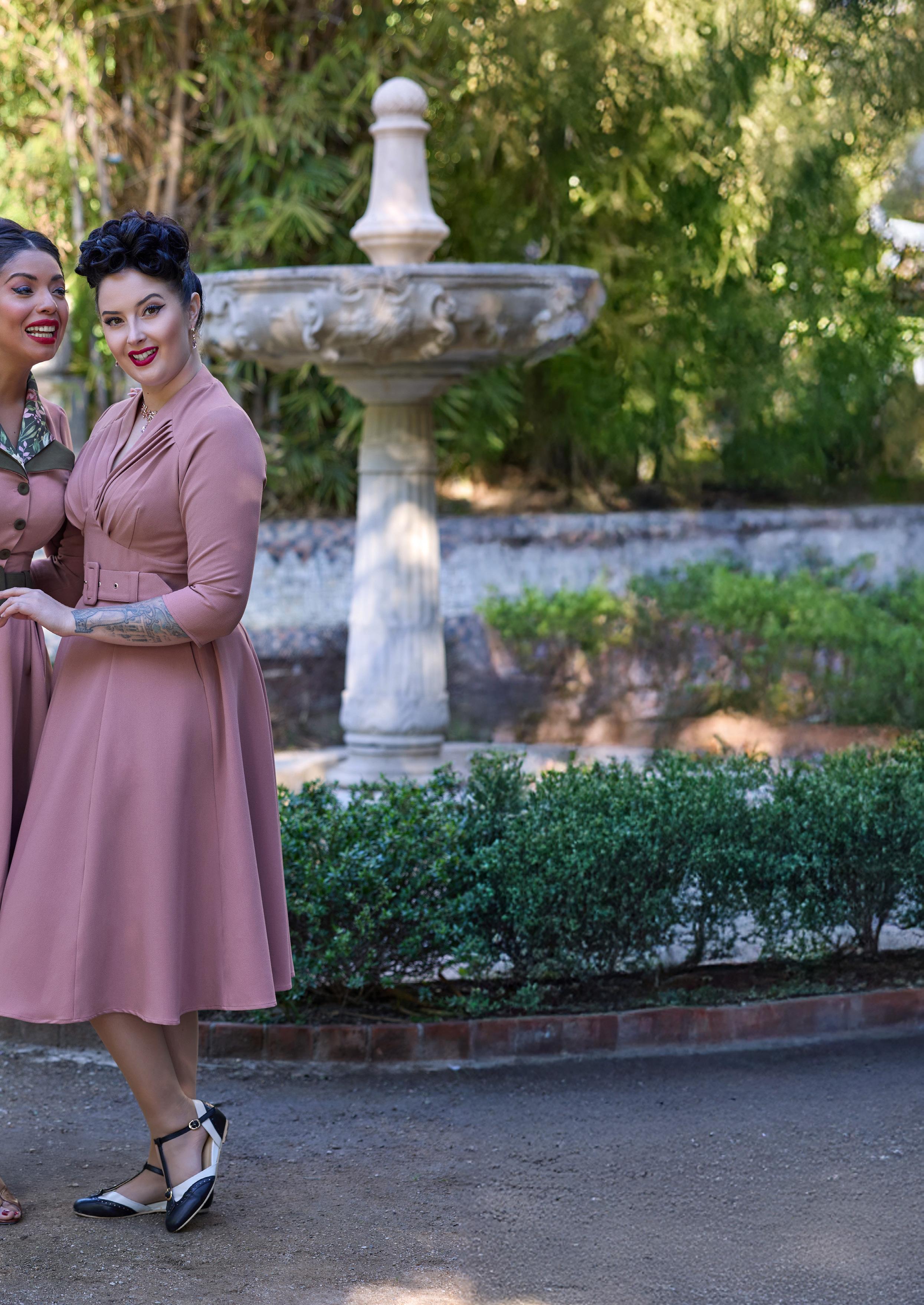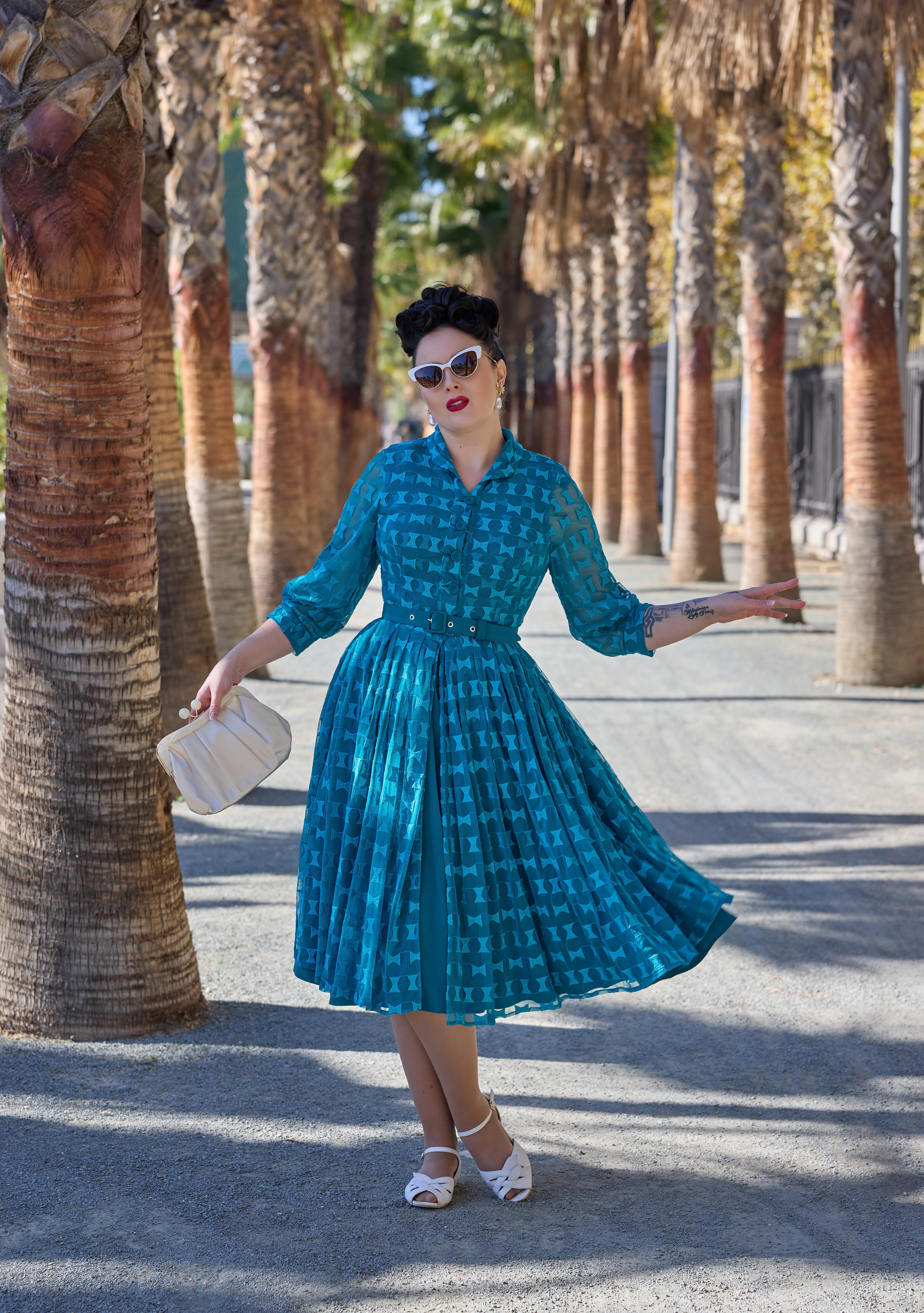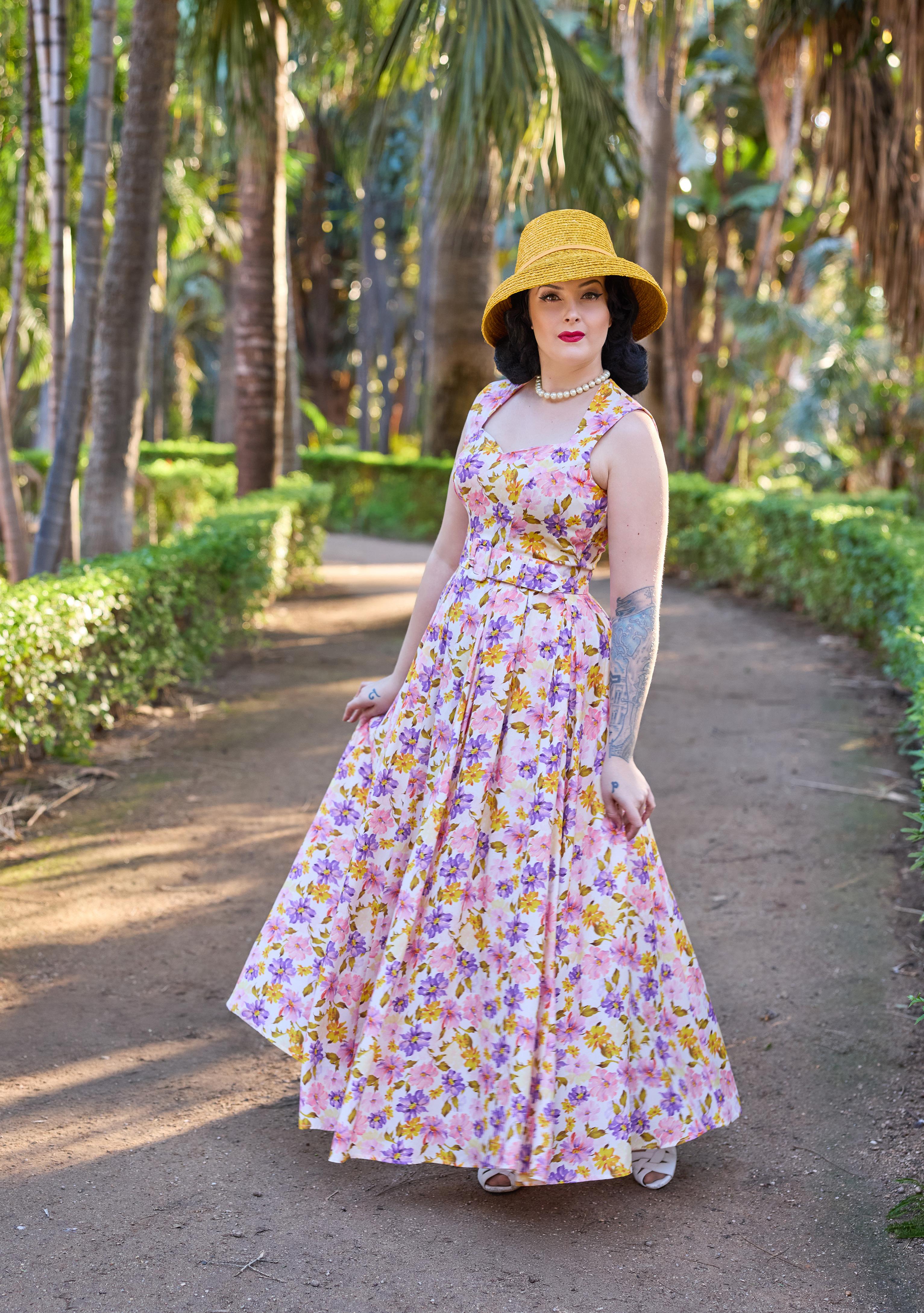 A nostalgic tea dress with a 1940s-inspired pleated bust, capturing vintage charm and the timeless femininity of Miss Candyfloss.