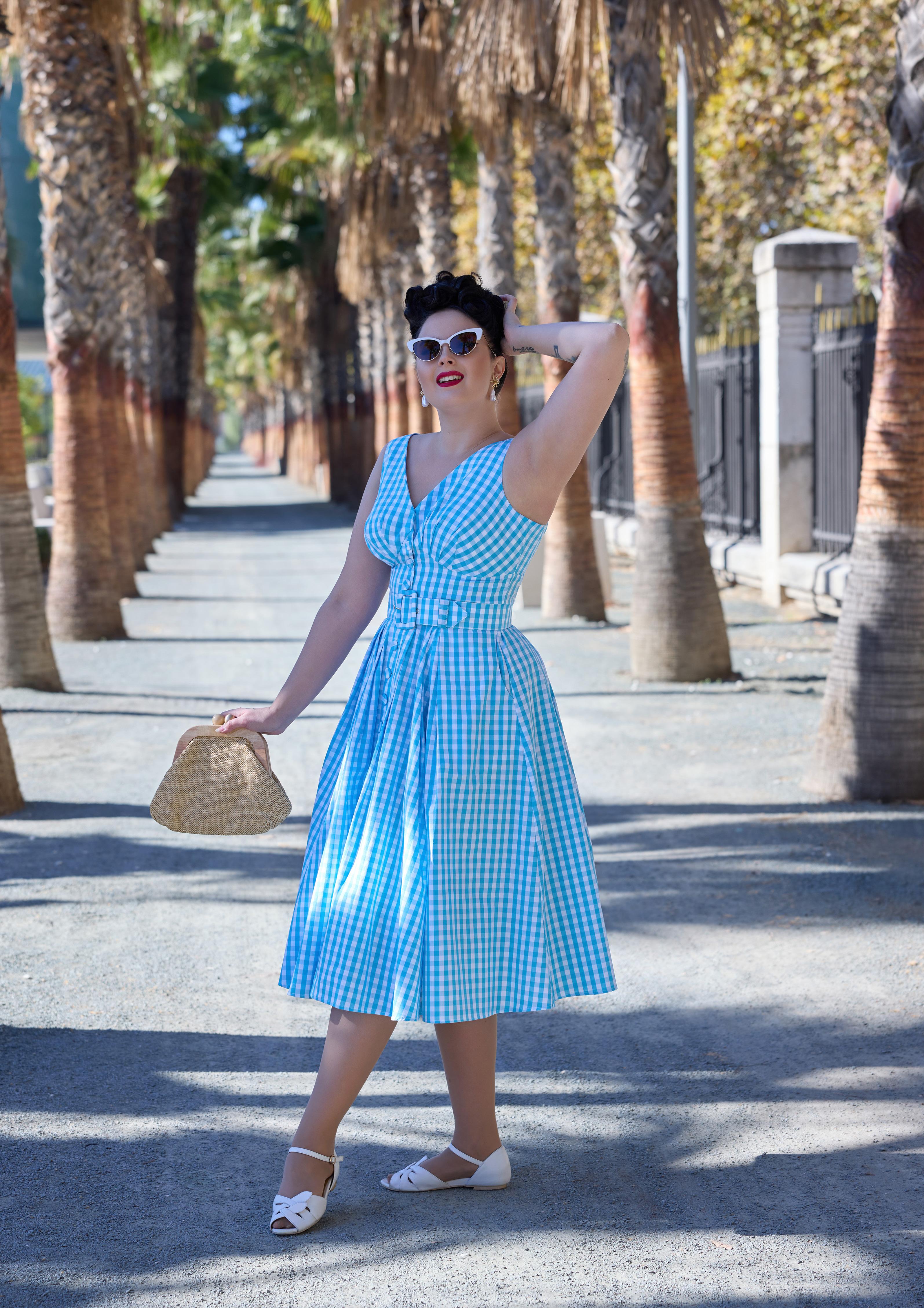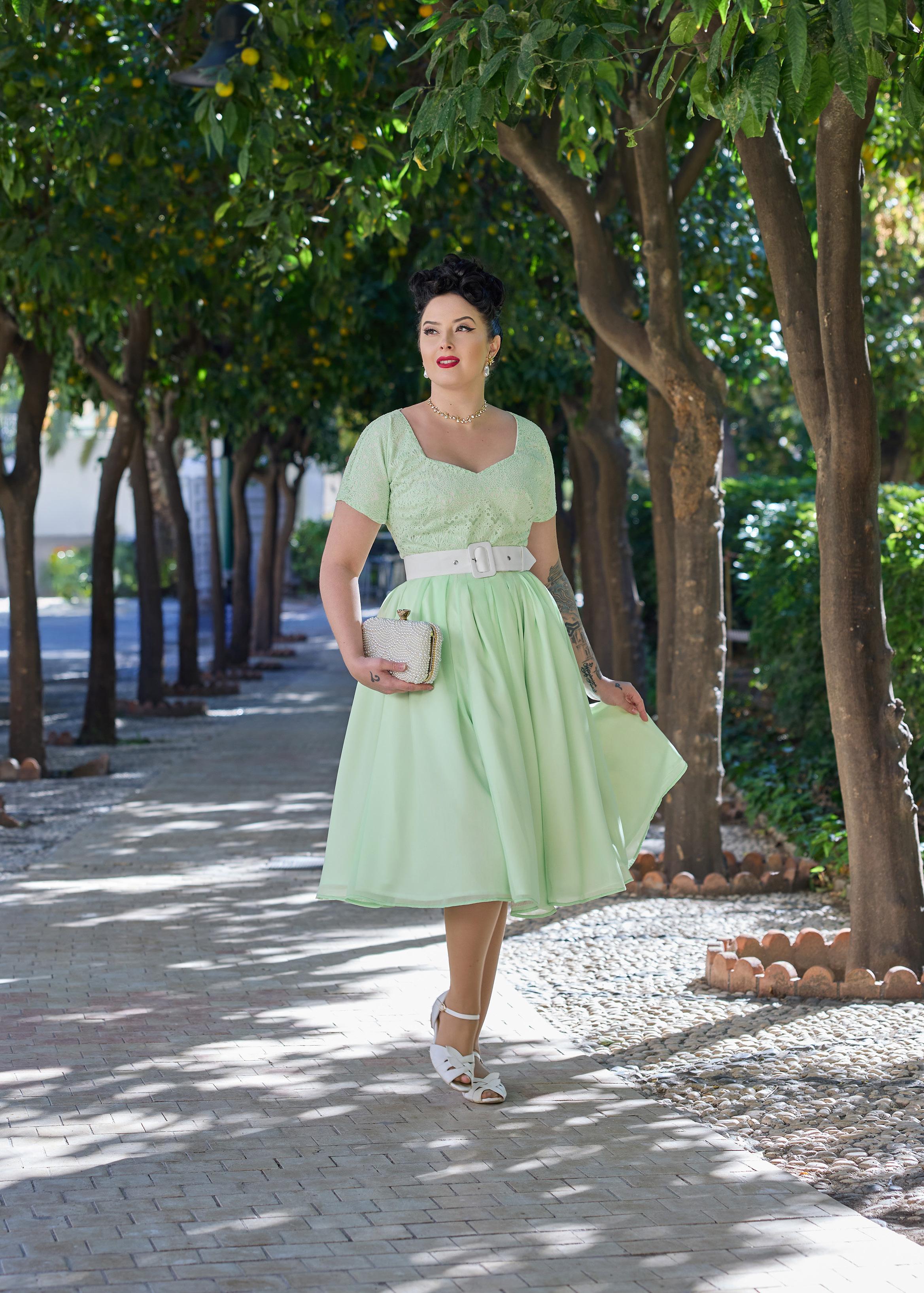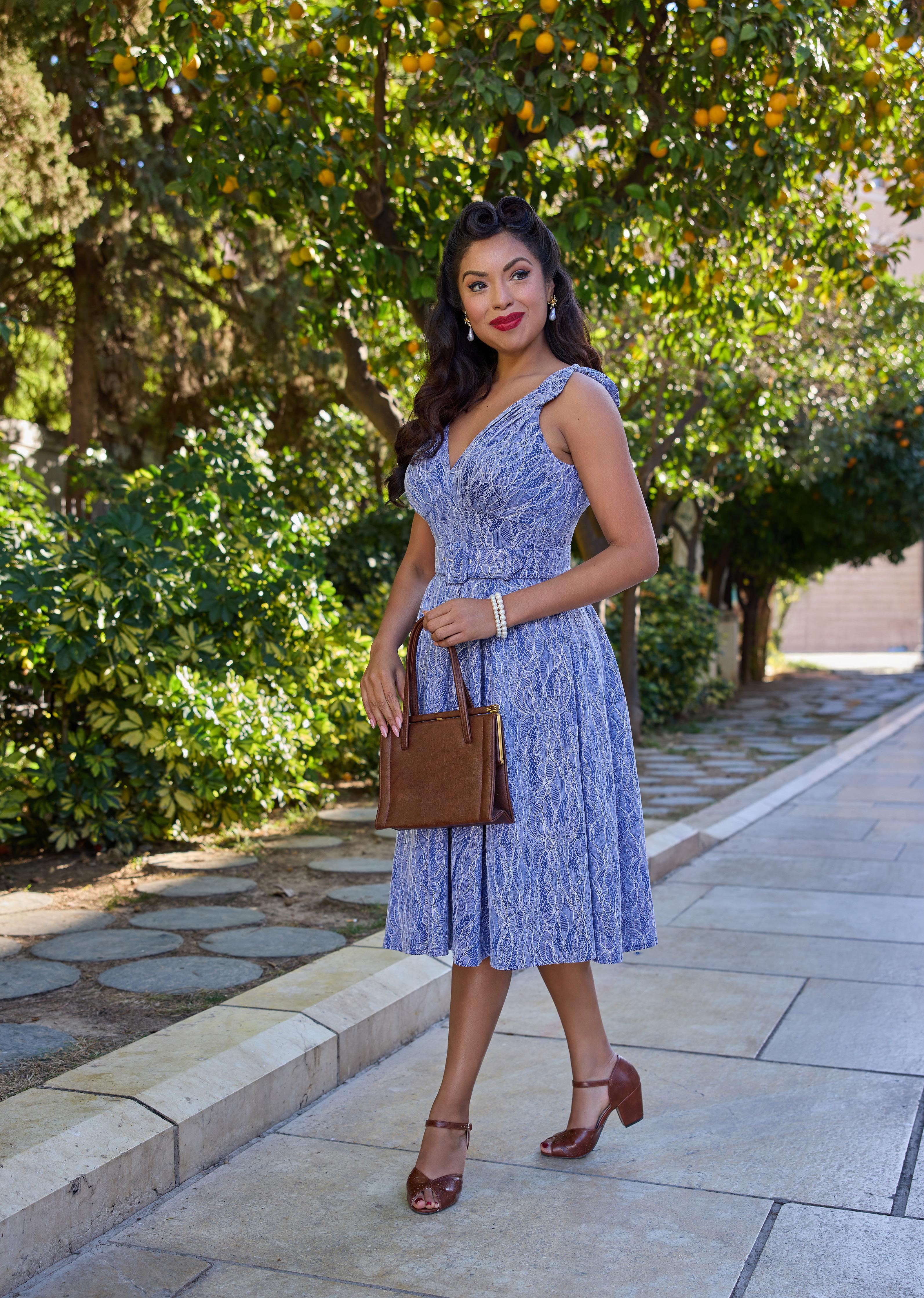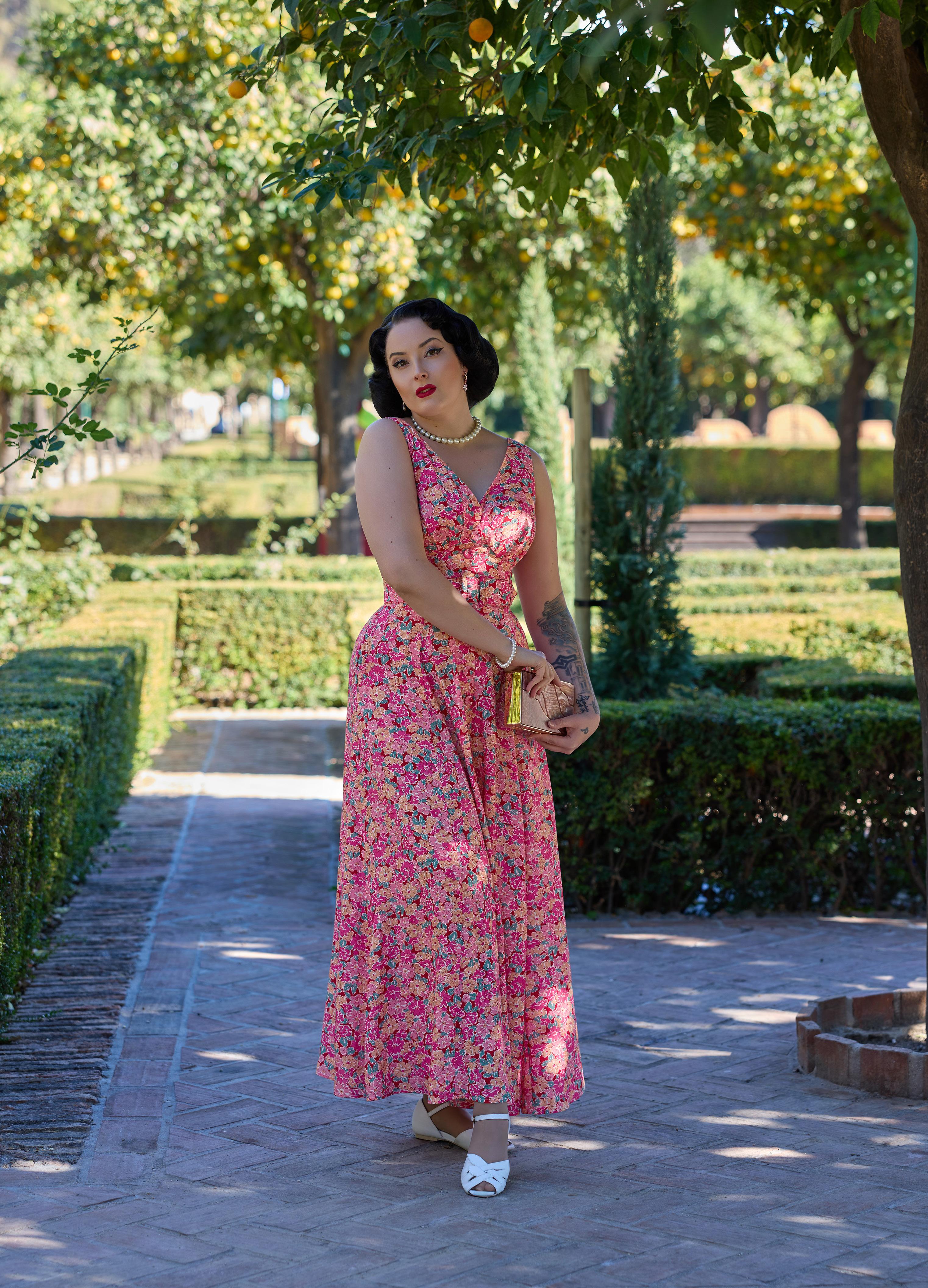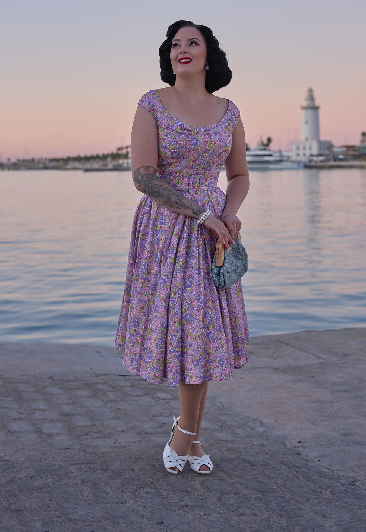 A nostalgic tea dress with a 1940s-inspired pleated bust, capturing vintage charm and the timeless femininity of Miss Candyfloss.