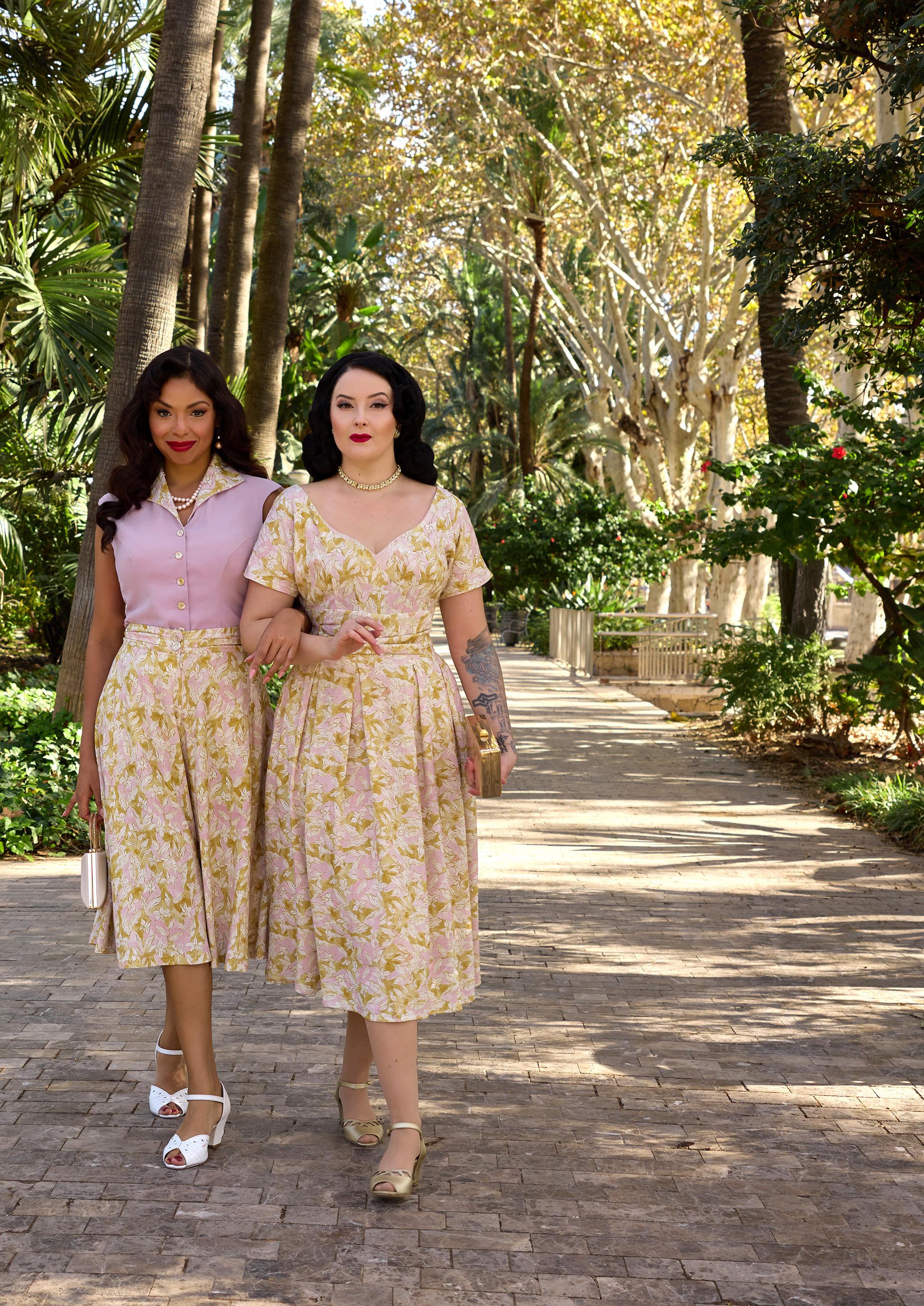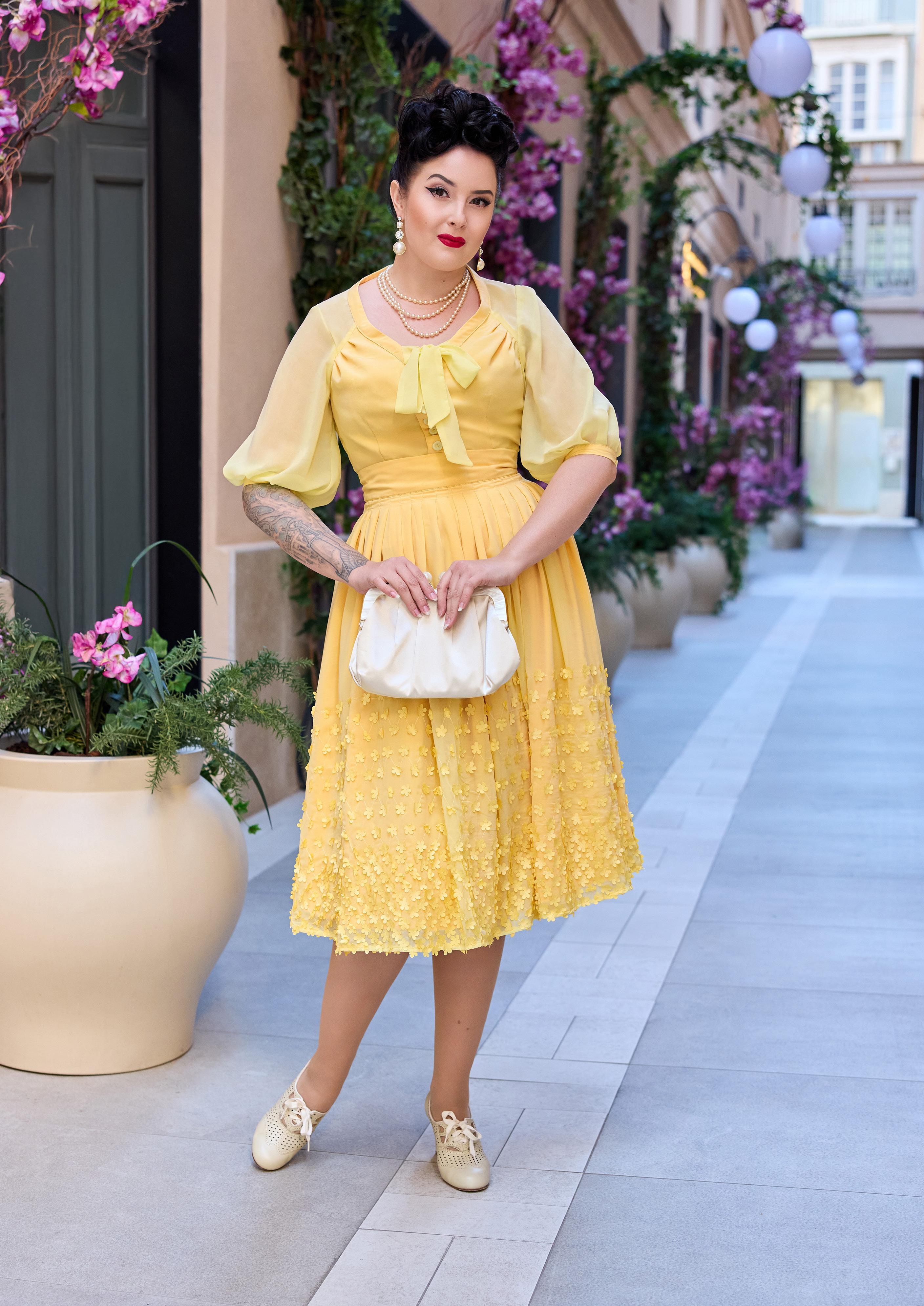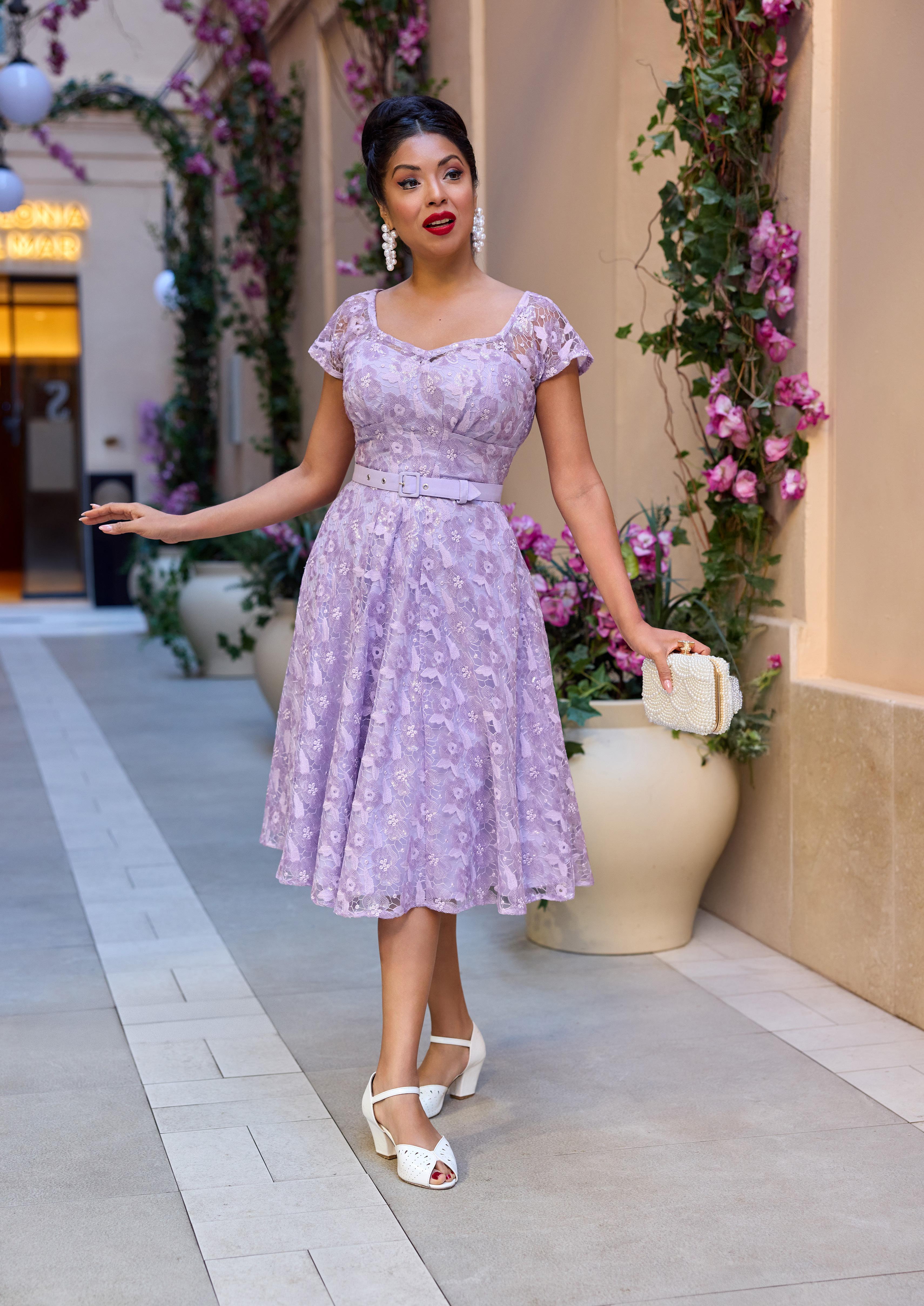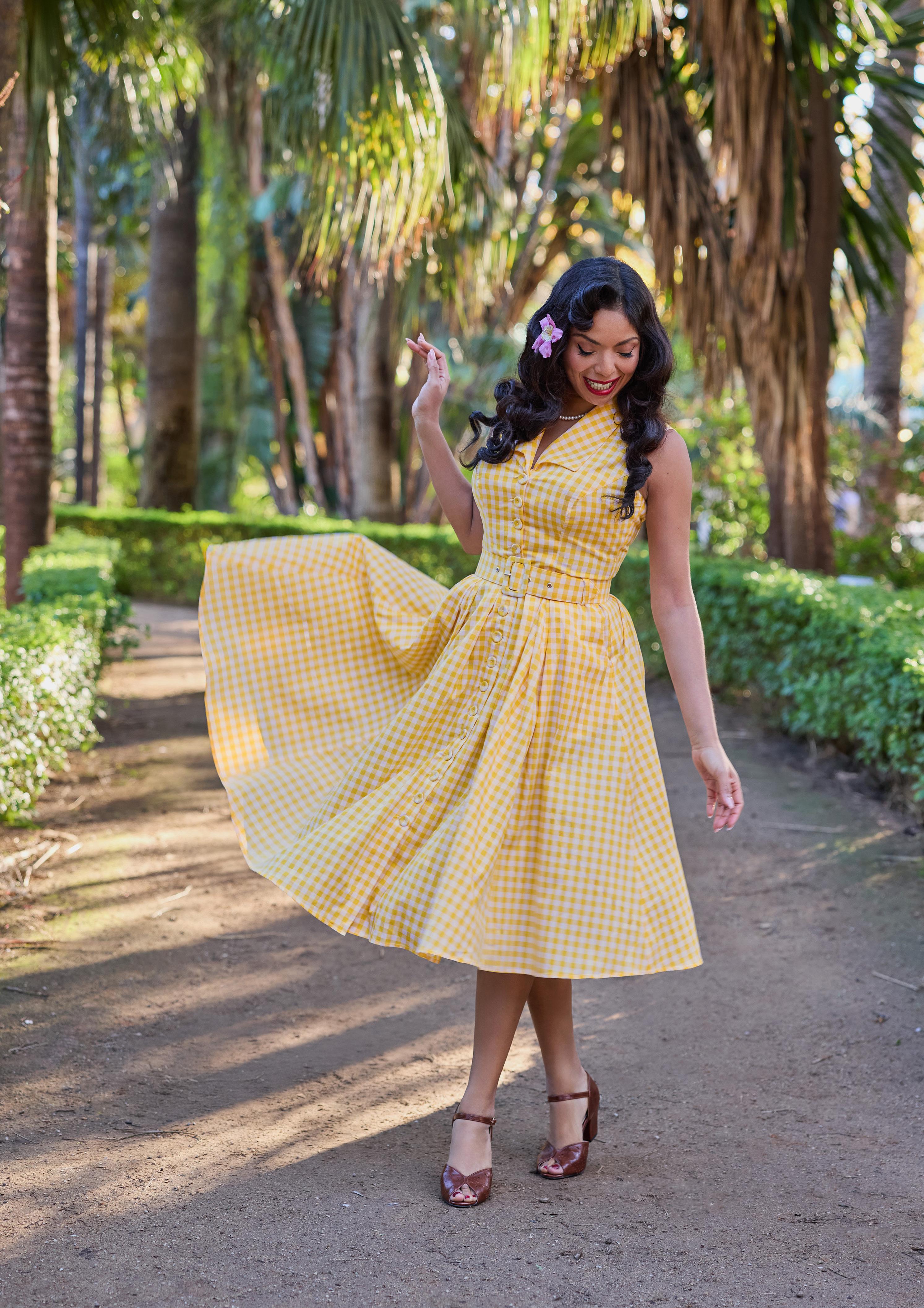 A nostalgic tea dress with a 1940s-inspired pleated bust, capturing vintage charm and the timeless femininity of Miss Candyfloss.