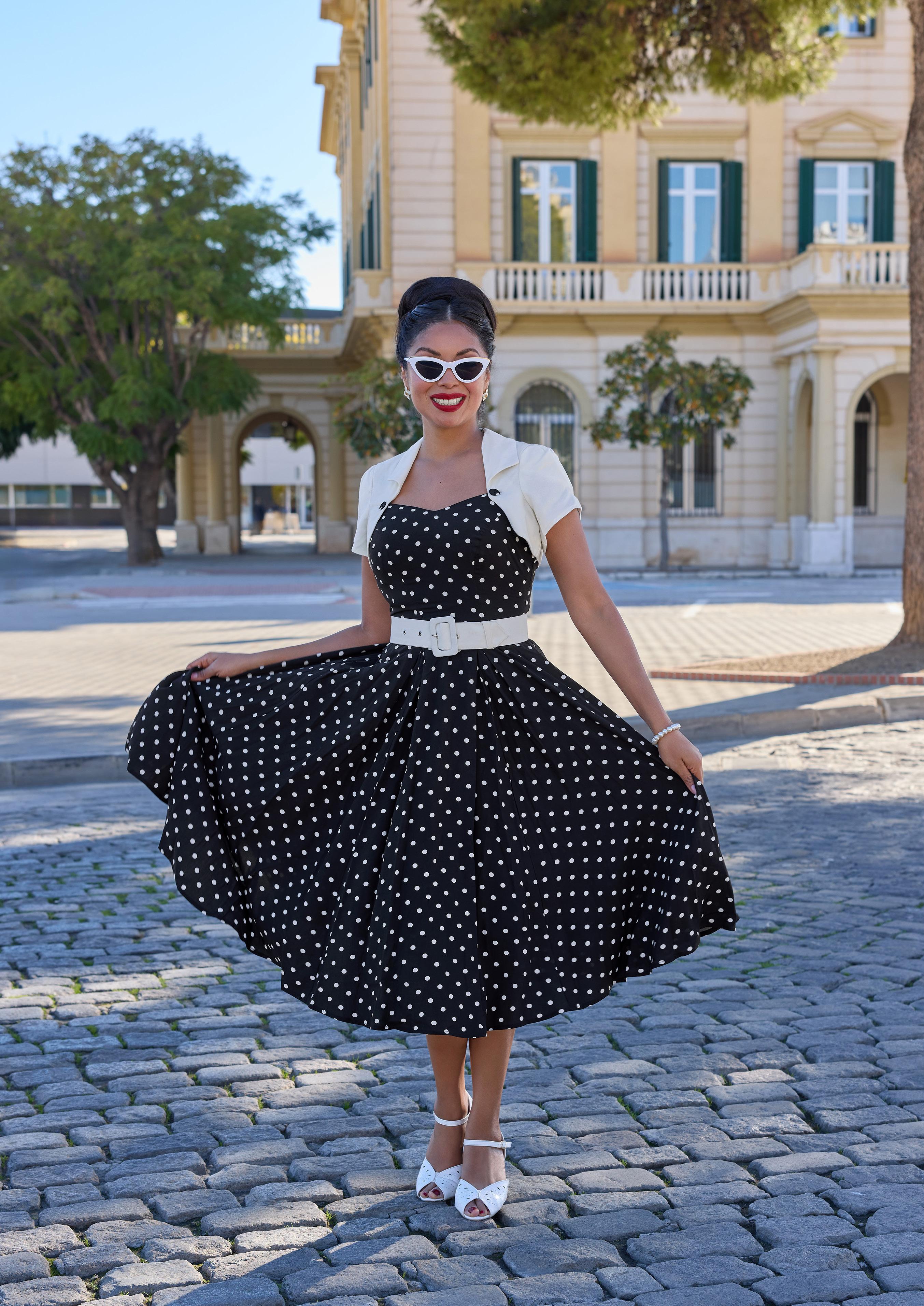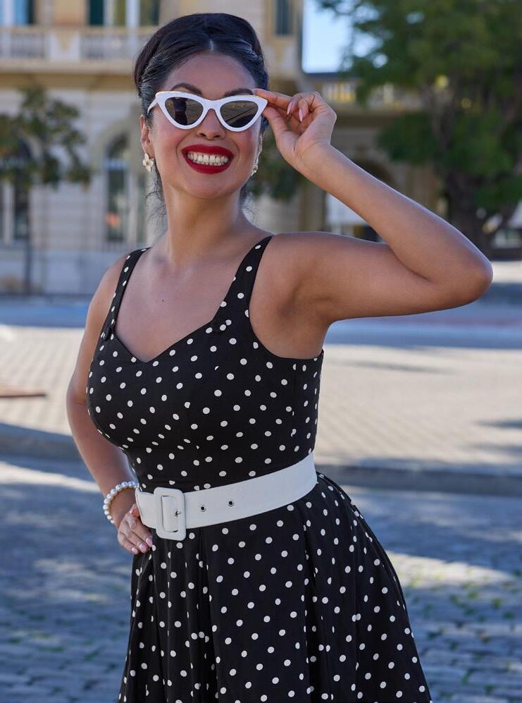 Soft, comfortable stretch wiggle dress, now in playful polka dots, radiating timeless charm and Miss Candyfloss whimsy.