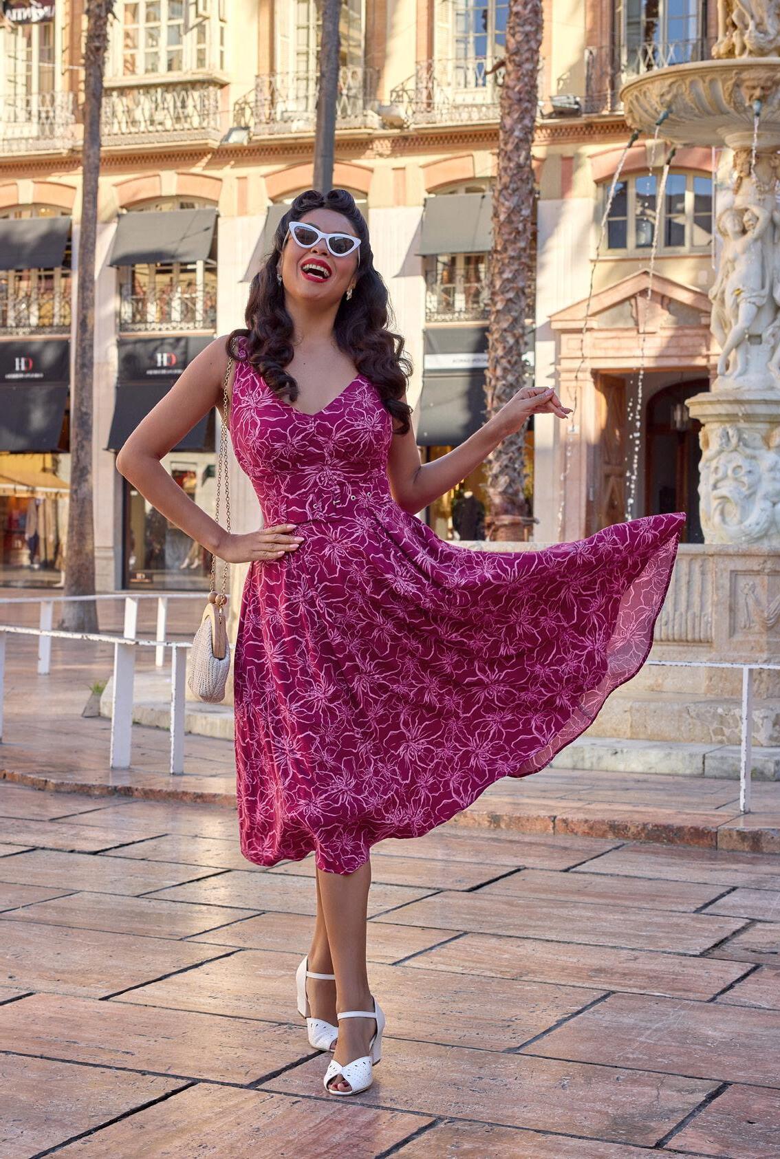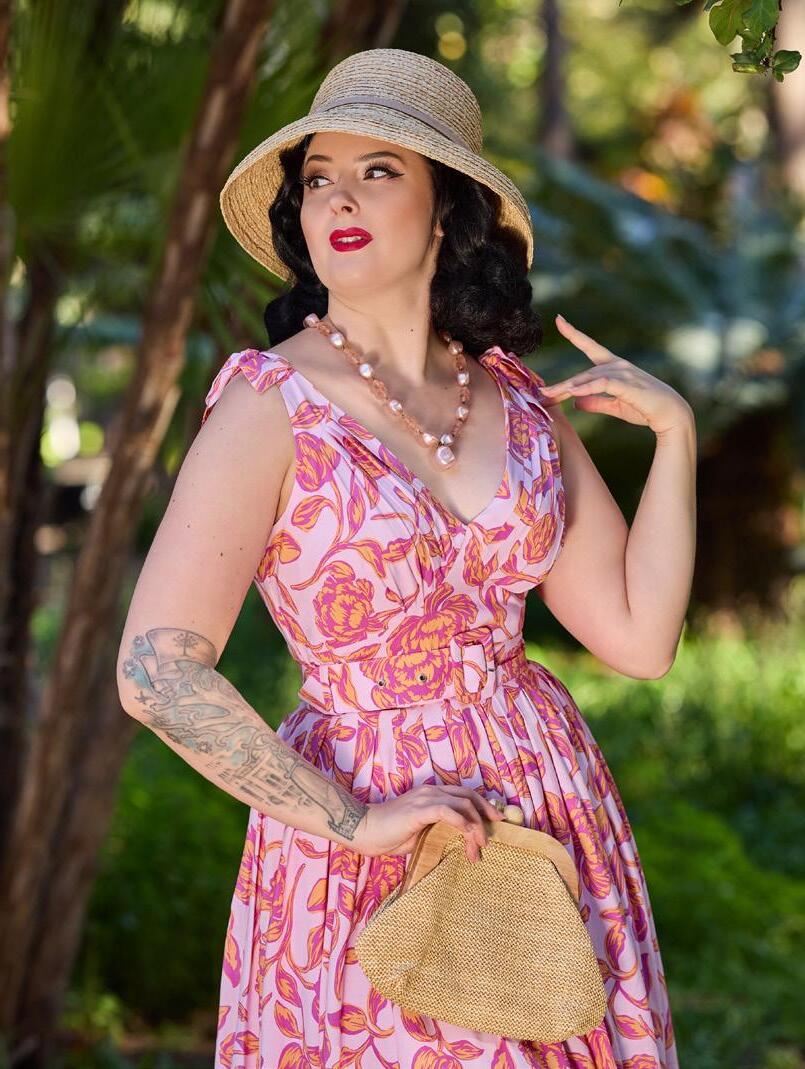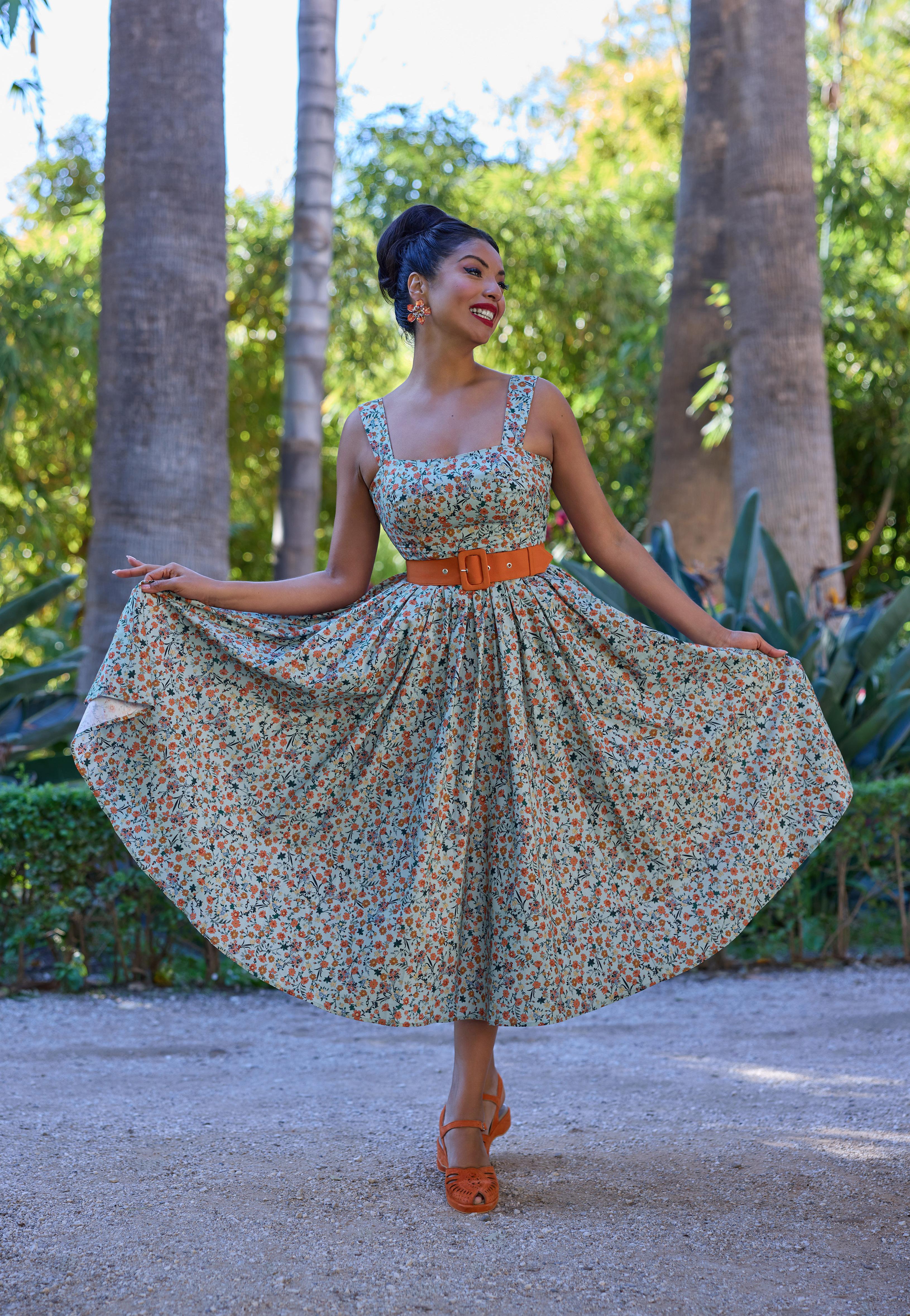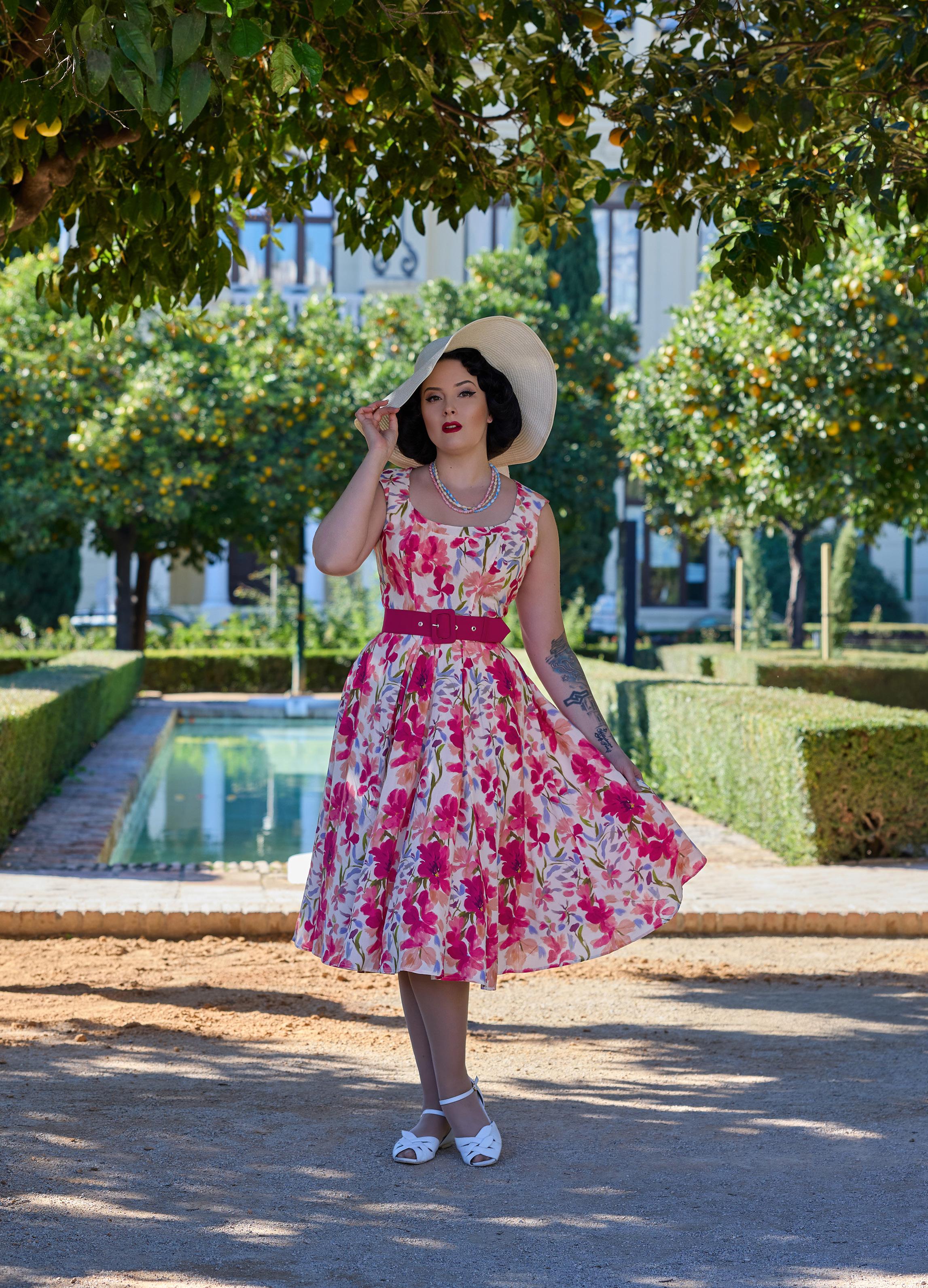 A floral swing dress with a pleated bust and handy pockets, exuding playful elegance in classic Miss Candyfloss style.