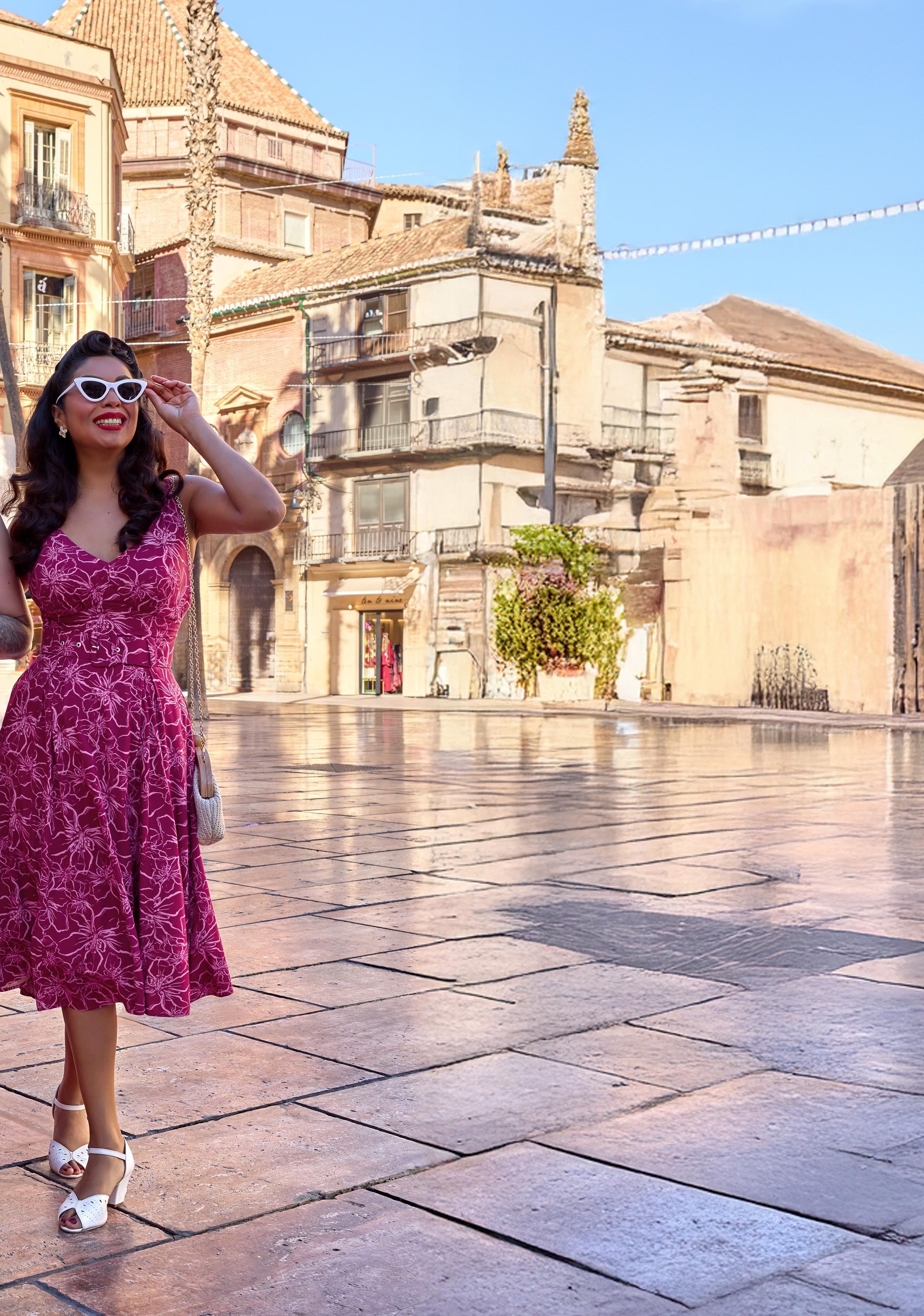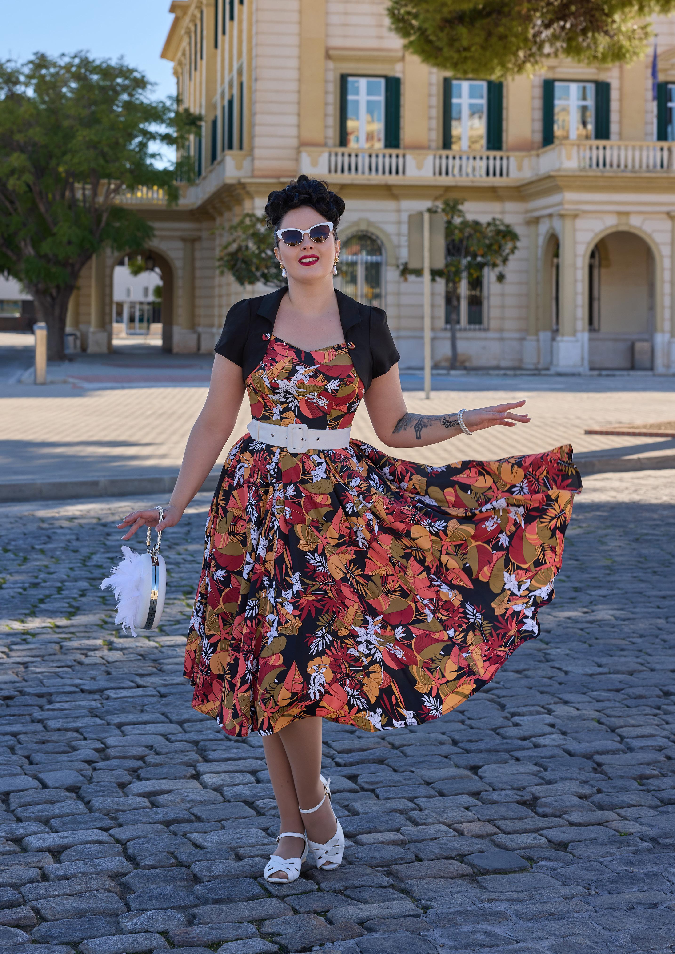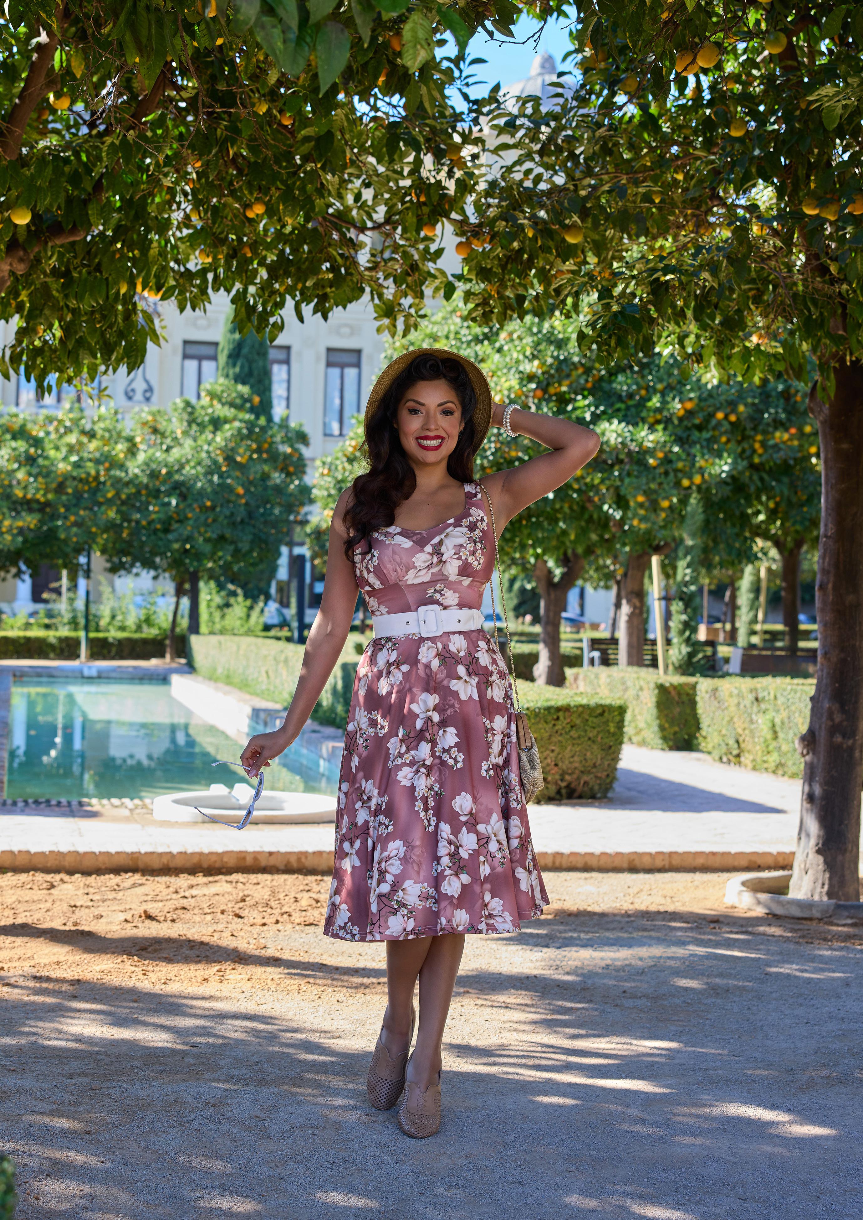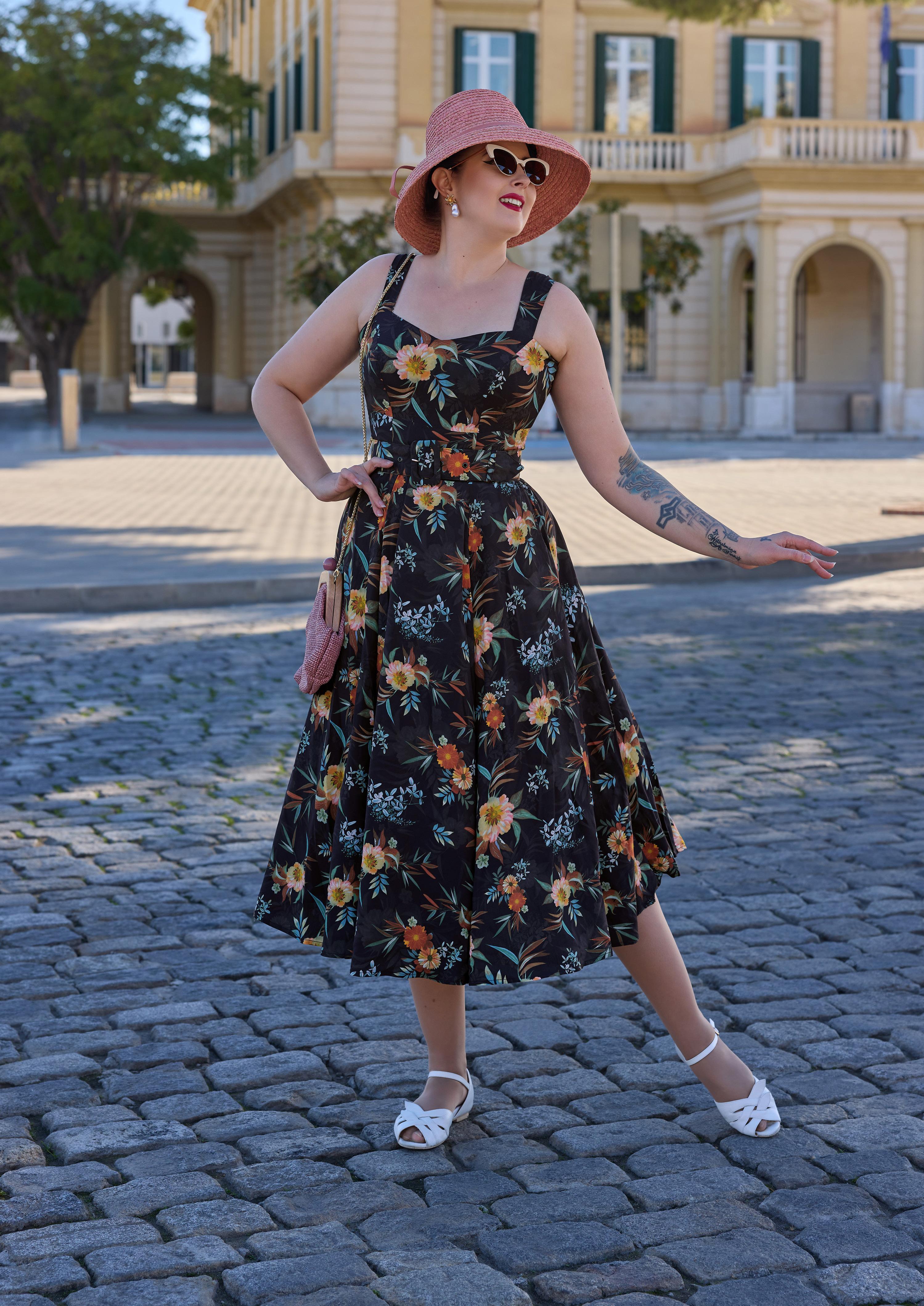 A floral swing dress with a pleated bust and handy pockets, exuding playful elegance in classic Miss Candyfloss style.