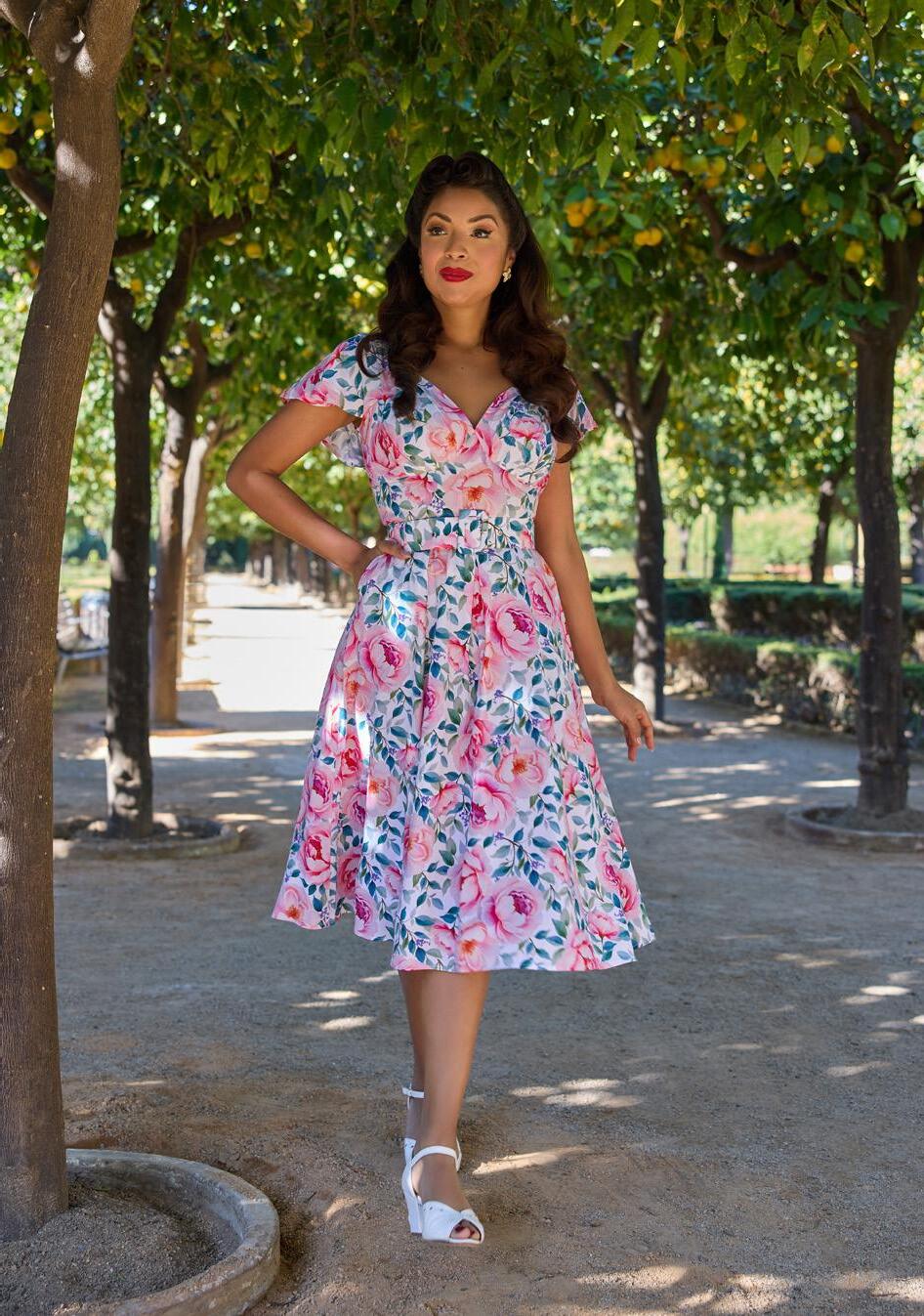 A breezy viscose floral swing dress with handy pockets and a graceful Queen Anne neckline, radiating romantic charm and timeless Miss Candyfloss elegance.