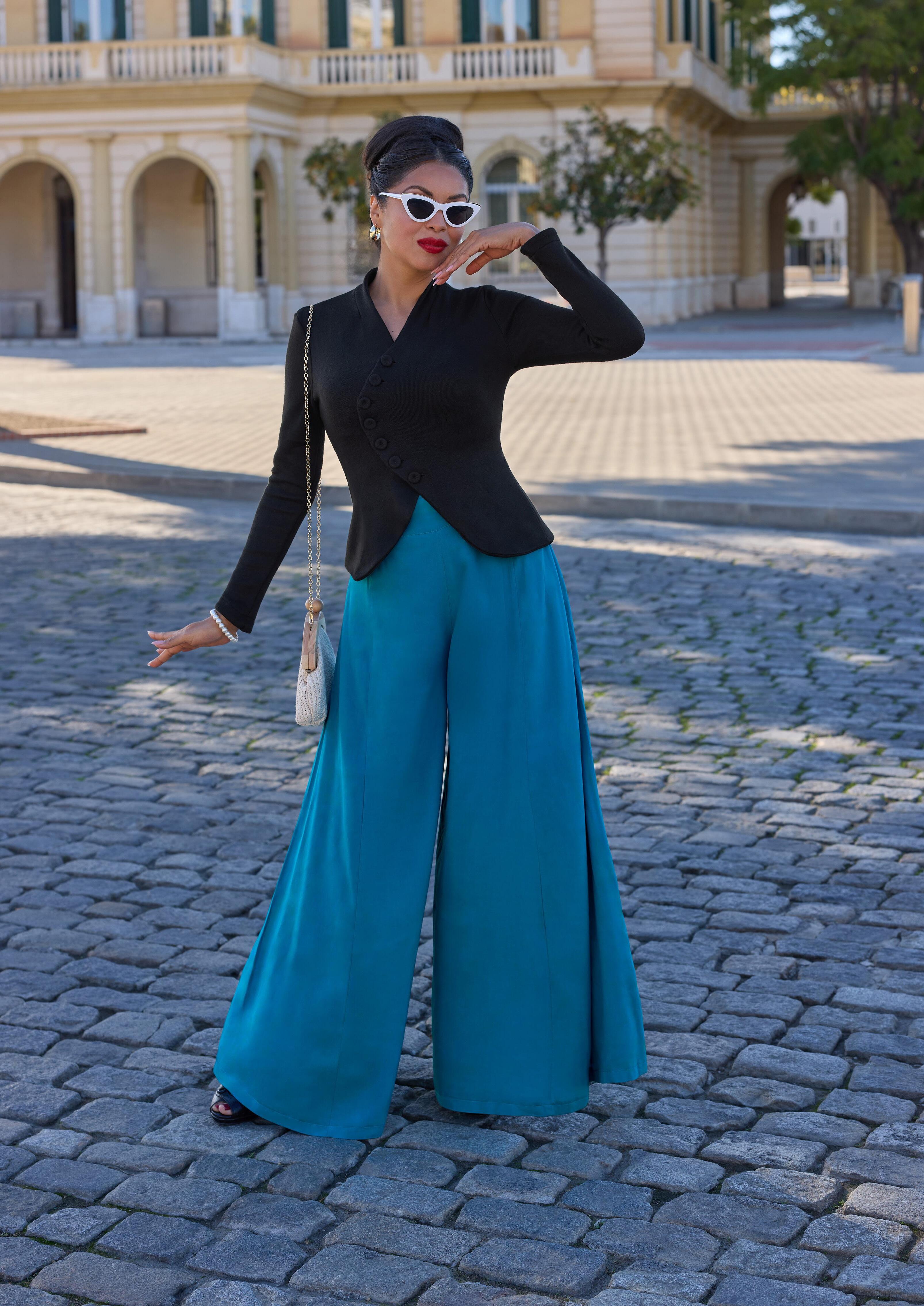 Indulge in timeless elegance with signature palazzo pants, renowned for their flowing silhouette and classic style.