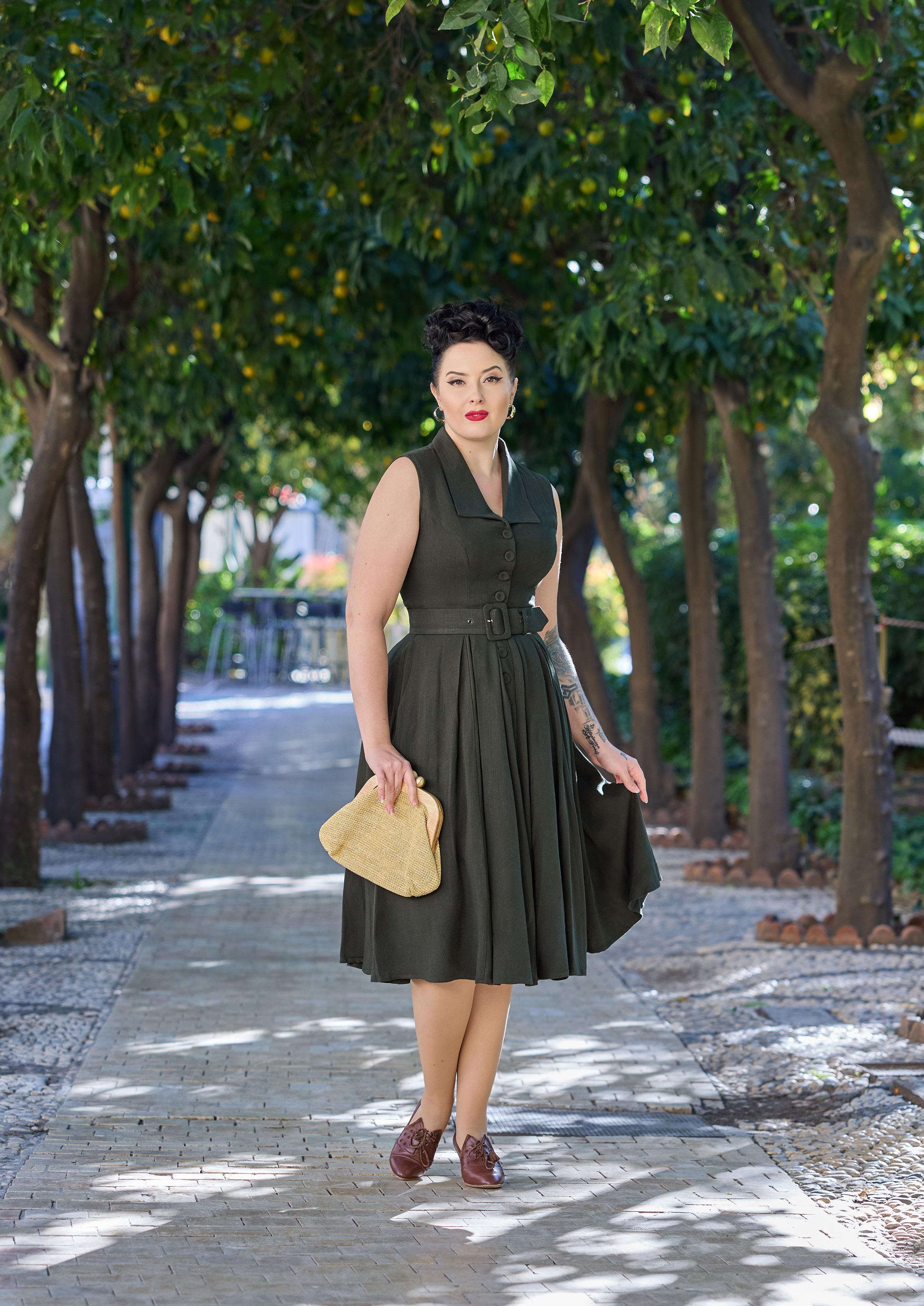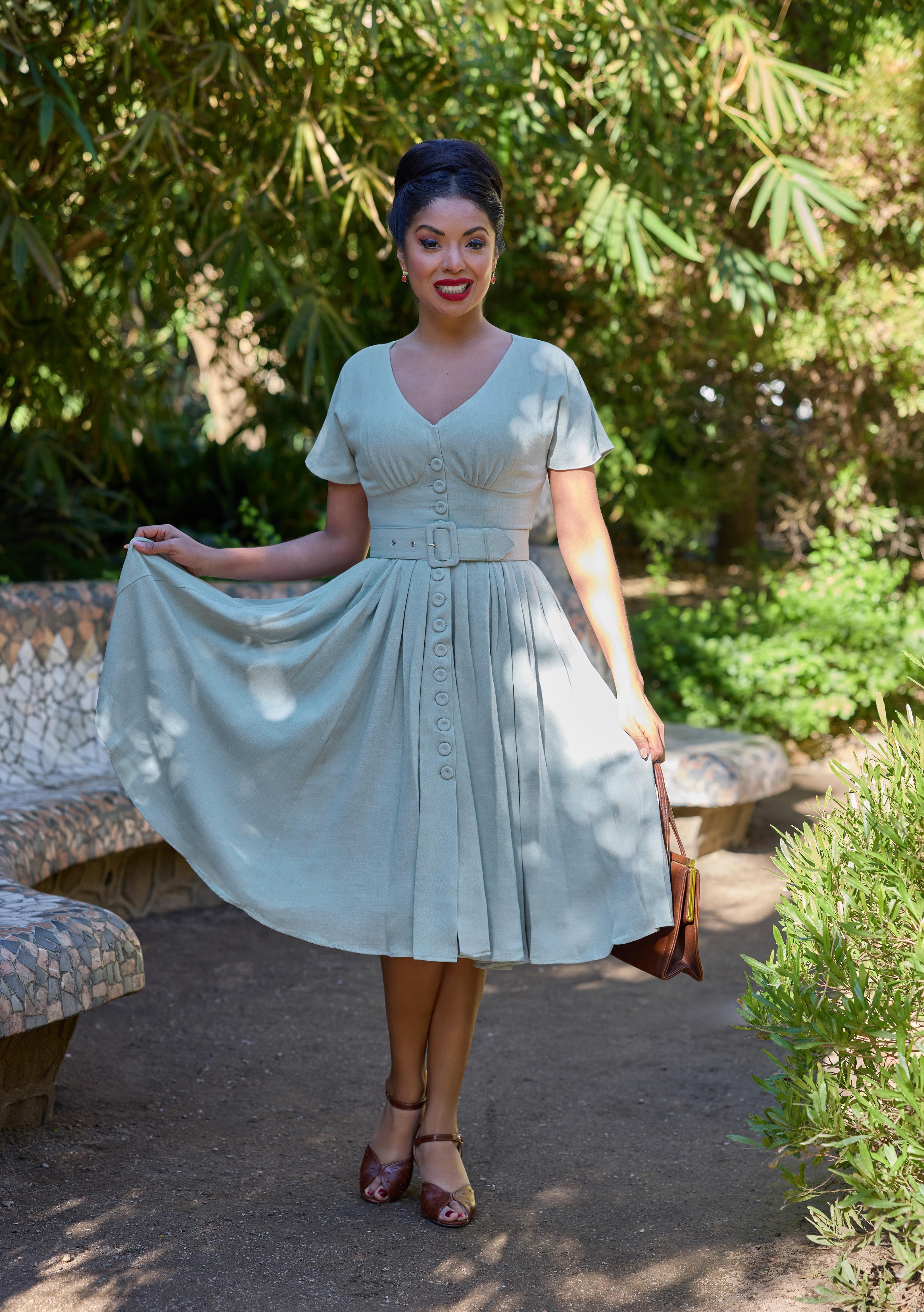 A vintage-inspired linen shirtdress from the 1940s, featuring a button-down front and pockets with effortless Miss Candyfloss elegance.