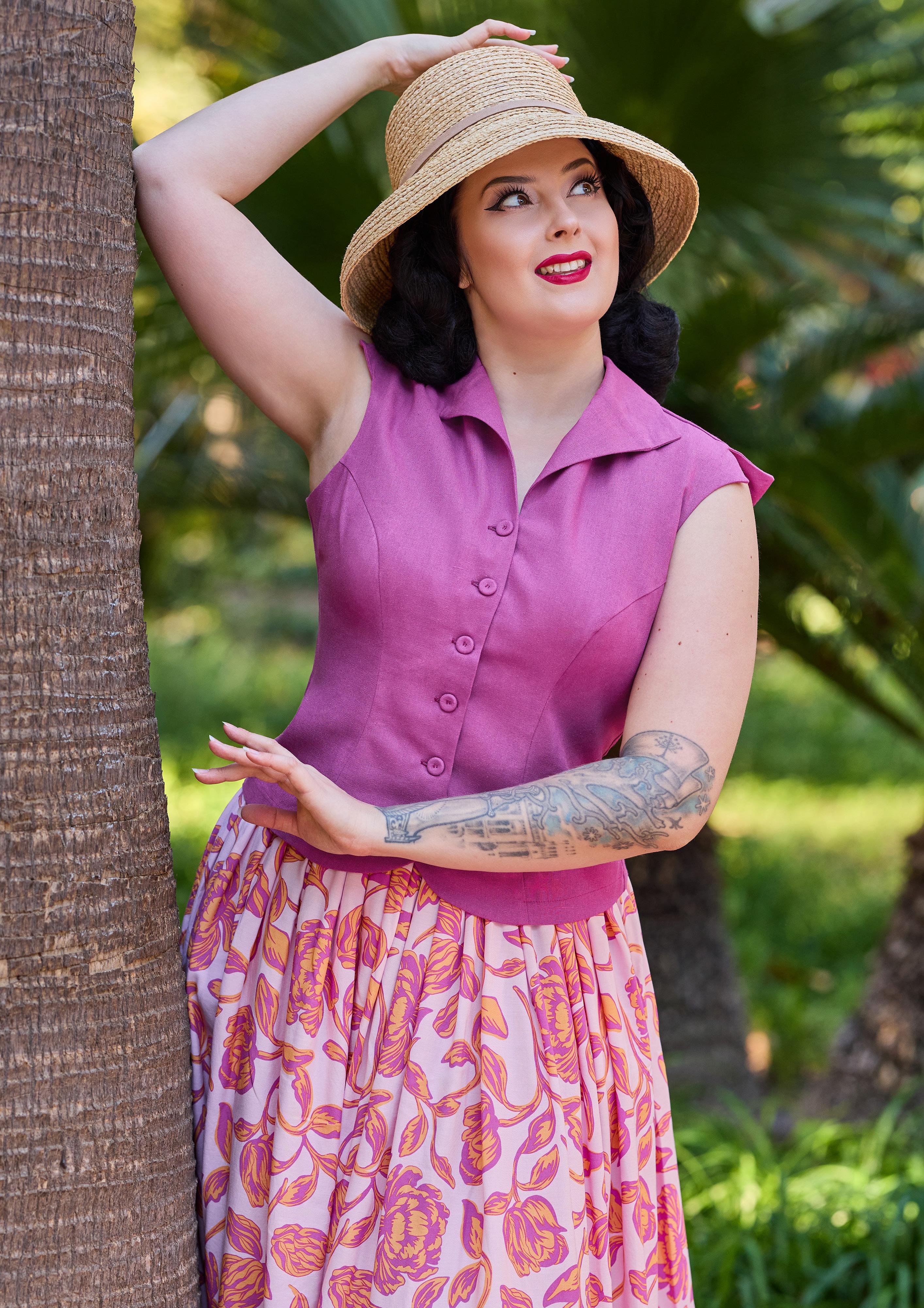 A sleeveless linen blouse, airy and elegant, embodying the relaxed sophistication of Miss Candyfloss.