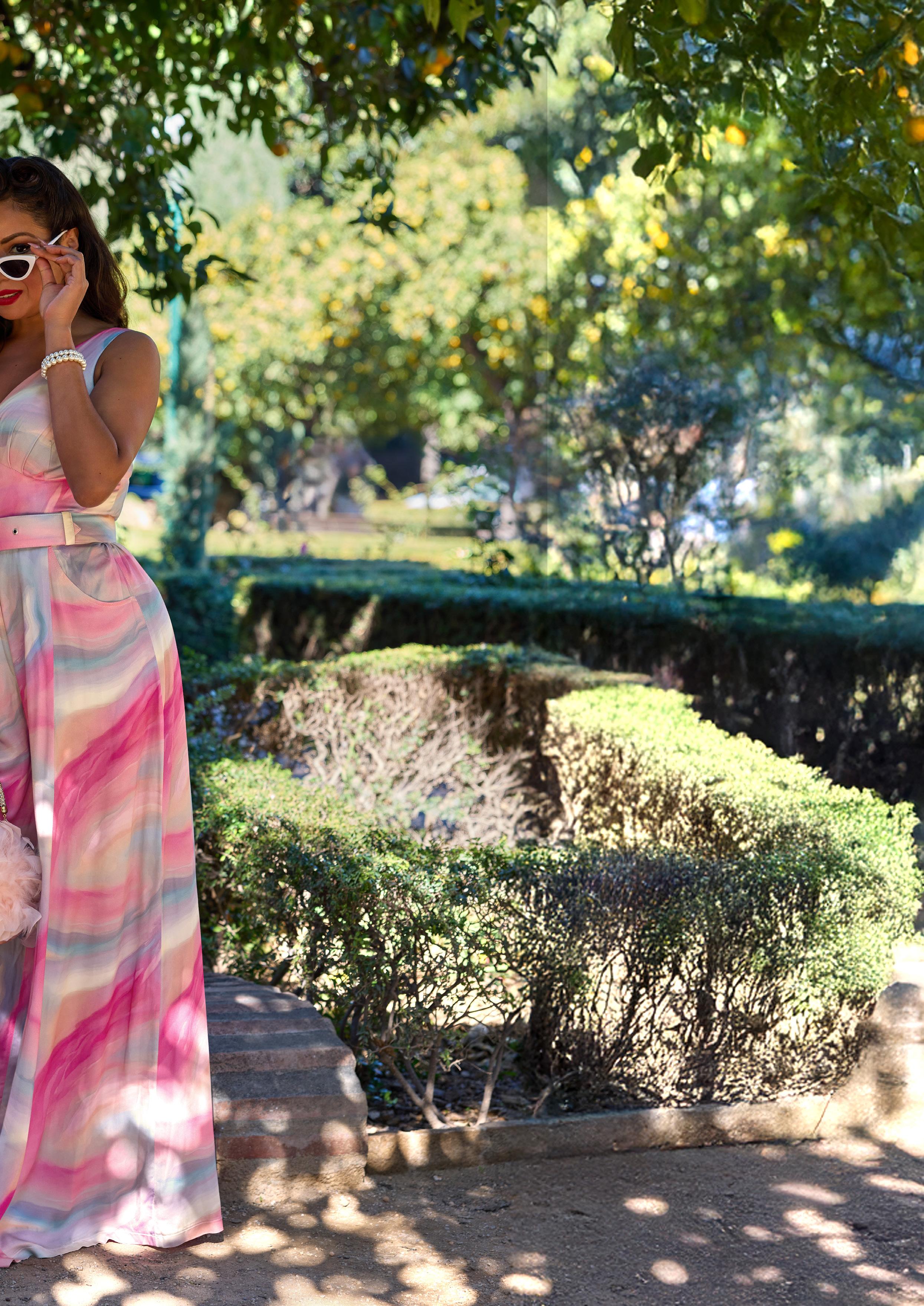 A romantic palazzo pantsuit in dreamy unicorn hues, featuring wide flowing legs, adjustable straps, and handy pockets for an effortlessly enchanting Miss Candyfloss look.