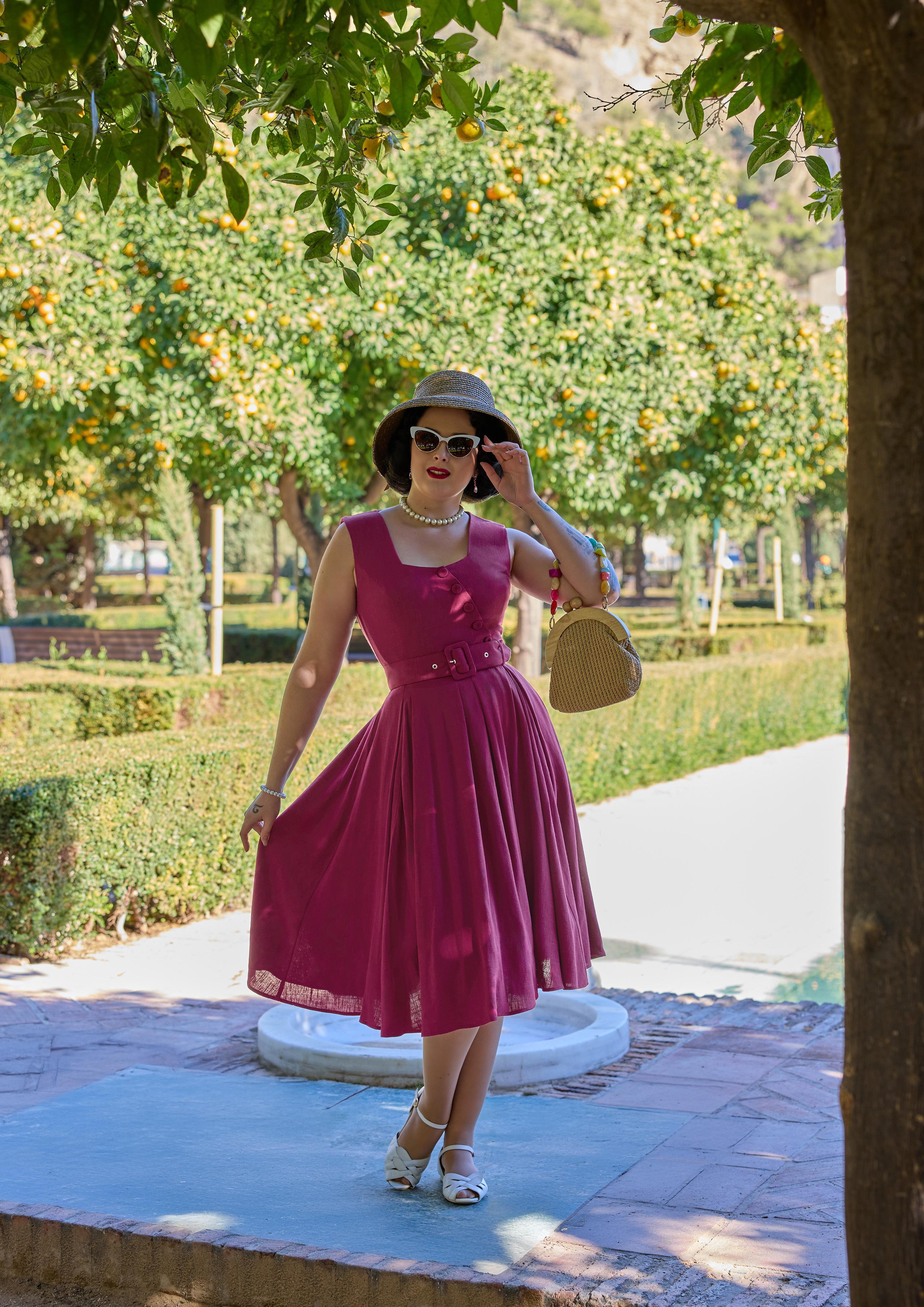 Elegant 1950s-style asymmetrical summer dress in a plain-colored linen-viscose mix, perfect for a breezy and timeless summer look.