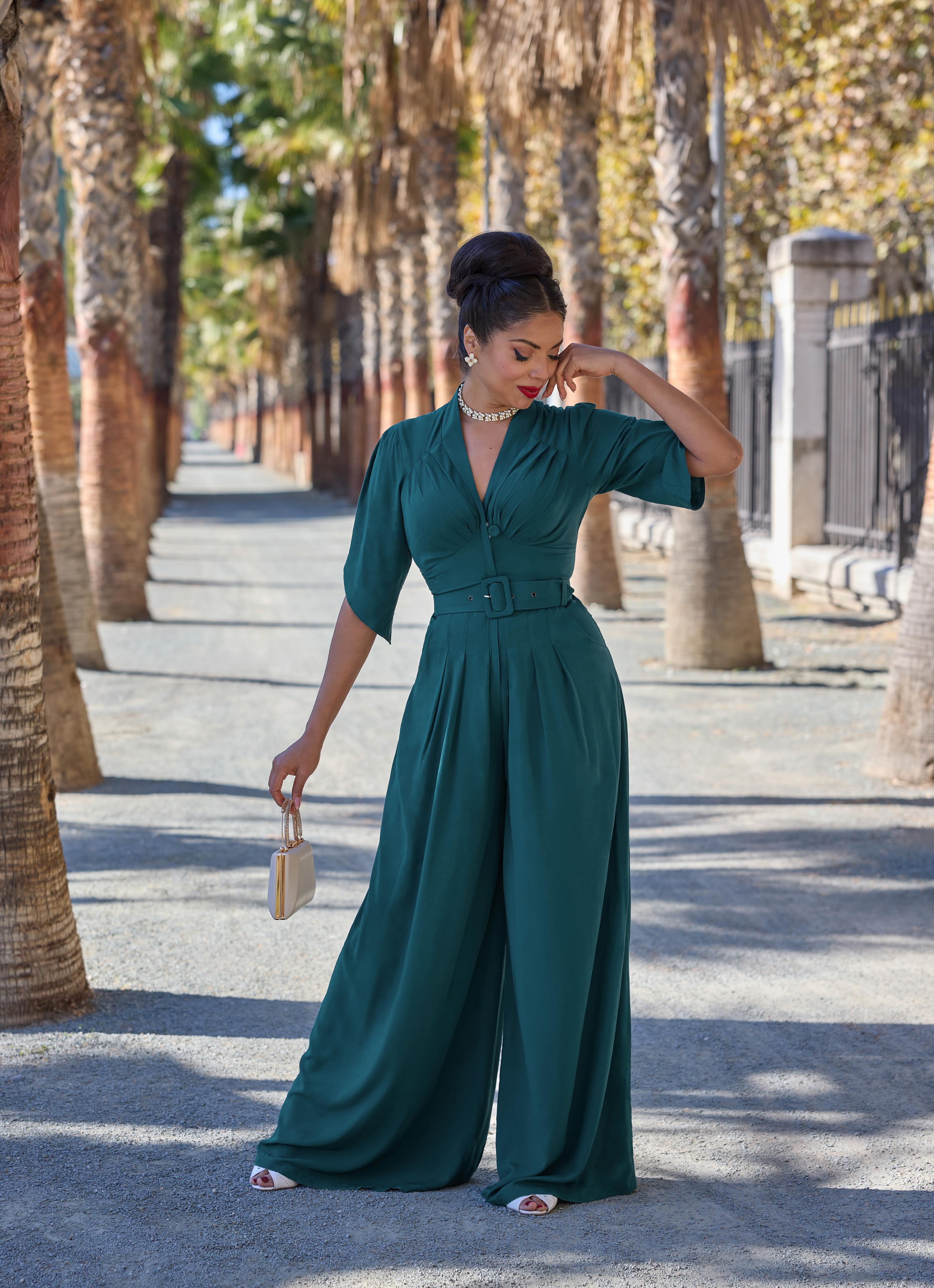 A timeless vintage-inspired jumpsuit featuring a pleated bust and flowing pleated trousers, signed by Miss Candyfloss.