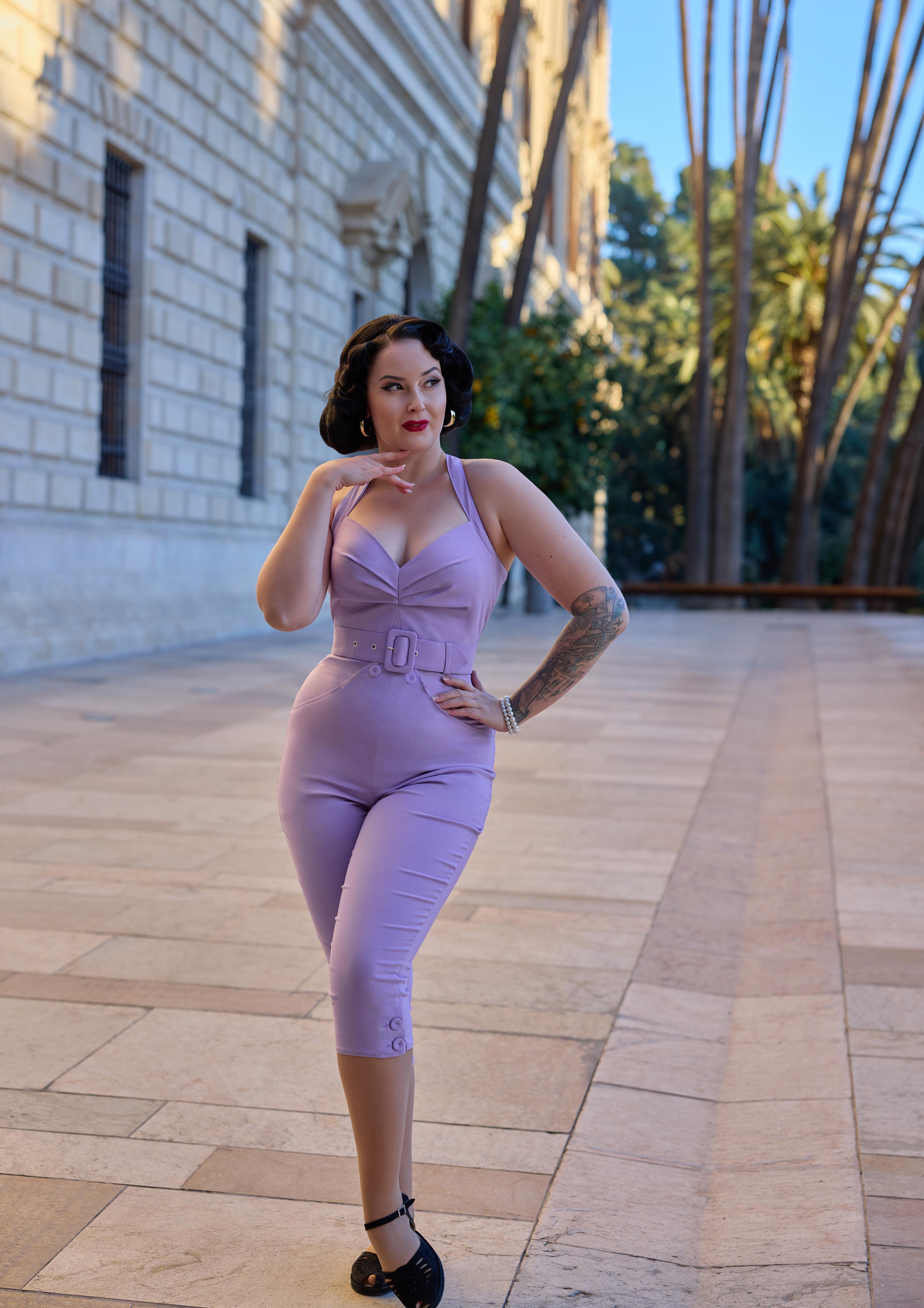 Strappy playsuit with a fitted silhouette, capri pants, and back zipper, radiating chic Miss Candyfloss sophistication.