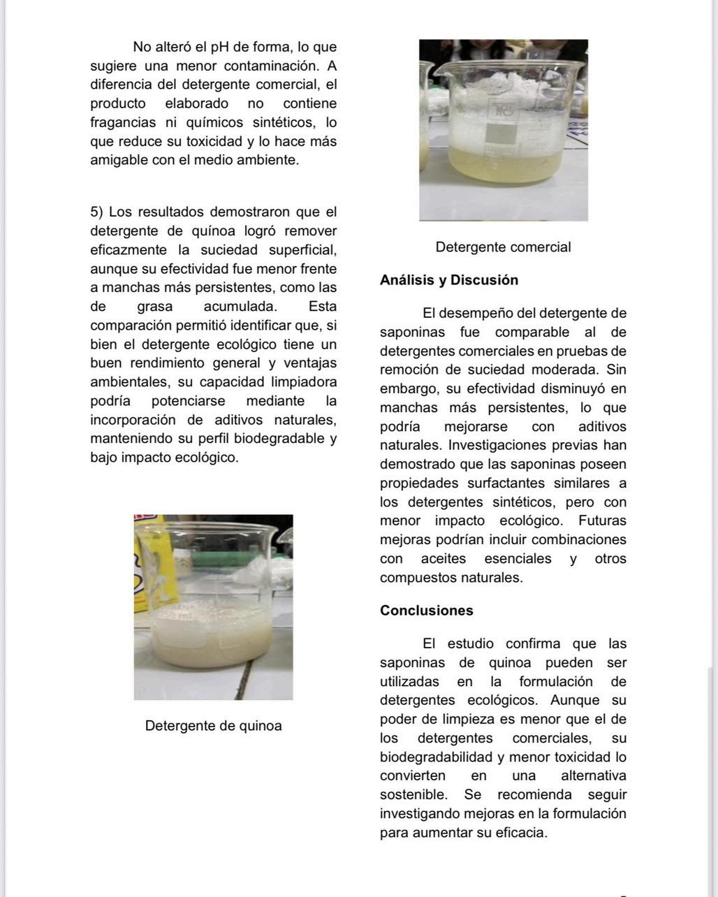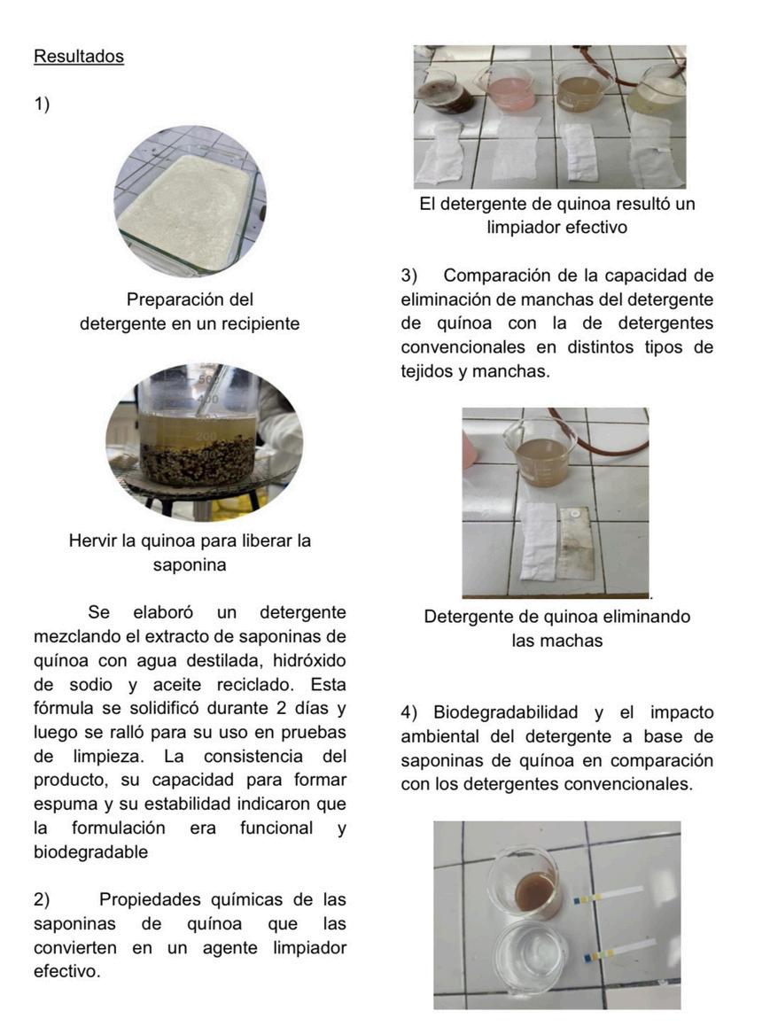 En este proyecto exploramos el desarrollo de un detergente biodegradable a base de las saponinas de quínoa como respuesta al impacto ambiental negativo asociado con los detergentes tradicionales y sus consecuencias medioambientales Los productos de limpieza convencionales suelen incluir fosfatos y surfactantes sintéticos, los cuales contaminan las fuentes de agua y afectan la fauna acuática. En contraste, las saponinas, compuestos naturales presentes en la quínoa, poseen propiedades espumantes y de limpieza que pueden reemplazar los agentes químicos de los detergentes convencionales Para la elaboración de este detergente ecológico, llevamos a cabo el proceso de saponificación, logrando un detergent e efectivo contra manchas y suciedad.