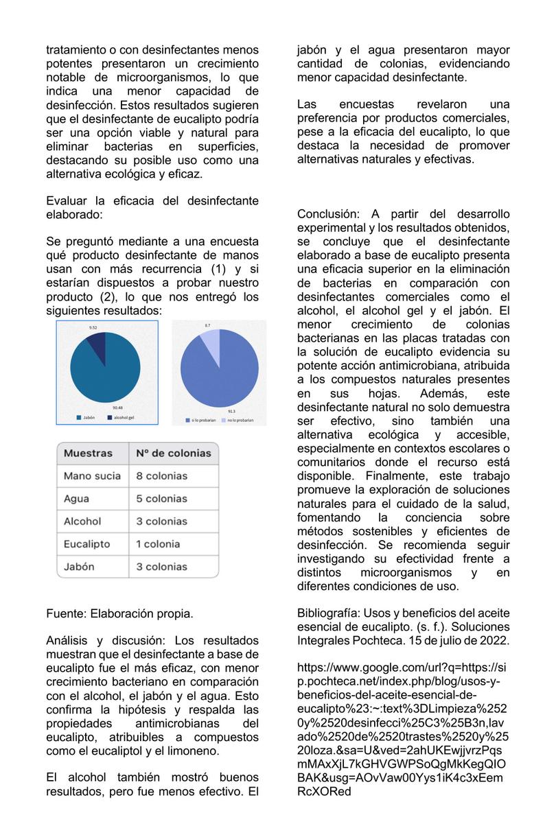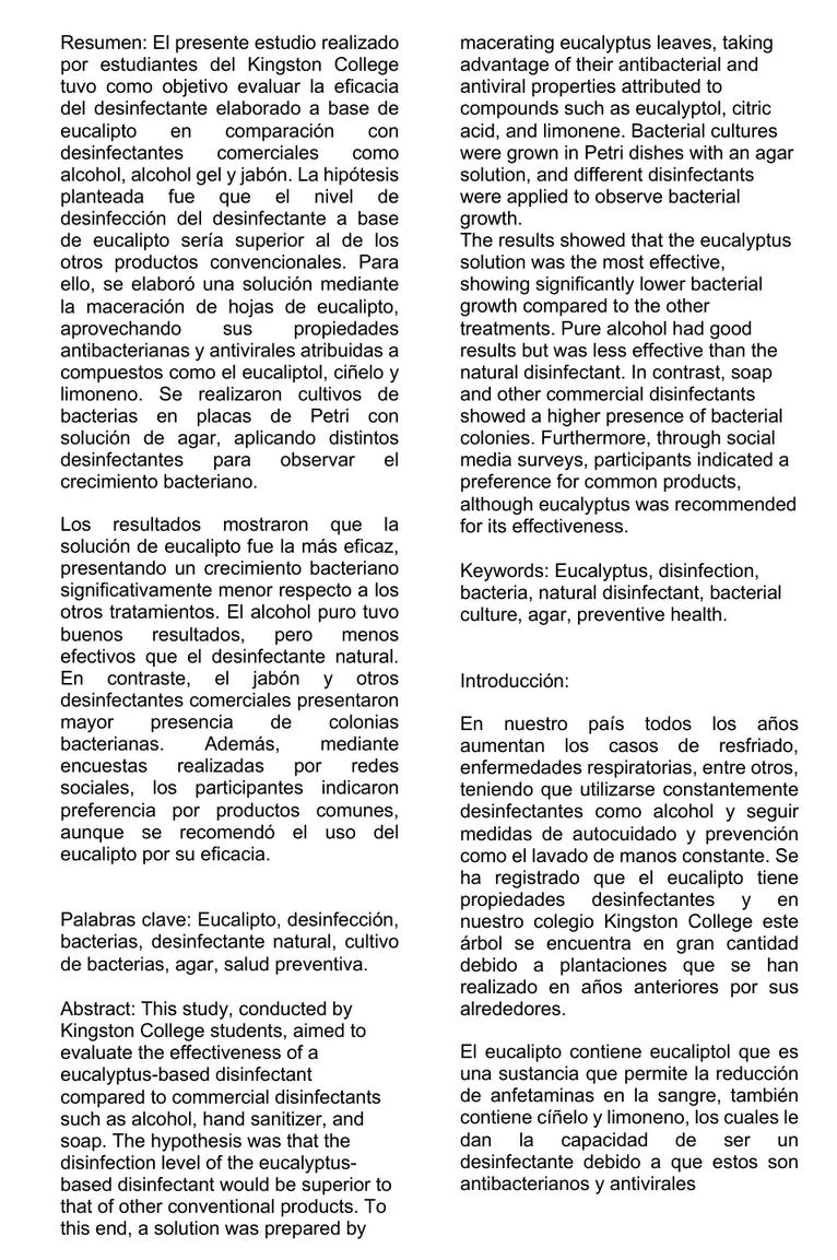 En este artículo científico se analiza el impacto de las plantaciones de eucaliptos sobre la fertilidad del suelo en distintas áreas del colegio Kingston College. Para ello, se llevó a cabo un experimento en el que se comparó el crecimiento de una misma cantidad de plantas de Lens culinaris (lentejas) en dos tipos de suelo: uno proveniente de zonas con eucaliptos y otro de sectores sin su presencia. La hipótesis planteada sugiere que los compuestos alelopáticos liberados por los eucaliptos, junto con su alta absorción de agua, afectan negativamente el desarrollo de las plantas, disminuyendo su crecimiento en comparación con aquellas cultivadas en suelo sin eucaliptos. Tras planificar el experimento y establecer una metodología en conjunto con el equipo de trabajo, se llevó a cabo la siembra y observación de los resultados. Estos mostraron una clara diferencia en el desarrollo de las lentejas: aquellas plantadas en suelo con eucaliptos crecieron menos que las sembradas en suelo control. Los datos obtenidos confirmaron la hipótesis inicial, sugiriendo que los eucaliptos afectan negativamente la fertilidad del suelo. En conclusión, se reafirma que las plantaciones de eucaliptos podrían tener un efecto perjudicial sobre el suelo del colegio, limitando el crecimiento de otras especies vegetales. Este experimento tiene mucha importancia porque sirve para saber como el eucalipto afecta a la tierra del ecosistema alrededor de nuestro colegio.