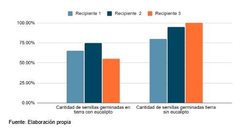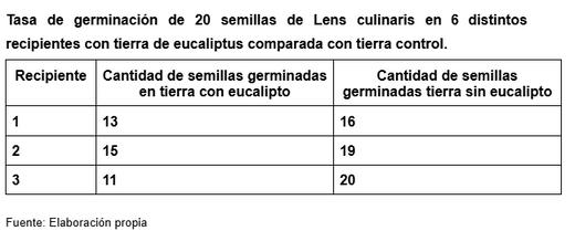Tasa de germinación de 20 semillas de Lens culinaris en 6 distintos recipientes con tierra de eucaliptus comparada con tierra control.