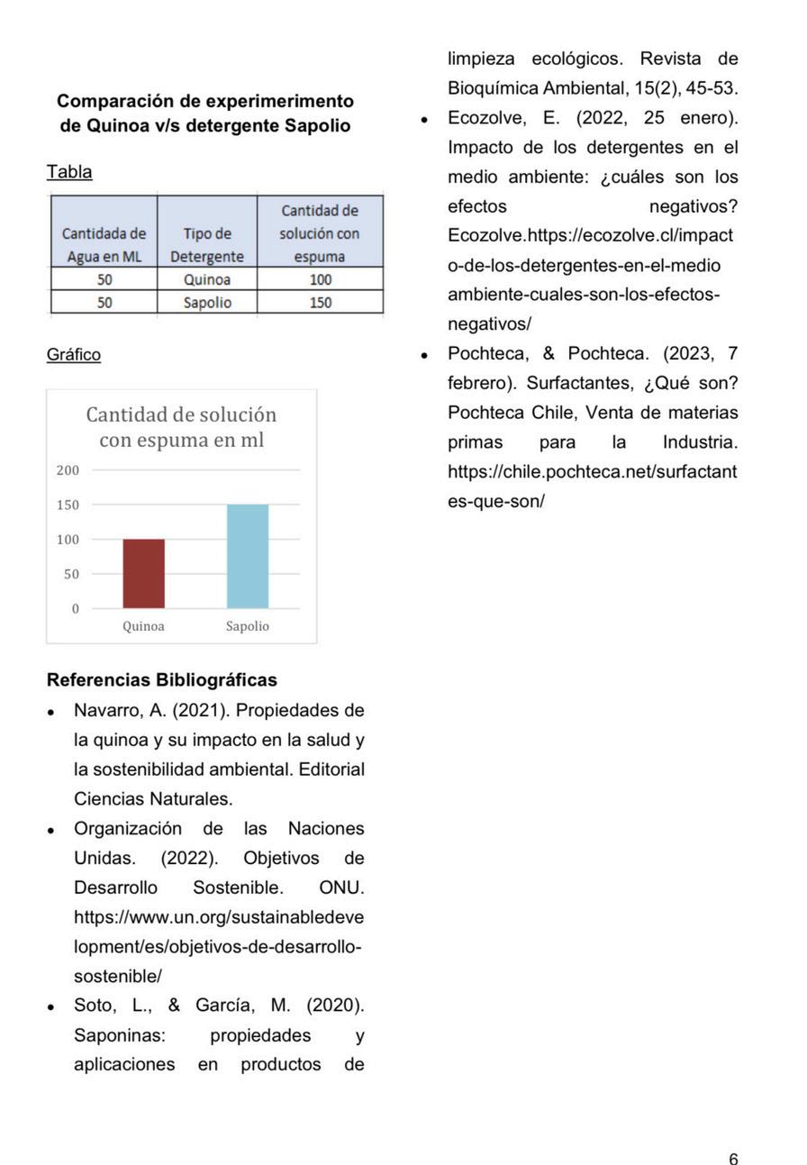 El impacto ambiental de los detergentes convencionales ha llevado a la búsqueda de alternativas ecológicas Las saponinas, compuestos naturales presentes en la quinoa, poseen propiedades espumantes y detergentes que podrían reemplazar a los surfactantes sintéticos Este estudio investiga la eficacia de un detergente a base de saponinas y su potencial para reducir la contaminación del agua. Los detergentes tradicionales contienen componentes sintéticos como fragancias, blanqueadores ópticos y conservantes según: (Comité de Inocuidad de ASOEX, 2016), cuales pueden generar un impacto ambiental negativo debido a su persistencia y toxicidad afectando la calidad del agua y la salud de los ecosistemas (Ariet, 2025). Frente a esto, los detergentes biodegradables surgen como una alternativa más sostenible, ya que poseen biodegrabilidad, es decir, la capacidad de descomponerse rápidamente sin dejar residuos dañinos (Plastic Ocean Internacional, 2020) Un componente clave en estos productos son los surfactantes, sustancias que reducen la tensión superficial del agua y facilitan la limpieza (Pochteca Chile, 2023) A diferencia de los surfactantes sintéticos, algunos detergentes ecológicos emplean saponinas, compuestos naturales con propiedades espumantes y detergentes presentes en diversas plantas (Chen et al, 2010) Un ejemplo de esto es la cáscara de quinoa, una fuente rica en saponinas