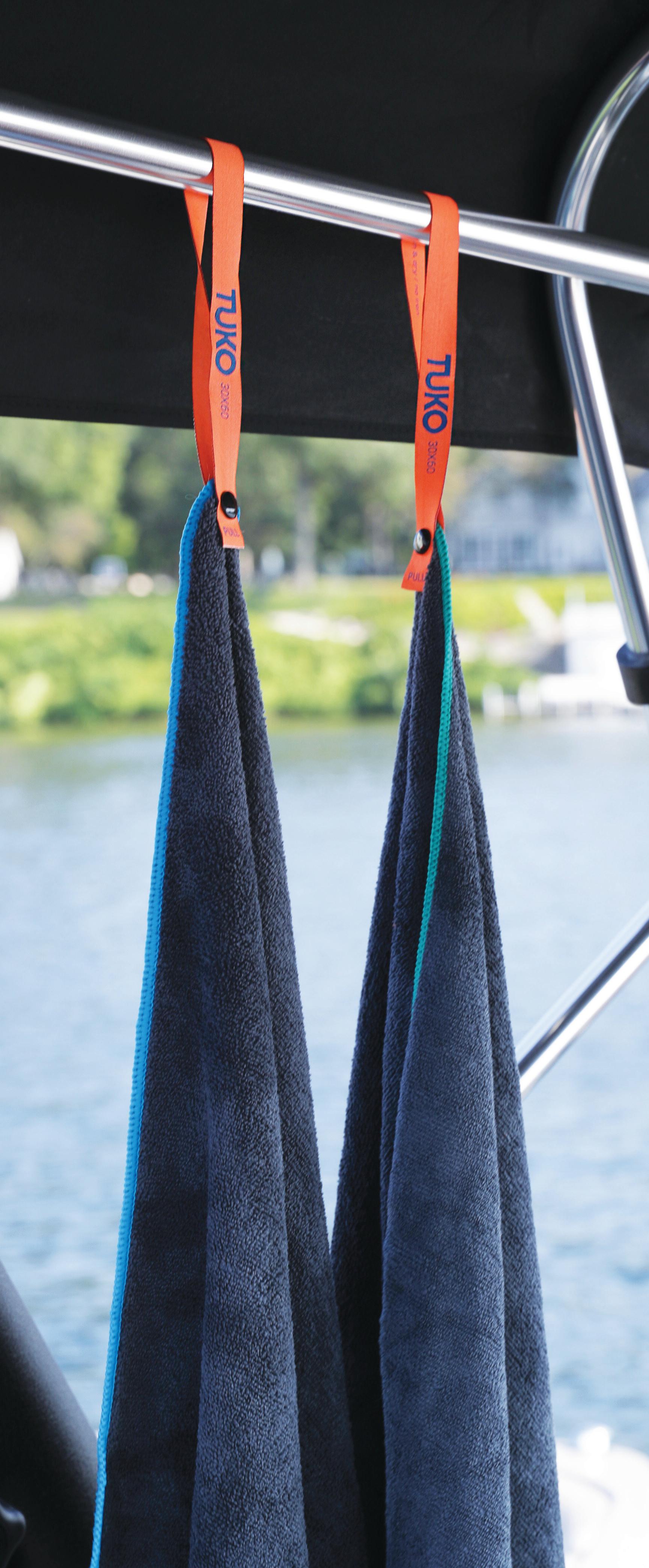 TUKO is cut from premium microfiber that absorbs more and drys (way) quicker. The integrated strap serves double duty: hang the towel from anywhere, or use it to roll TUKO tight.