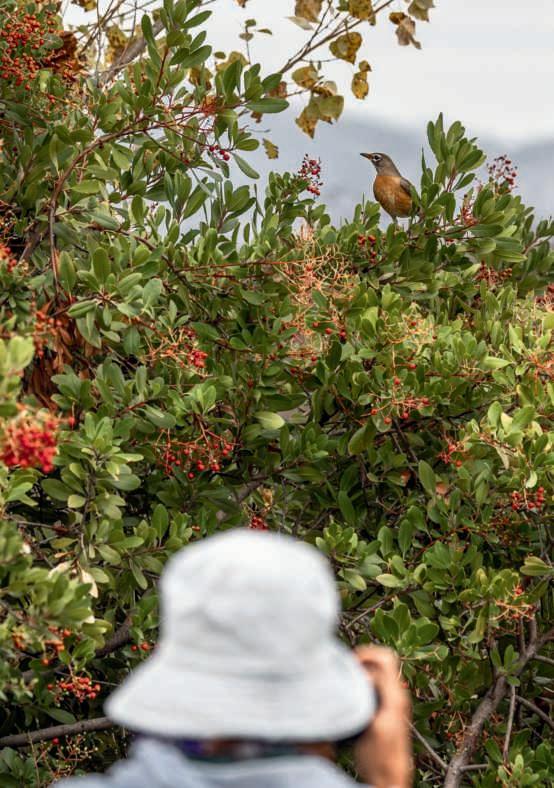 Clockwise from top right: A yellow-breasted Chat; a Least Bell’s Vireo; a birder photographing an American Robin.