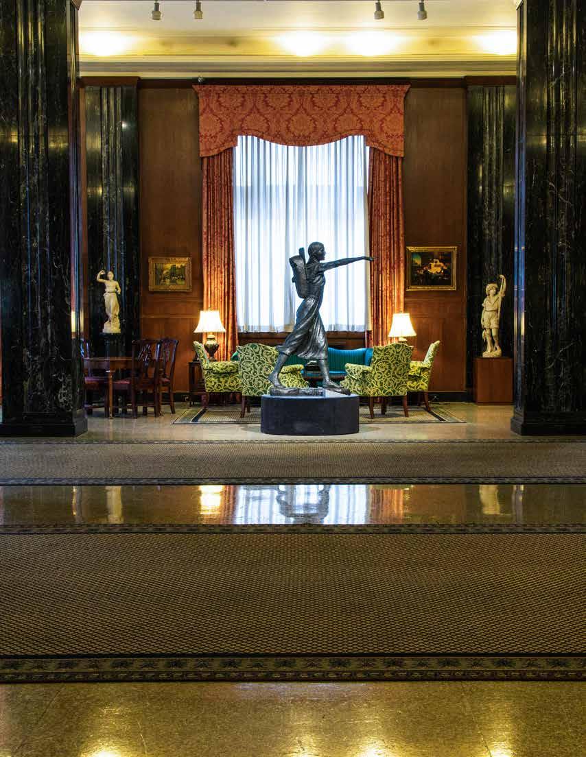 This multi-functional space is filled with a selection of paintings and sculptures from the Missouri Athletic Club’s $3 million private art collection. Removable ornate rugs overlay a marble floor, which leads to a marble fireplace. Large windows introduce natural light and a street view of downtown St. Louis. Intimate removable seating is scattered throughout.