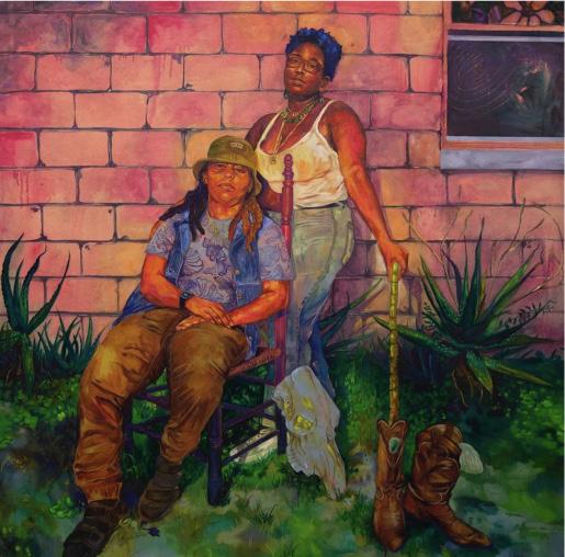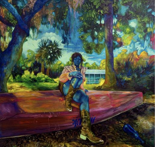 Sheherazade Thenard was born in Queens, New York, and now lives and works in Miami, Florida. Their vibrant portraits are unique and eye-catching, drawing inspiration from Black feminist media as well as Afro-Caribbean symbolism and spiritual practices. Thenard’s work often explores their family’s assimilation between Martinique and the United States, their experiences as a Black queer artist in the American South, and their personal and familial interactions with colonialism, “To me this is important because we are a part of a bigger story, a story that defines not only who we are, but one that allows us to redefine what we could become.”. Nature and plants are significant motifs in their paintings, often as an environment housing Black figures, “Nature serves as a symbol that dually suggest entrapment and sanctuary from societal pressures. In older work I explore these ideas with figures at ease and are lost in thought as a form of escapism.”.