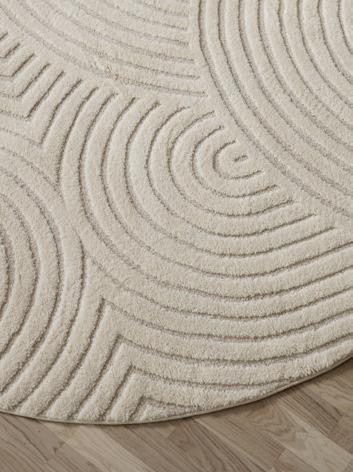 DEVINE er et moderne, mykt og lunt teppe med et dekorativt buemønster. Det er lofritt og enkelt å vedlikeholde.