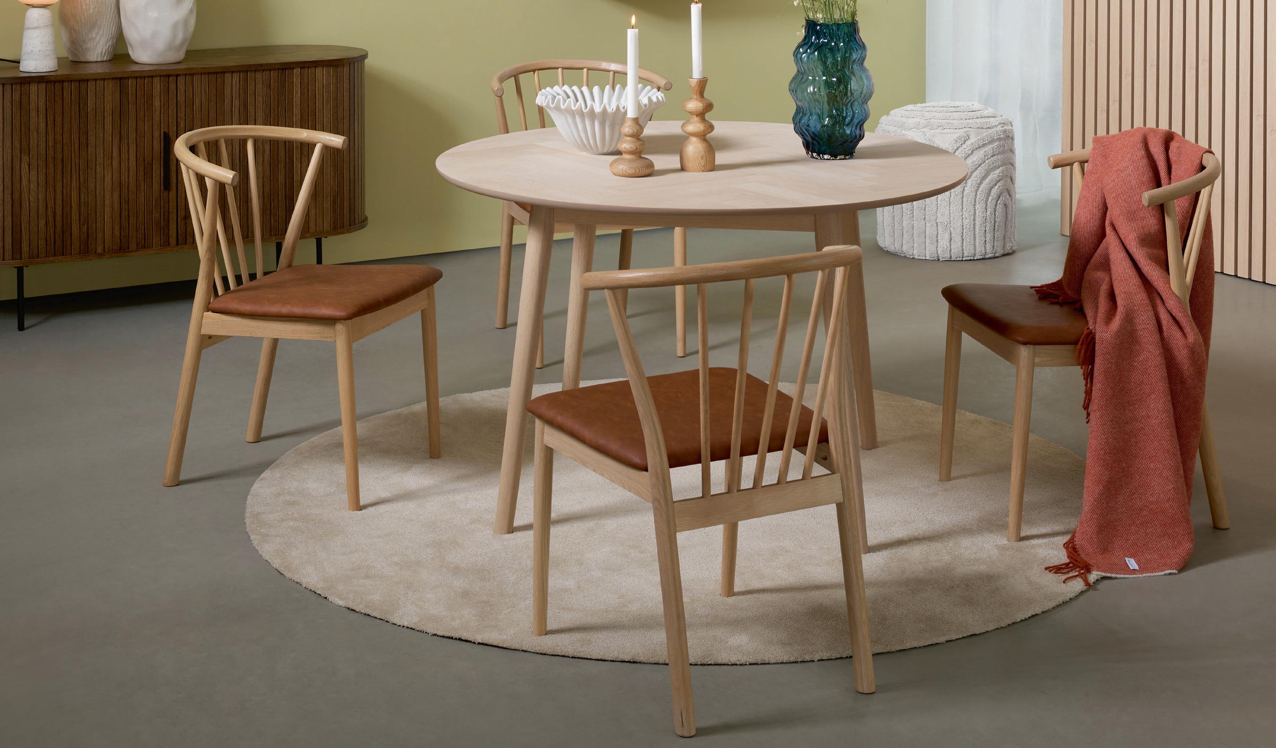 SAGENE spisegruppe med 4 stk. EMIL spisestol NÅ 11.195,- (før 17.995,-) Nr. 288059 SAGENE rundt spisebord i hvitoljet lakkert eikefinèr inkl. 2 ileggsplater Ø 130/230, H 74 cm NÅ 7.199,- (før 11.999,-) Nr. 273507 EMIL spisestol i belfast beige med ben i hvitoljet eik NÅ 999,- (før 1.499,-) Nr. 285107 BENTLEY teppe viscose orange 160x230 cm NÅ 3.179,- (før 5.299,-) Nr. 277674