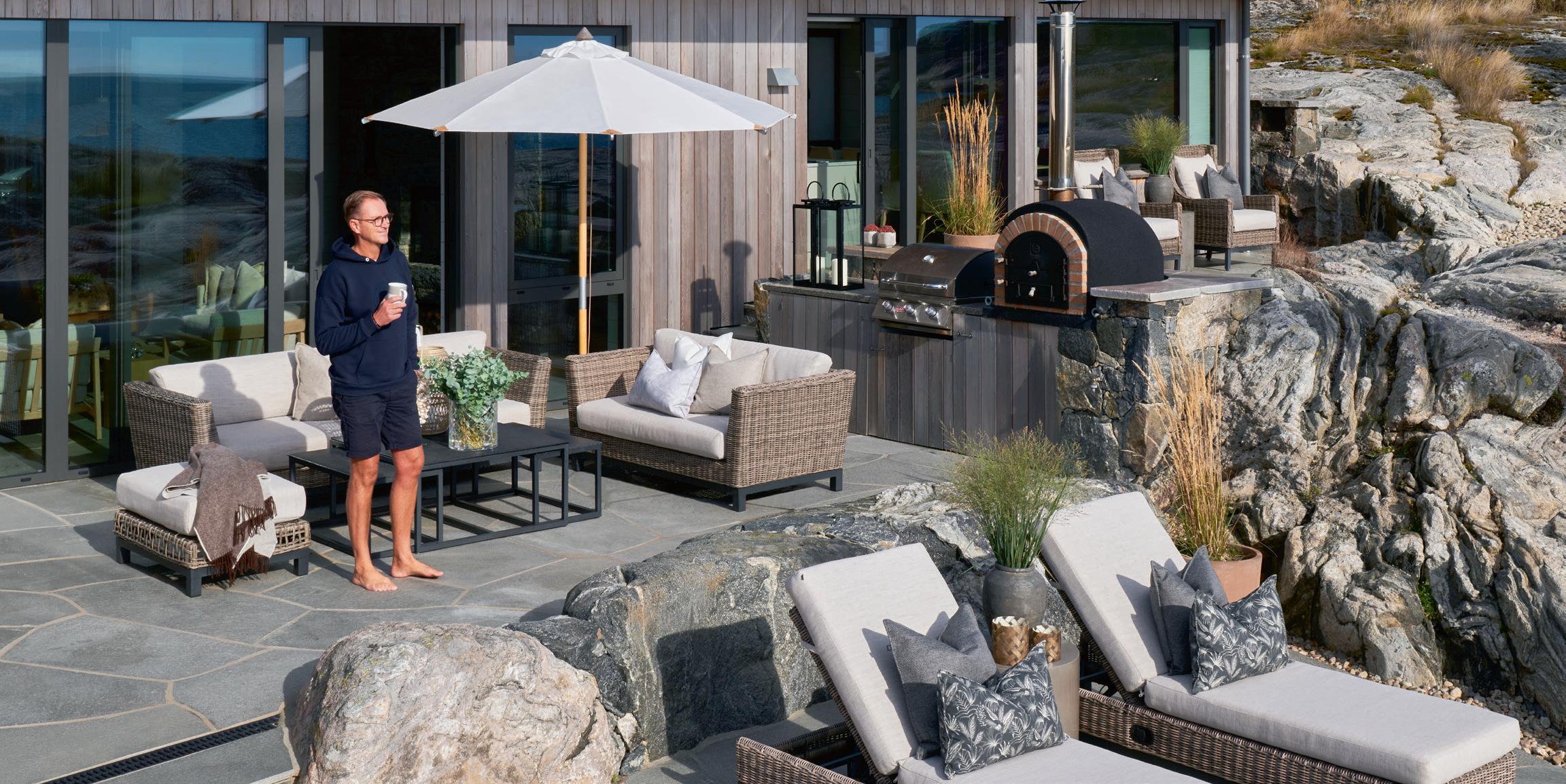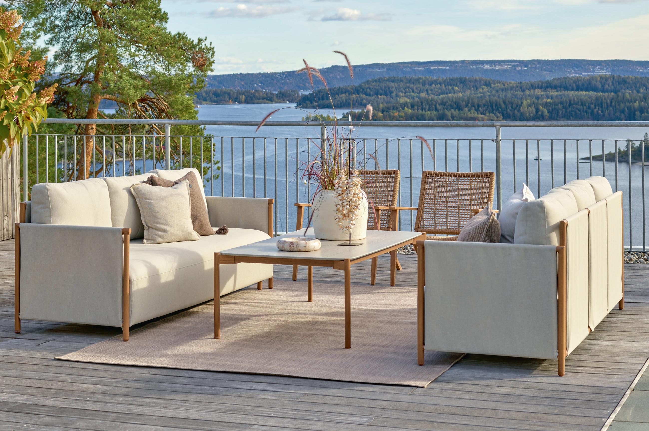Linea er en fleksibel utesofa som kan monteres som hjørnesofa eller som to 3-setere. Trekket på arm- og rygglener kan tas av, eller beholdes på for et mer moderne, strammere uttrykk.