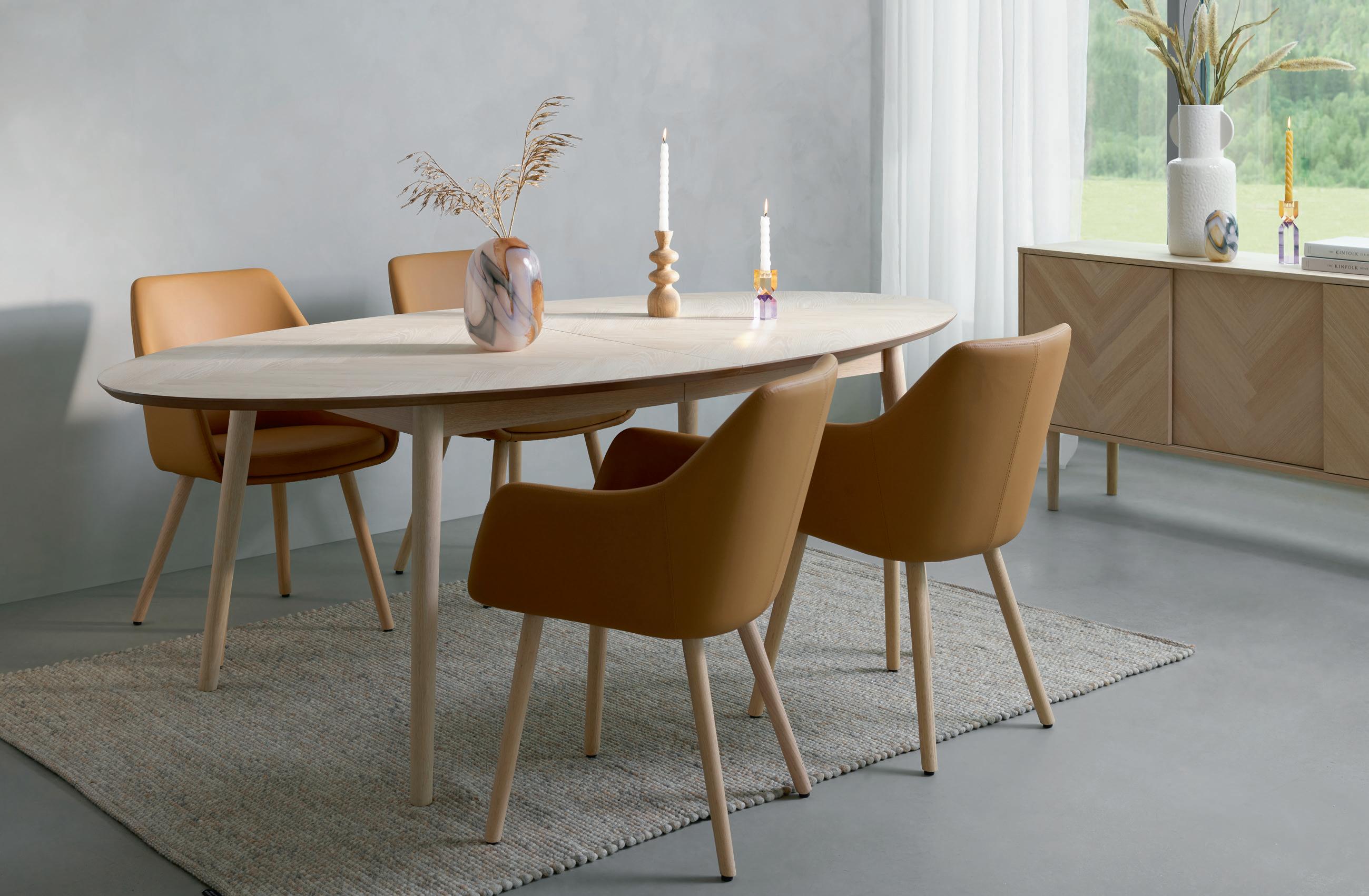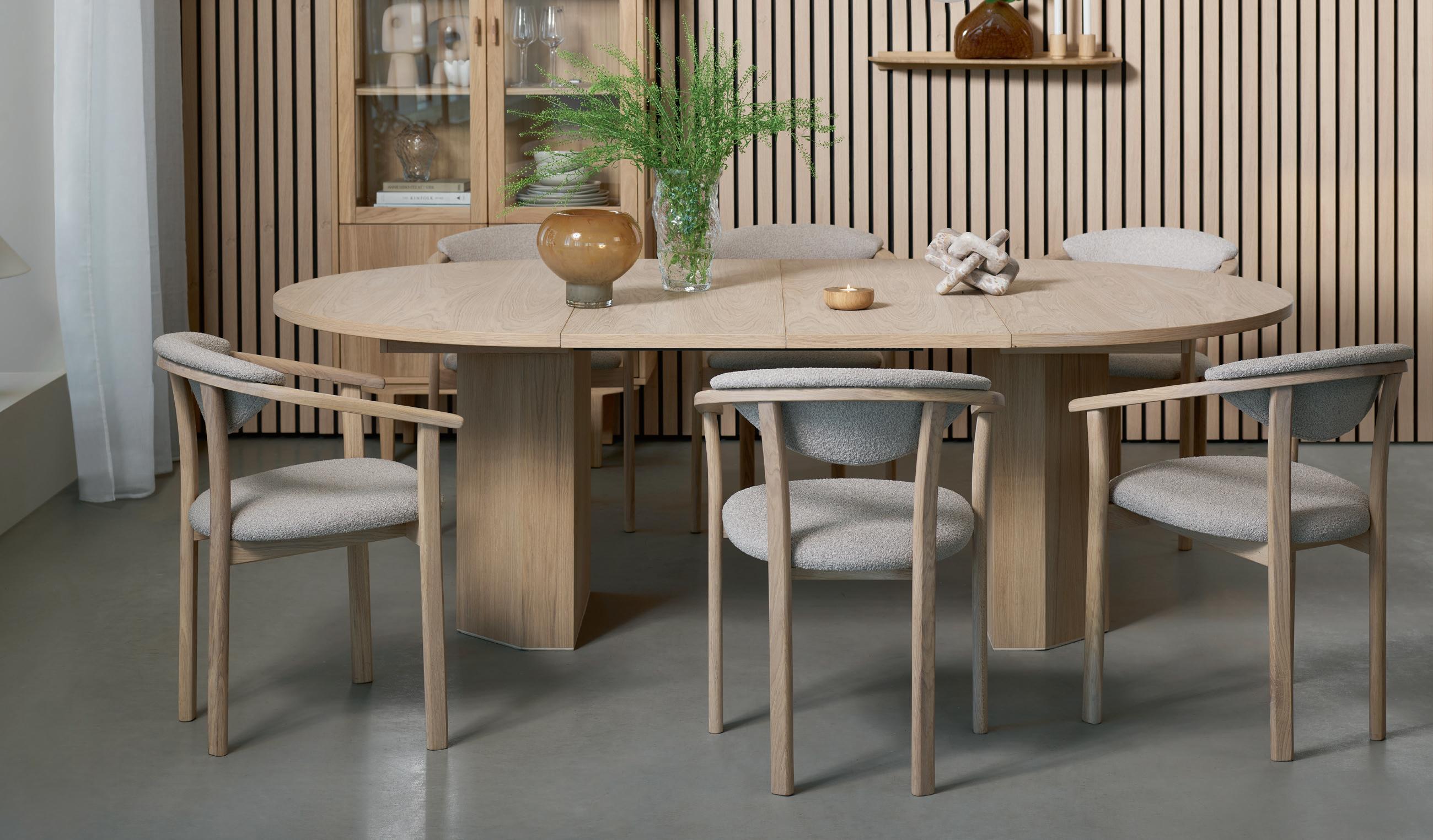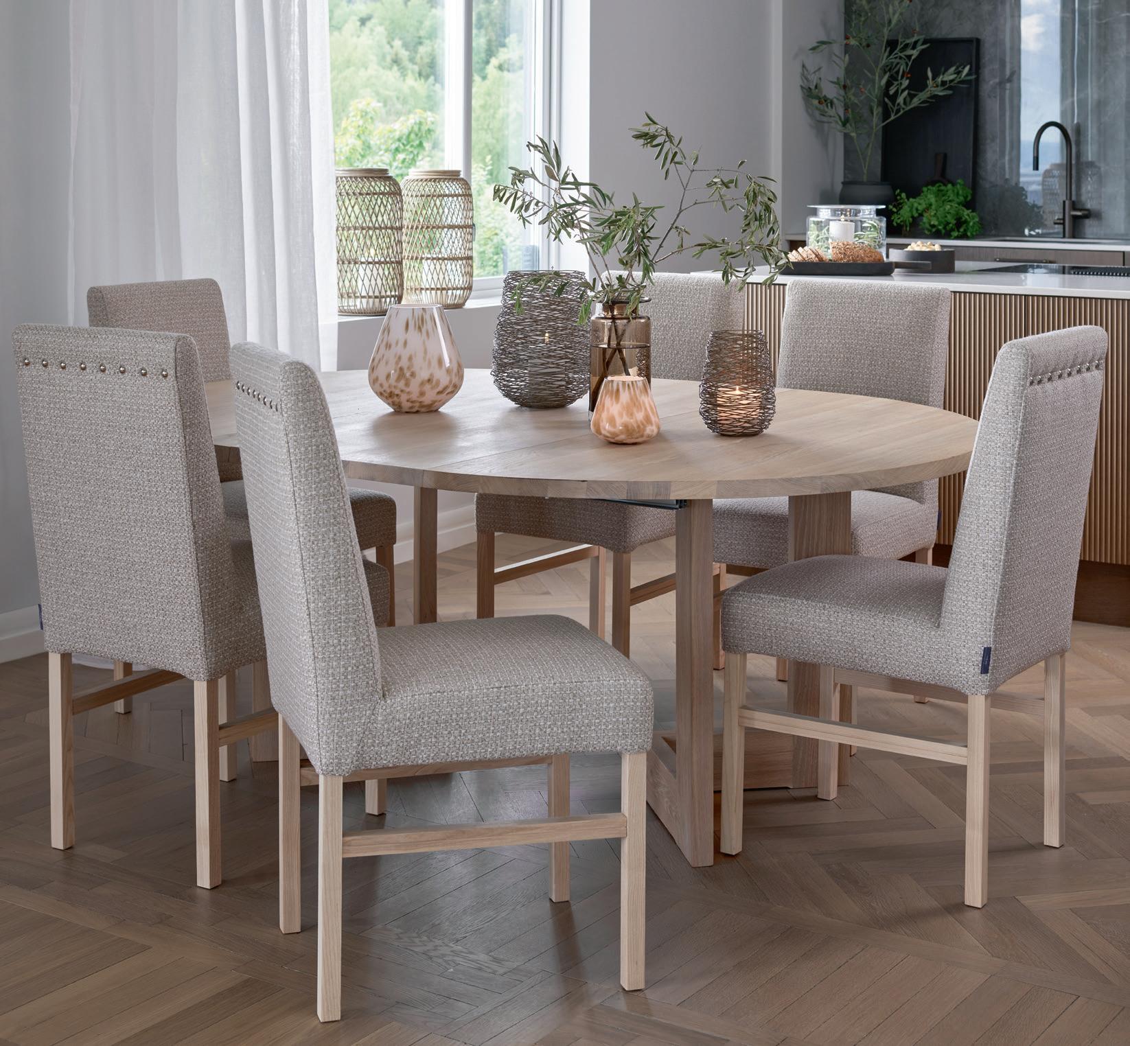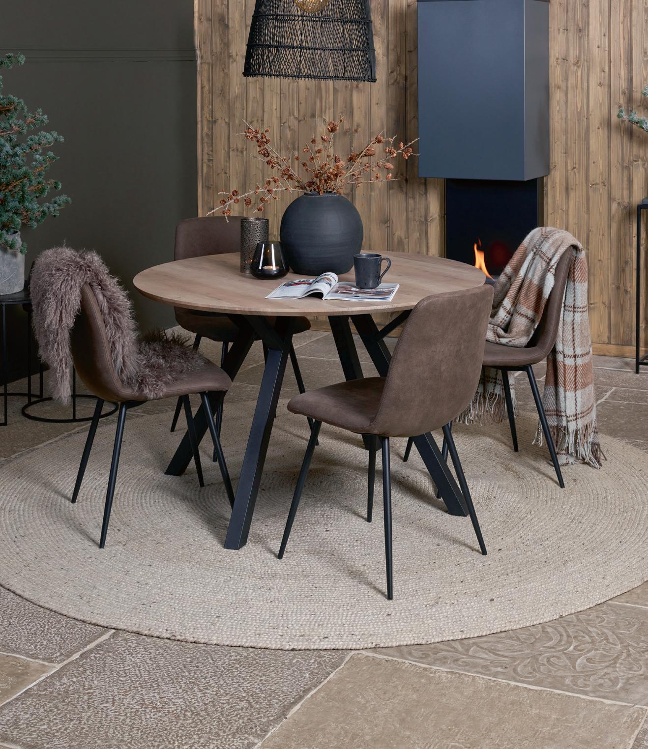 VIKA rundt spisebord i brun lakkert eikefiner inkludert 2 ileggsplater med svarte metallben Ø 120, H 75 cm NÅ 5.999,- (før 9.999,-) Nr. 290641 ALICE spisestol med sving i Alpine Boucle NÅ 1.499,- (før 1.999,-) ved kjøp av minst 4 stk. spisestoler Nr. 284675 KLEBER rundt teppe ull koksgrå Ø 240 cm 7.999,- Nr. 285140