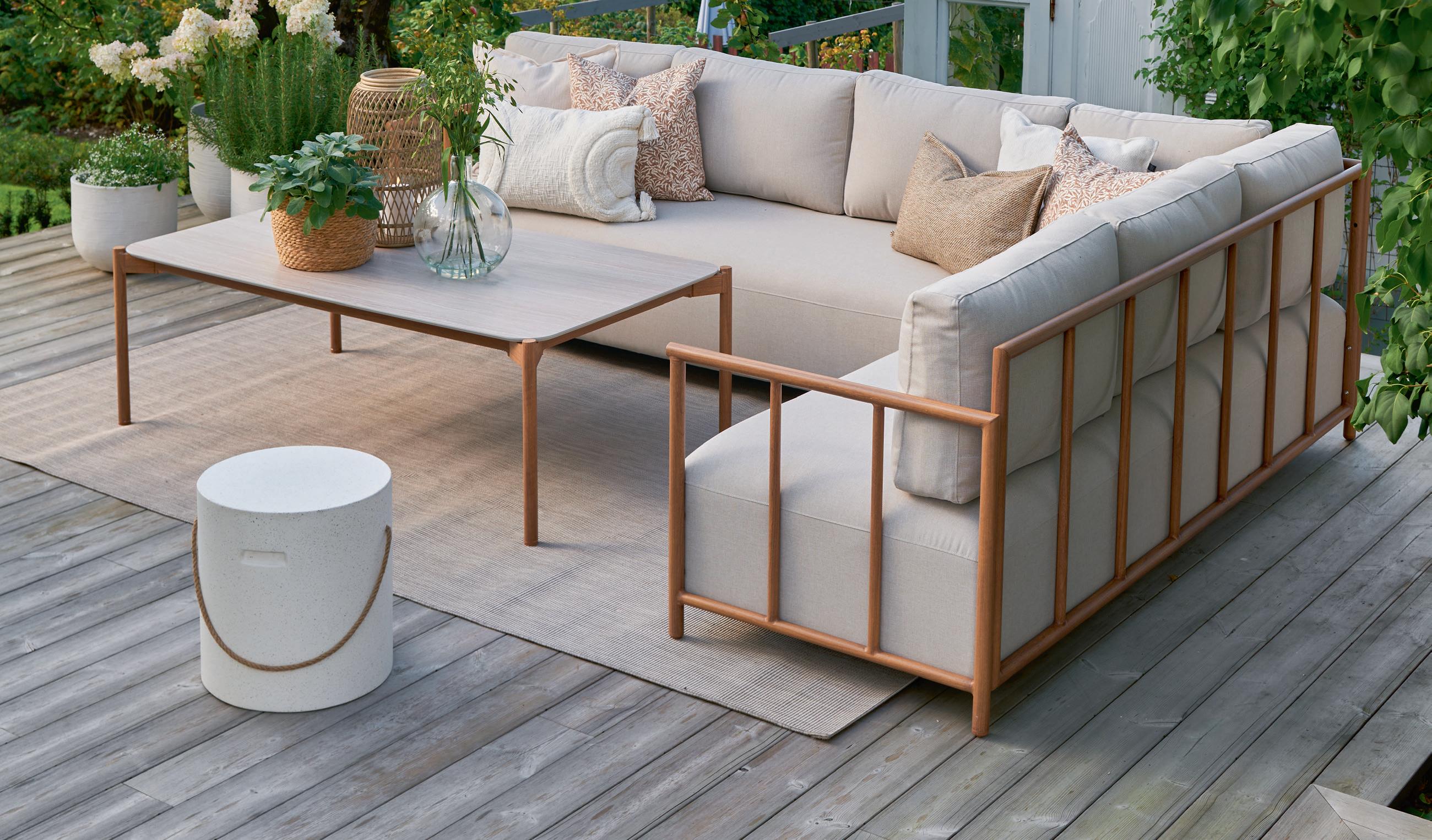 LINEA hjørnesofa i teakfoliert aluminium, beige vannavvisende puter i polyester 203x225, H 74 cm NÅ 18.999,- (før 22.999,-) Nr. 289172 LINEA sofabord i teakfoliert aluminium 80x140, H 60 cm 4.499,- Nr. 289171 RUTH loungestol med teakfoliert ramme, kunstrotting beige 66x79, H 77 cm 2.499,- Nr. 289173