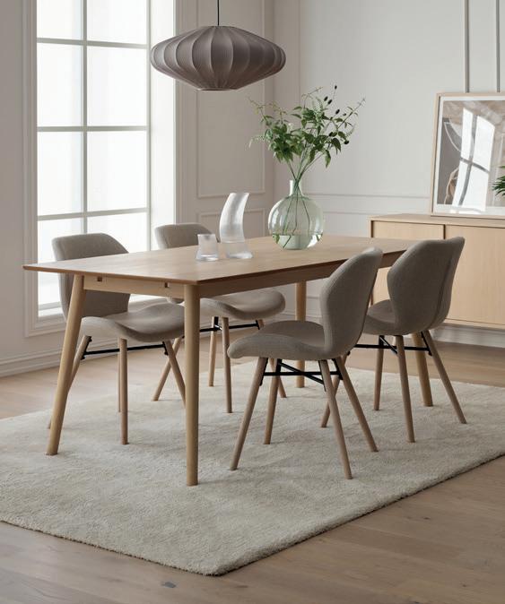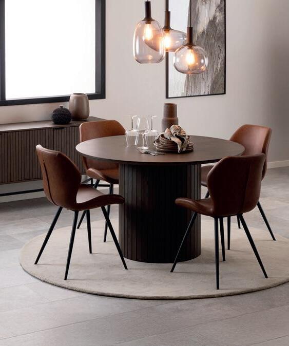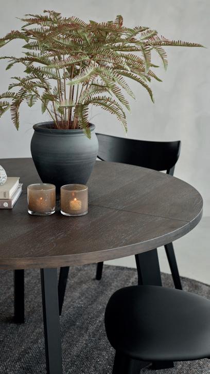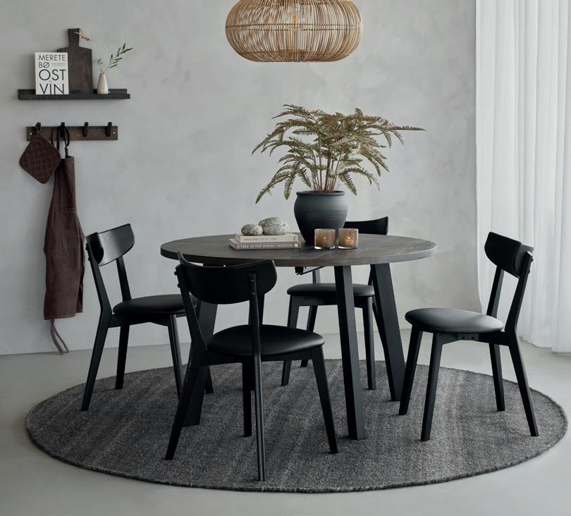 SAGENE rundt spisebord i svart ask finer inkludert 2 ileggsplater med ben i heltre svart Ø 110 cm NÅ 6.499,- (før 10.849,-) Nr. 284137 STELLA spisestol velur antrasitt med svarte stålben NÅ 999,- (før 1.399,-) Nr. 283879