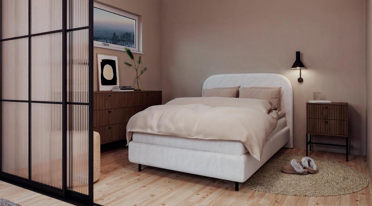 ZEN LISBOA seng med gavl i Fabian Creme med Basic Pluss overmadrass og ben i brun eik 19 cm 120x200 cm 9.999,- Nr. 308566 VINSTRA nattbord med 2 skuffer i melamin, røykfarget med svart understell 1.499,- Nr. 298399 VINSTRA kommode med 6 skuffer i melamin, røykfarget med svart understell 158x40 H80.4 cm 3.999,- Nr. 298406 VINSTRA leveres også i lys eik, se bohus.no