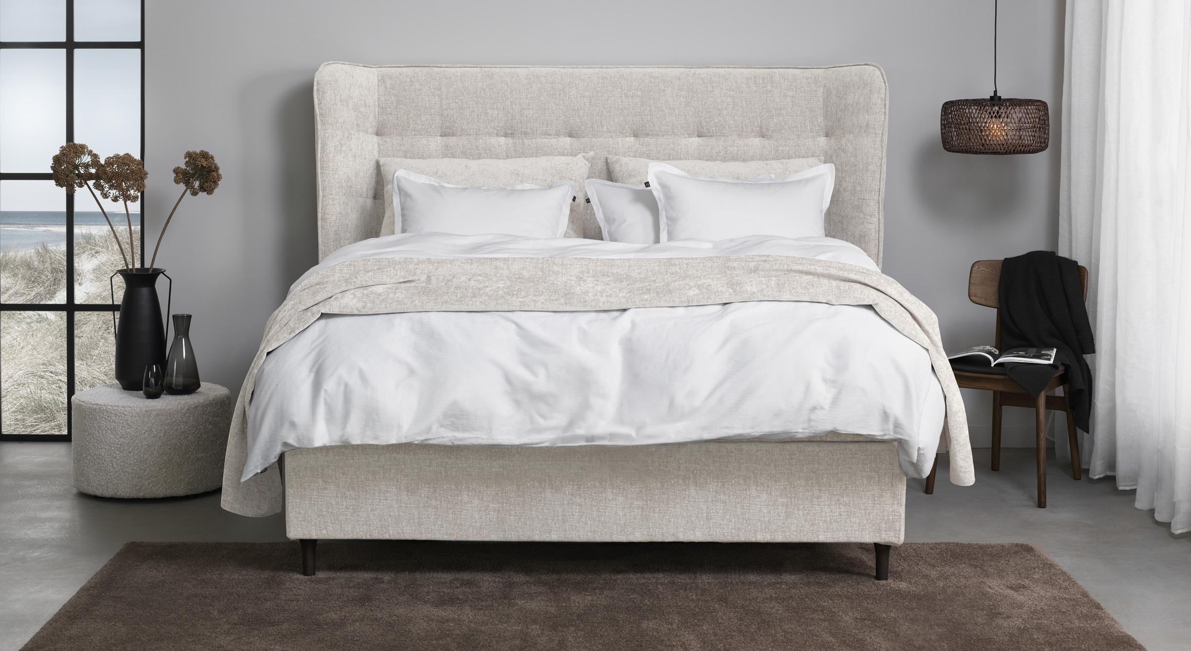 kontinentalseng i Gina Creme med SCS 1 overmadrass og ben hvitoljet 14 cm, 150x200 cm NÅ 9.999,- (før 16.999,-) Nr. 306243 SCS HITRA sengegavl med knapper i Gina Creme, til seng 150 cm NÅ 4.124,- (før 5.499,-) Nr. 306390