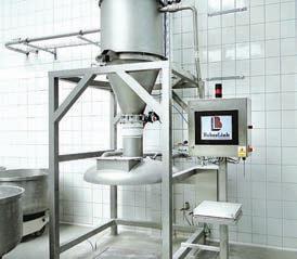 stanowiska przygotowania ciast z systemem receptur BakerLink Stanowiska przygotowania ciast połączone z instalacją silosową wyposażone w kosz zasypowy mąki, dotykowy panel z recepturami, wagę najazdową, wagę stołową do ważenia mikroskładników oraz dozownik wody.