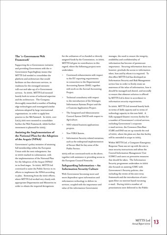 manages, the need to ensure the integrity, availability and confidentiality of information has become of paramount importance. Securing information does not, however, preclude the access to information when, how and by whom it is required. To this effect MITTS Ltd has developed an Information Security and Risk Management service line in order to firstly create an awareness of the value of information, how it should be managed and shared, and secondly to ensure that whatever solution is offered by MITTS Ltd is done in accordance to information security requirements. In 2002, MITTS Ltd invested heavily both in terms of skills capacity and in terms of technology capacity in this new field. A fully equipped disaster recovery facility for a number of Government’s critical services, including Government’s corporate e-mail services, the Common Data Base (CdB) and DAS was set up towards the end of 2002, where the plans are that this facility will be extended in scope in 2003. Within MITTS Ltd, a Computer Emergency Response Team was set-up with the aim to issue security instructions and advise the Central Information Management Unit (CIMU) and users on preventive measures that should be taken. The Information Security programme undertaken in 2002 also focused on assisting CIMU with Government’s Security policies, also including the review of the anti-virus framework and the introduction of antispam filter on internet based incoming e-mail. During 2002 a number of presentations were delivered to the Public