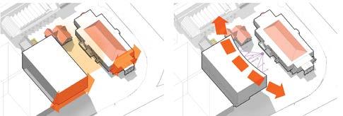 Keeping the new frontage building on the same street level to maintain the scale and harmony. Creating new spaces in between the heritage and the new theatre building.
