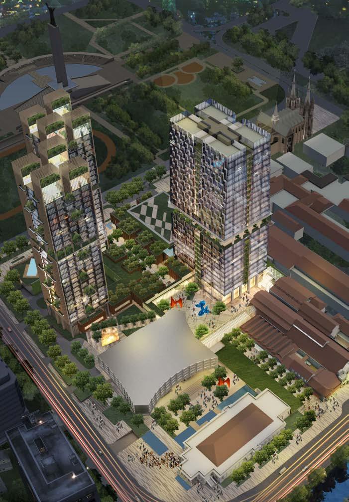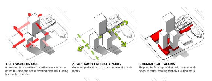 Connecting Nodes Generates pedestrian paths between development. Human Scale Facades Shaping podium frontages on the human scale create a harmonious heritage district.