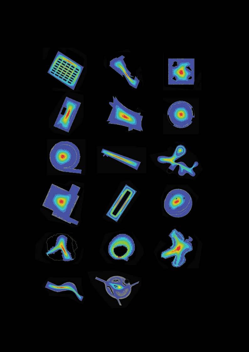 Agent analysis A.I Space Syntax. The analysis shows the character of each pavilion in a response to creating user behaviour patterns. This is also related to the hotspot area, which is denser by the user occupying space. The hotter colour indicates that the high-intensity numbers of A.I pass the space than the cooler space which has less A.I movement.