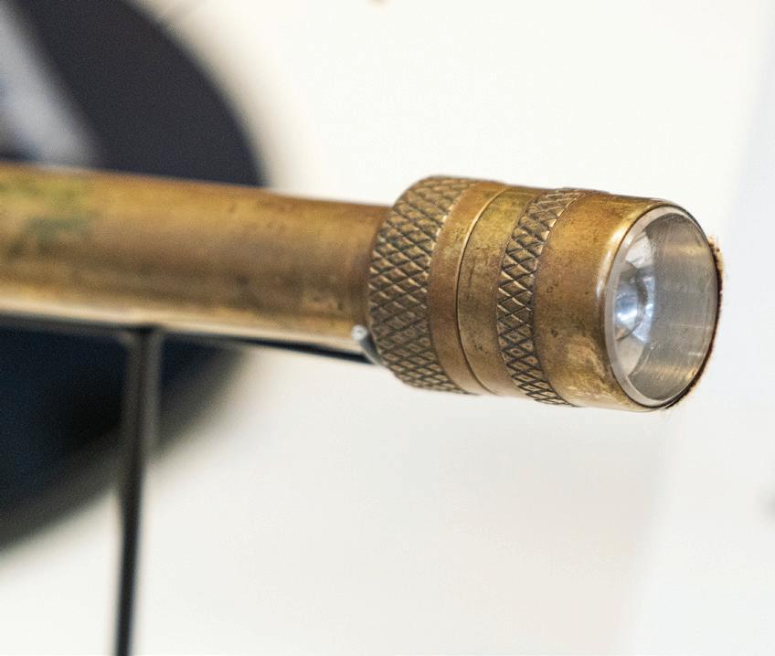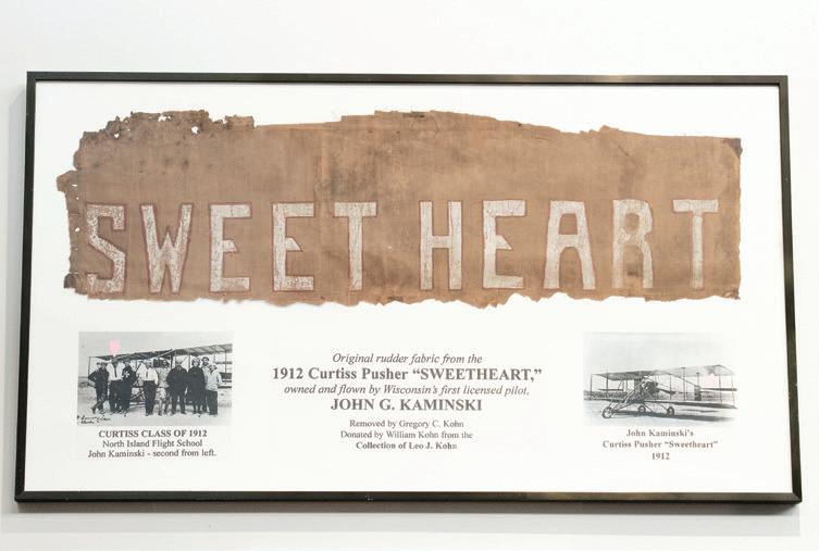 Framed here is a piece of rudder fabric from Sweetheart, a 1912 Curtiss Pusher plane owned and flown by John G. Kaminski (18931960), who became Wisconsin’s first licensed pilot when he was just 18. He earned the qualification, in part, by flying two sets of figure eights. Just down the hall from the museum is a replica of a similar Curtiss Pusher, hanging from the ceiling above the information desk.