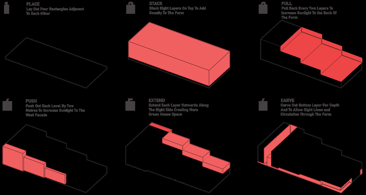 Our fourth year studio project hybridized housing with vertical farming as a way to incorporate sustainable agriculture production with urban housing planning. The integration of greenhouse systems using water recycling, rainwater and solar collection would enable our design to reduce its carbon footprint.