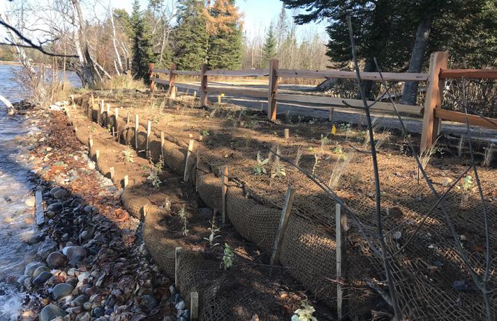 With the help of generous donors and hard-working volunteers, the Watershed Council recently completed two bioengineering projects designed to restore shoreline function at Camp Pet-O-Se-Ga in Alanson and Tourist Park in East Jordan. Using natural materials including more than 650 native plants, coir (coconut fiber) logs, and fieldstone, this approach is friendlier to birds, fish, turtles, amphibians, and the health of the lake than installing a seawall. The new shorelines, fortified with plants and fieldstone, will provide erosion control while remaining flexible to lake level changes and weather conditions. Over time, as it settles into balance with the lake, the fieldstone will collect sand and organic material between the small spaces. Plants will then begin creeping lake-ward to re-establish the necessary root system for stability.