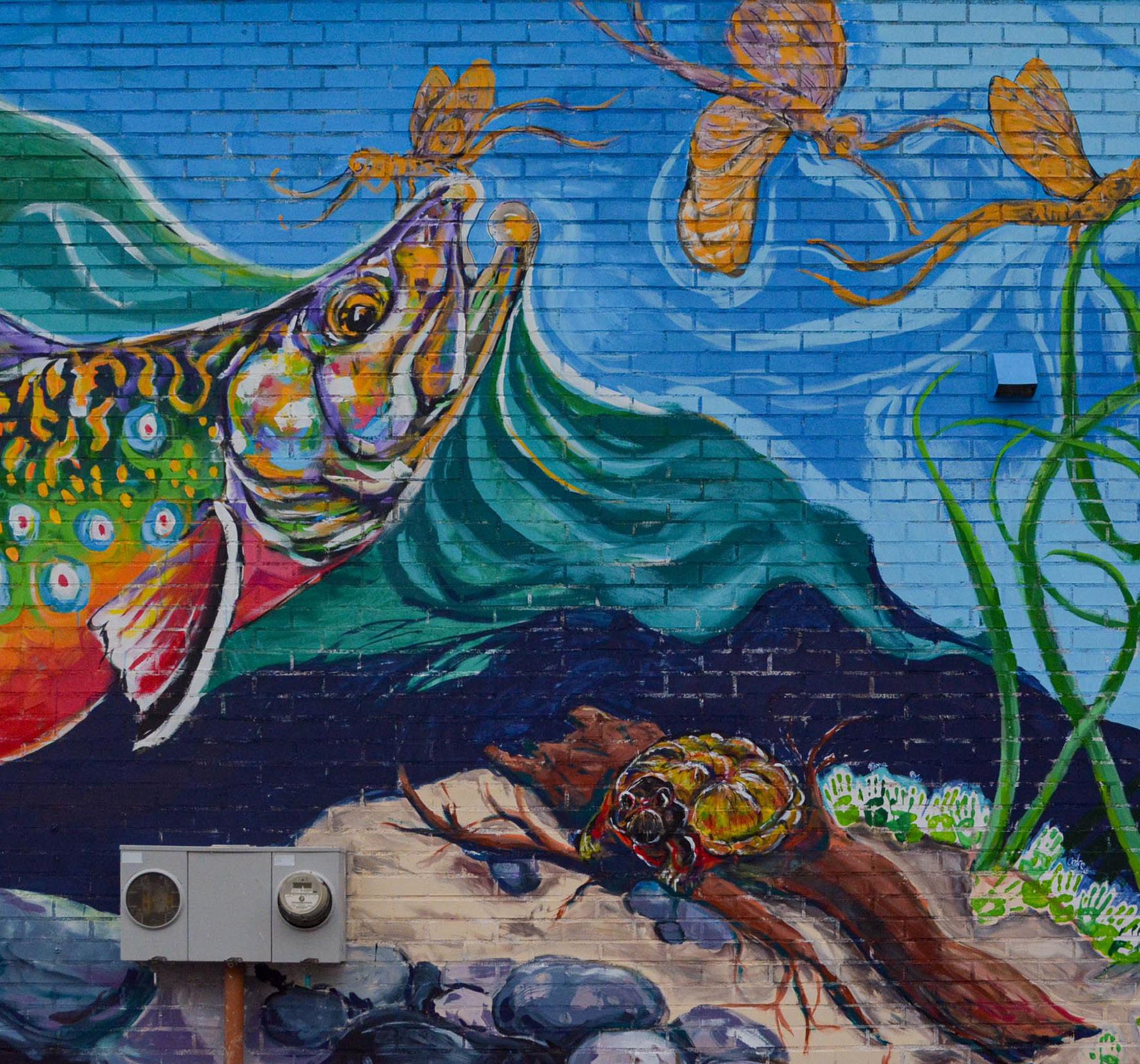 Michigan artist Sarah Landstrom brought the mural to life with her distinctive style, characterized by vivid colors and fluid brushstrokes, depicting twenty native Michigan species — each with a QR code that can be scanned with your phone