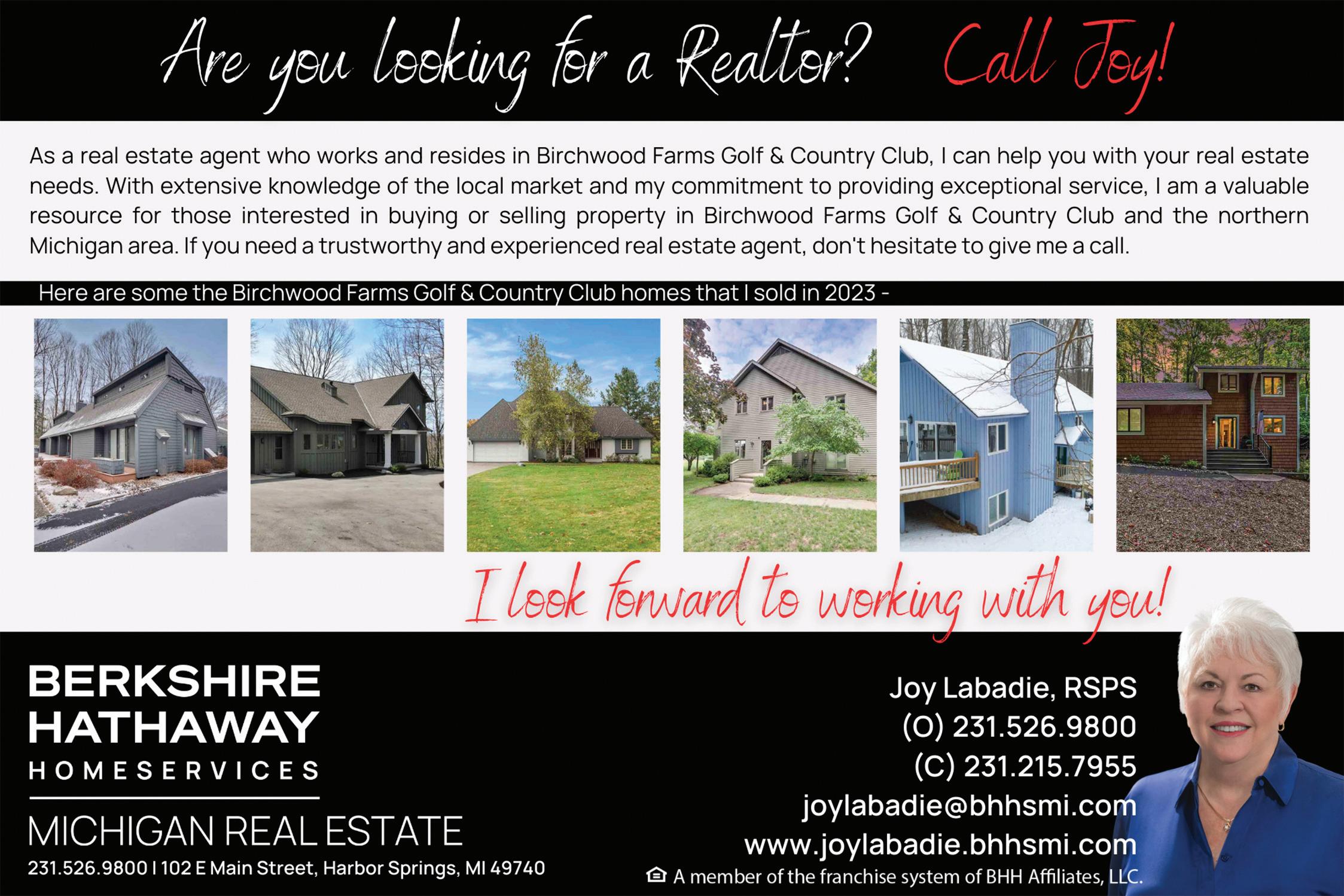 great room, large partially covered deck, and 4 car attached garage. $1,575,000 FLAT BUILDING SITE OPPORTUNITY Nice flat building site in Birchwood Farms with views of meadows and horse farm. Purchase includes all Birchwood Amenities which include 27 holes of golf, club house with dining and fitness center, heated outdoor pool, tennis, pickle ball, bocce ball, wintertime snow shoeing and x-country skiing. $5,000 Sandra Gay, Realtor Berkshire Hathaway Home Services 102 East Main Street Harbor Springs, MI 49740 231.526.9800 231.622.2682 ident” Specialist wood Buyers & Sellers NEW CONSTRUCTION 60-day occupancy Ranch-style Birchwood Home, on a beautiful golf course setting. 3 bedrooms (en-suites), 1st-floor master, study that could double as a fourth bedroom. 3-car insulated and finished garage w/custom garage doors. The lower level basement is plumbed for a future bathroom. $867,500 PRIVATE BUILDING SITE Private, wooded, building site with potential for a walk out lower level. Easy walk to Birchwood Farms Golf & Country Club's clubhouse, golf & tennis courts and swimming pool. $1 UNDER CONTRACT GOLF COURSE LOT Great sunny, golf course building site looking over the 6th fairway of Birchwood's Farm course. Unencumbered with trees to remove for building envelope. Enjoy all of Birchwood Farms Golf & Country Club's amenities. $1 Exceptional Land Values, Wooded, Waterview and Golf Course Lots Available. Call for details!