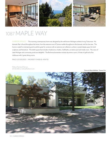1087 MAPLE WAY HARBOR SPRINGS • This stunning contemporary home was designed by the well-known Michigan architect Irving Tobocman. His dramatic flair is found throughout the home, from the extensive use of Carrera marble throughout to the dramatic and fun bar area. This home is made for entertaining and would be great for someone with an extensive art collection, as there is ample display space for both sculptures and framed art. The 8,893 square feet includes 4 bedrooms, 4 baths, 2 half baths, an indoor pool and media room. The views of Lake Michigan and community ponds are delightful. The Birchwood amenities include clay tennis courts, 27 holes of golf and a fine clubhouse with 2 great dining rooms. PRICE: $1,500,000 | PROPERTY/WEB ID: 434710