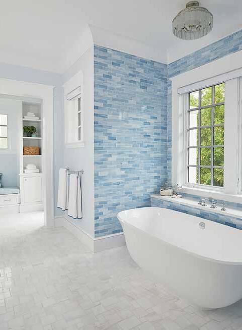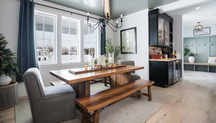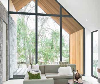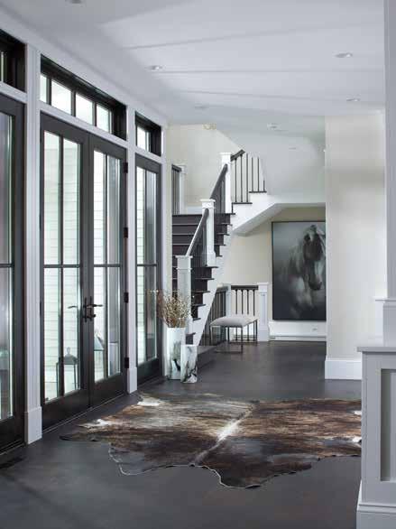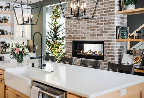 To maintain a sense of separation without committing to a fully open layout, Kelly incorporated a floor-to-ceiling dual-sided fireplace to subtly define kitchen and great room. The fireplace features brick in softly varied neutralbrown tones, complemented by warm gray grout, creating texture and visual interest without overpowering the space. “The fireplace warms up the kitchen on chilly mornings which is especially welcome on snowy days,” Kelly added.