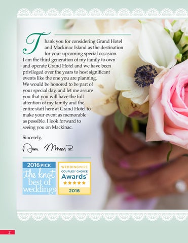 hank you for considering Grand Hotel and Mackinac Island as the destination for your upcoming special occasion. I am the third generation of my family to own and operate Grand Hotel and we have been privileged over the years to host significant events like the one you are planning. We would be honored to be part of your special day, and let me assure you that you will have the full attention of my family and the entire staff here at Grand Hotel to make your event as memorable as possible. I look forward to seeing you on Mackinac. Sincerely,